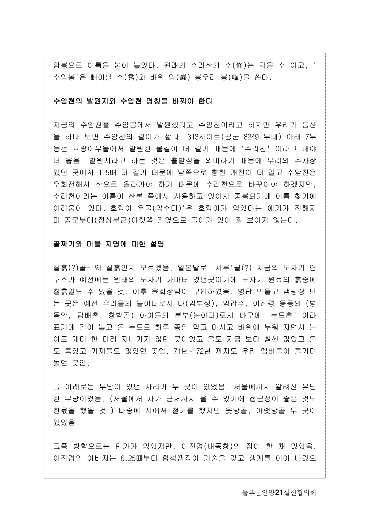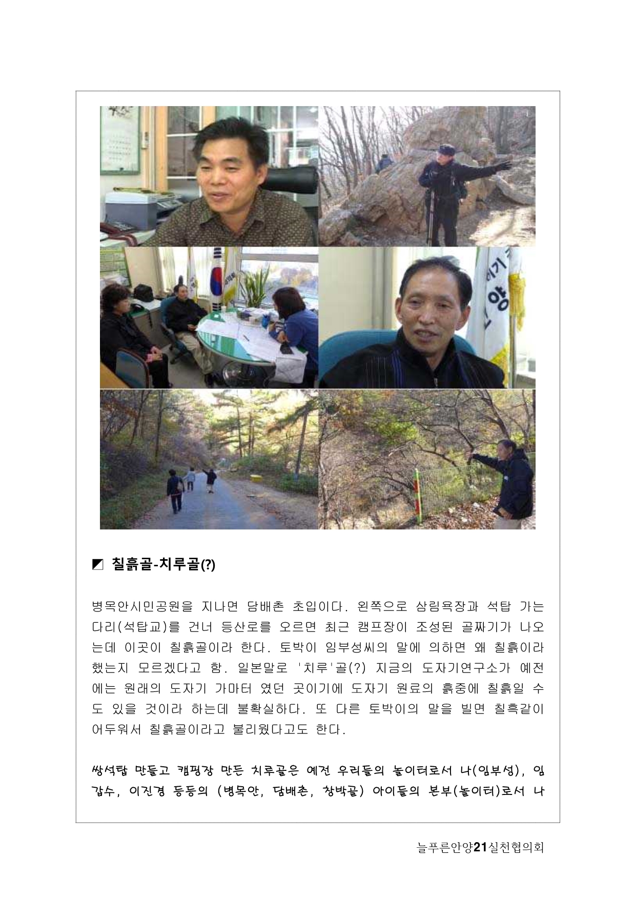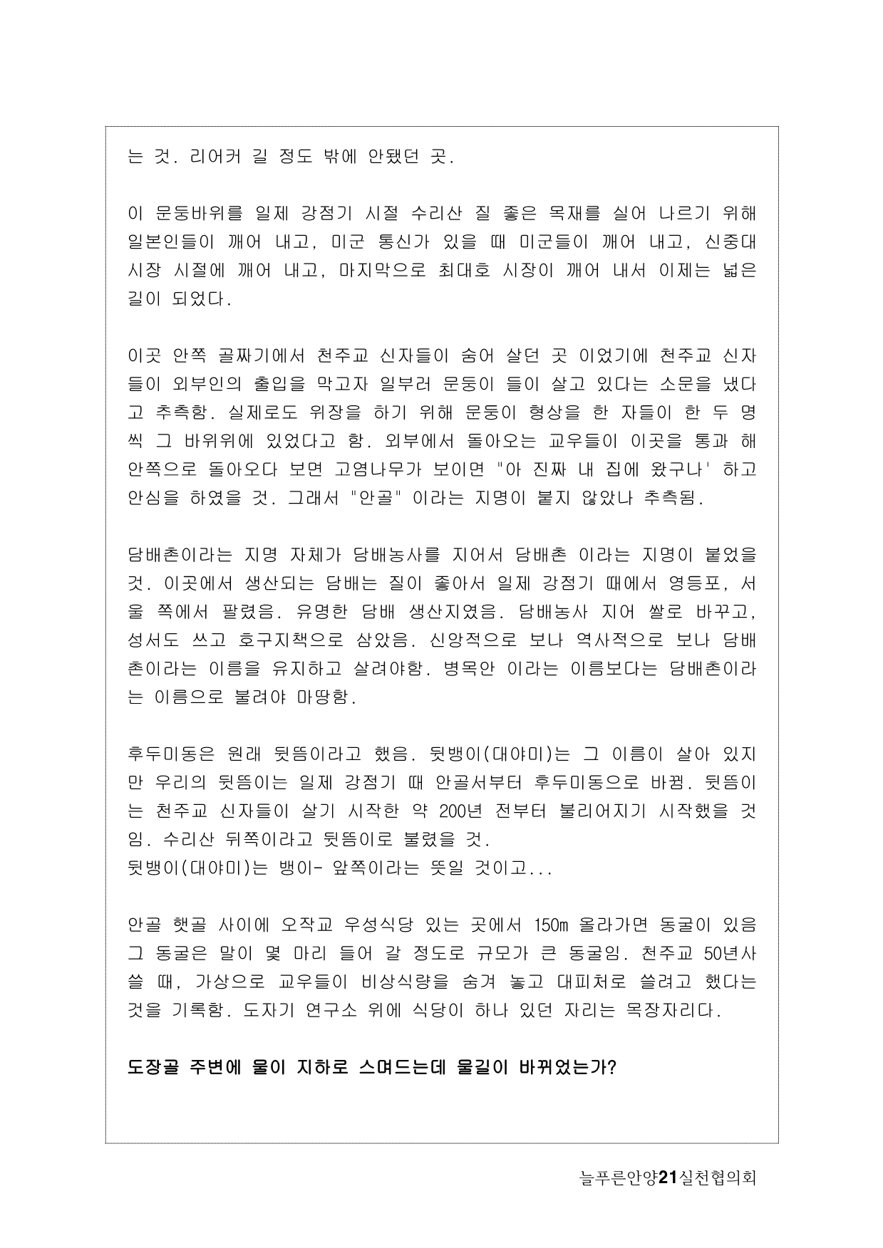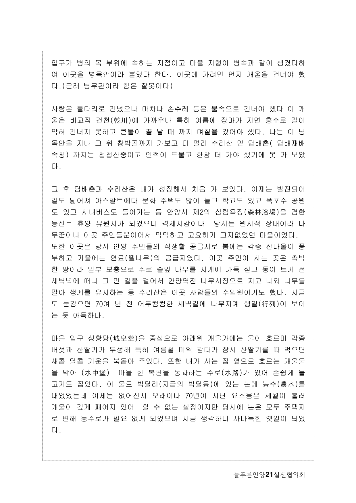 사실, 처음 계획은 생태모니터링이었다. 하지만, 탐사 과정에서 생태 못지않게 중요한 것이 물길과 연결된 마을과 사람들의 이야기를 찾는 것이라고 생각했다. 이곳에 남아 있는 흔적들을 찾아내고 정리하면서 현재 살고 있는 사람들과의 연결고리를 만들어서 역사성과 공동체성을 회복하고 싶은 마음이 무엇보다 컸다. 병목안, 담배촌, 창박골, 안골, 햇골, 큰골, 작은골~~~ 소박하고 정겨운 이름들이다. 더 늦기 전에 우리 옛 이름을 다시 찾고 이곳 사람들이 삶의 터전에 자부심을 느끼며 살 수 있기를 기대하면서.