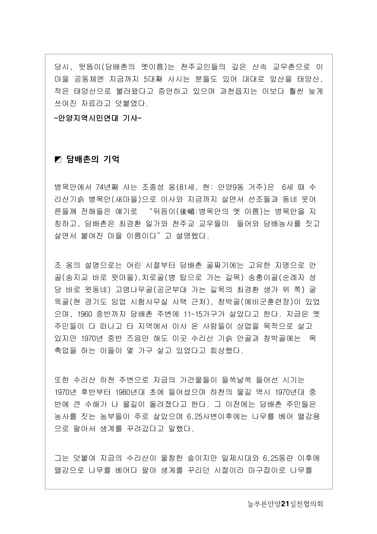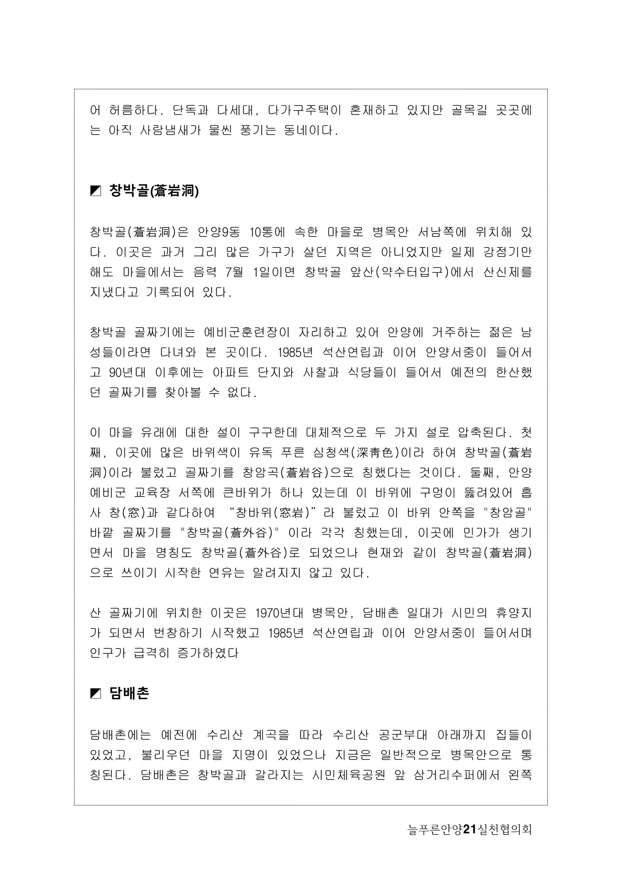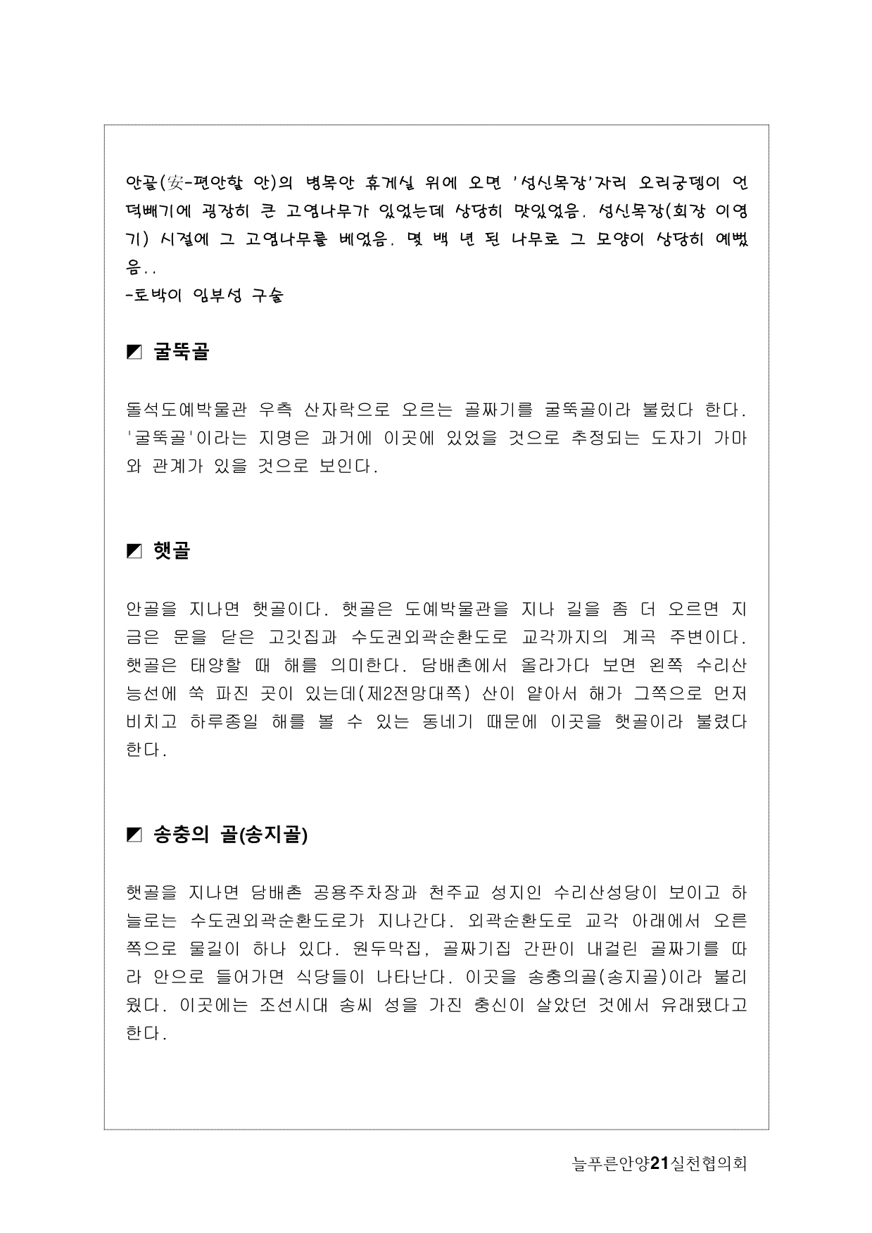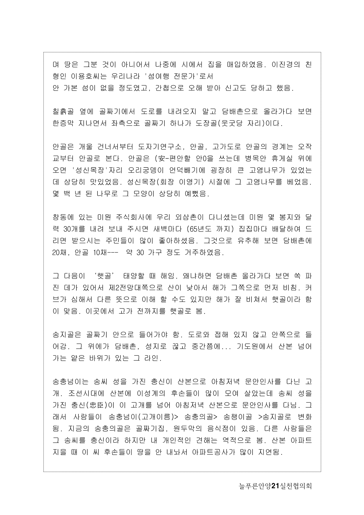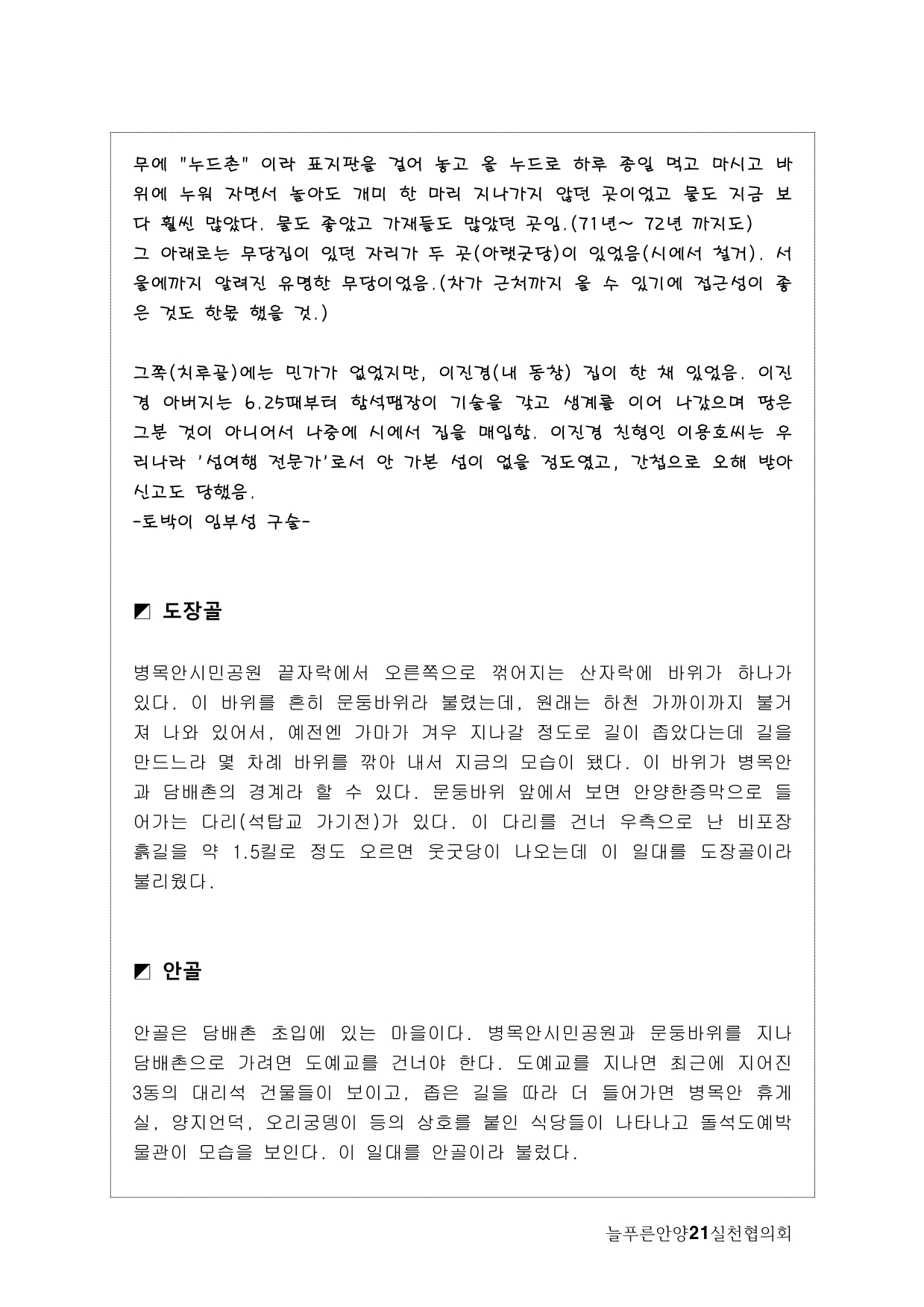 사실, 처음 계획은 생태모니터링이었다. 하지만, 탐사 과정에서 생태 못지않게 중요한 것이 물길과 연결된 마을과 사람들의 이야기를 찾는 것이라고 생각했다. 이곳에 남아 있는 흔적들을 찾아내고 정리하면서 현재 살고 있는 사람들과의 연결고리를 만들어서 역사성과 공동체성을 회복하고 싶은 마음이 무엇보다 컸다. 병목안, 담배촌, 창박골, 안골, 햇골, 큰골, 작은골~~~ 소박하고 정겨운 이름들이다. 더 늦기 전에 우리 옛 이름을 다시 찾고 이곳 사람들이 삶의 터전에 자부심을 느끼며 살 수 있기를 기대하면서.