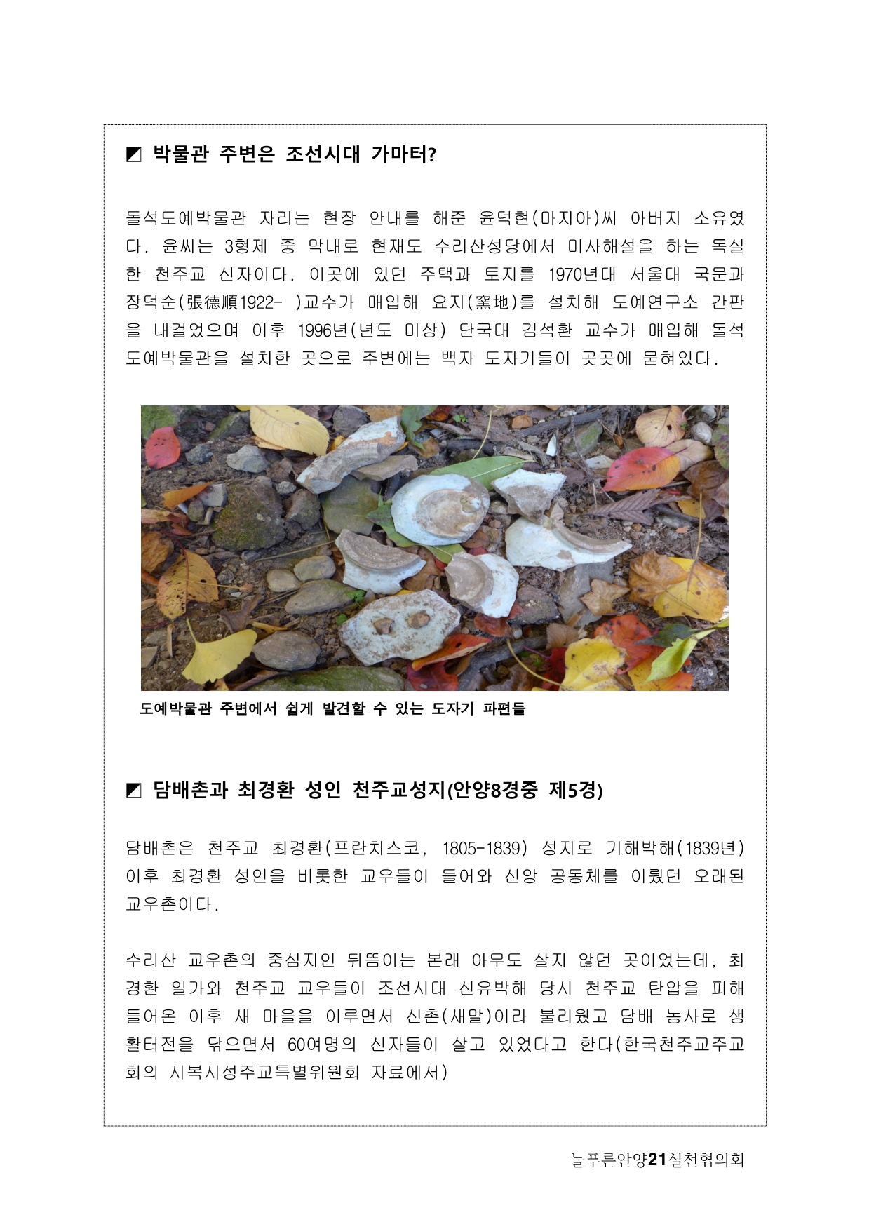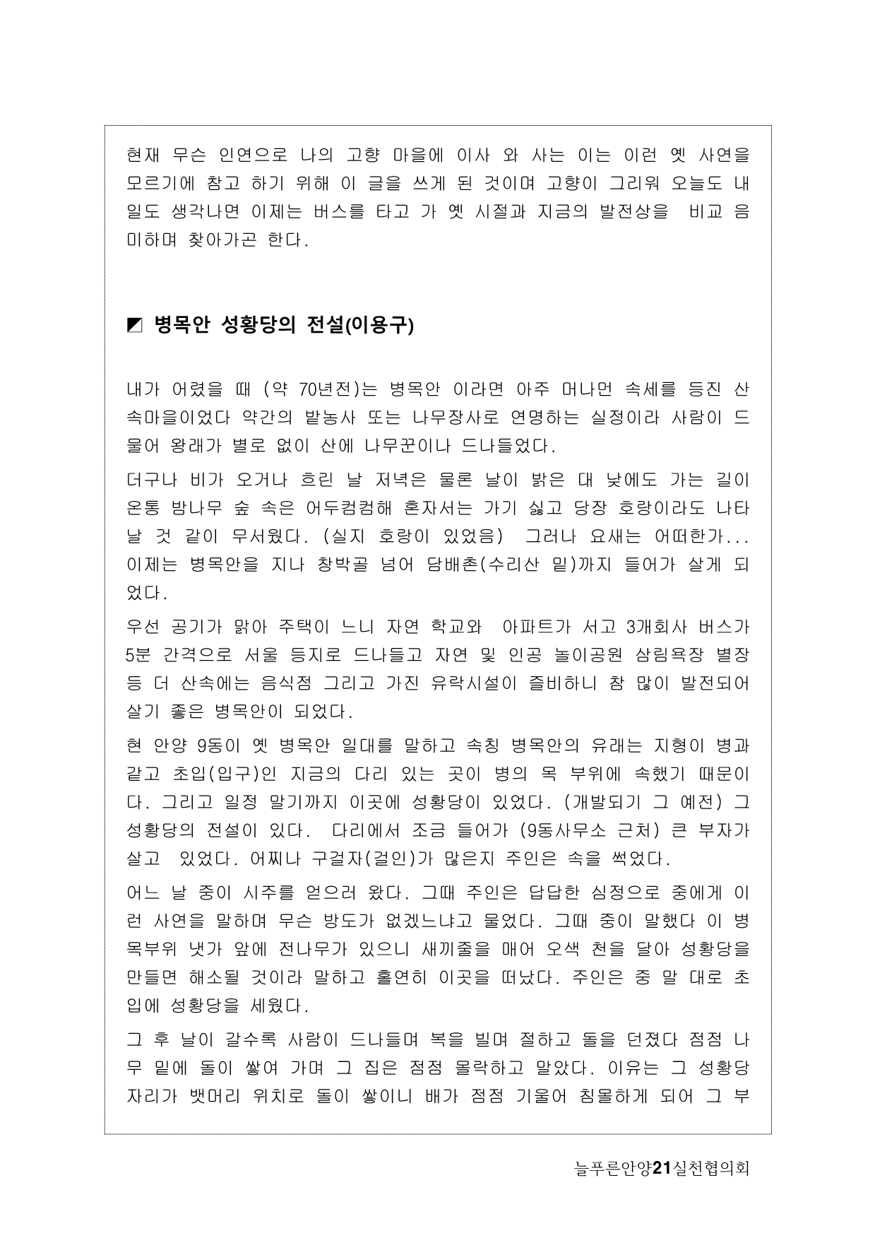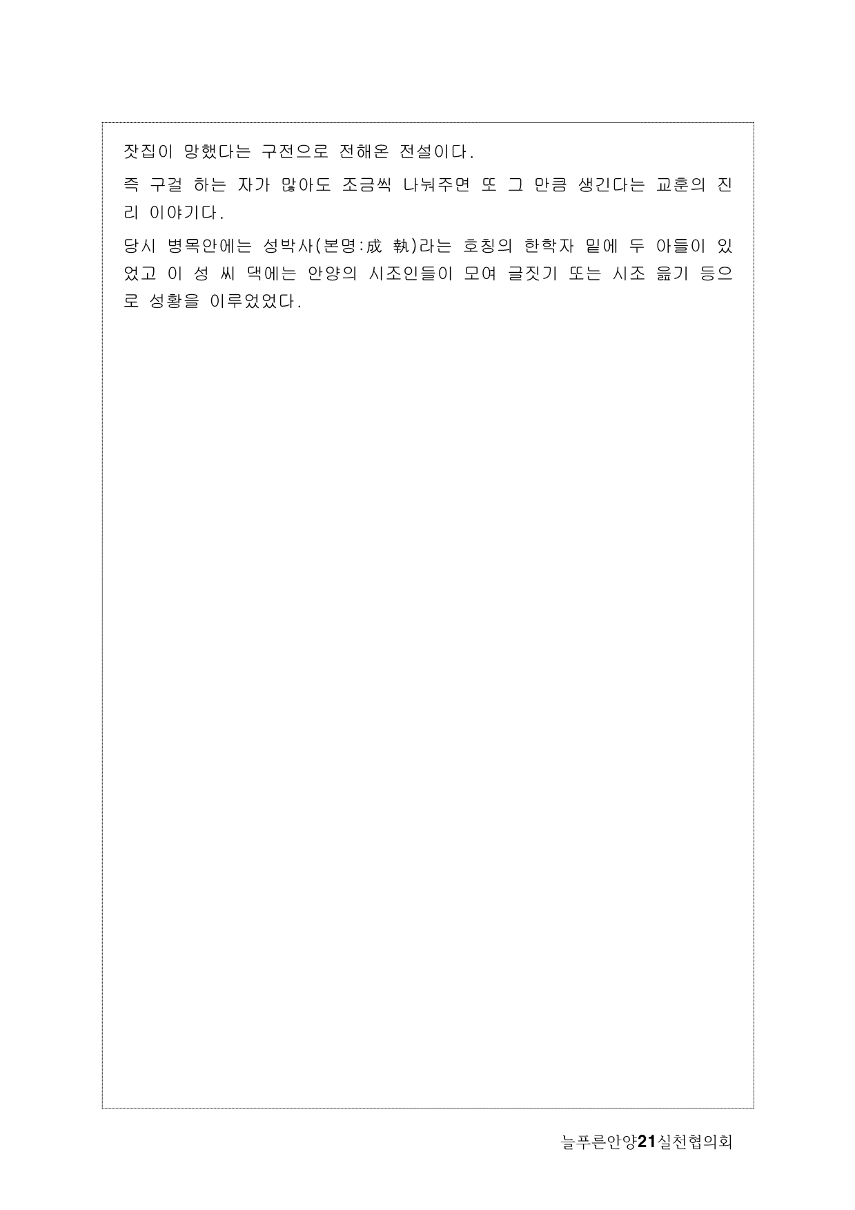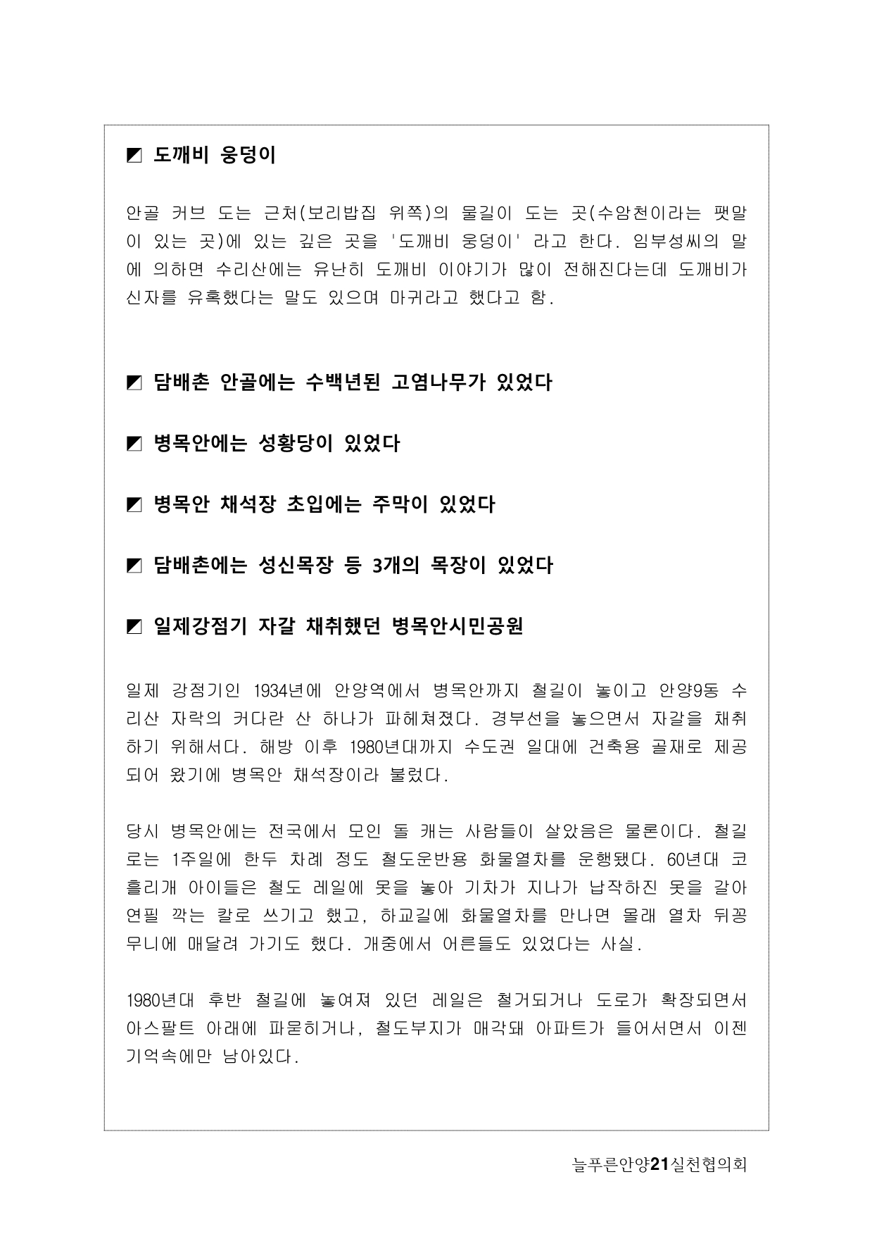 사실, 처음 계획은 생태모니터링이었다. 하지만, 탐사 과정에서 생태 못지않게 중요한 것이 물길과 연결된 마을과 사람들의 이야기를 찾는 것이라고 생각했다. 이곳에 남아 있는 흔적들을 찾아내고 정리하면서 현재 살고 있는 사람들과의 연결고리를 만들어서 역사성과 공동체성을 회복하고 싶은 마음이 무엇보다 컸다. 병목안, 담배촌, 창박골, 안골, 햇골, 큰골, 작은골~~~ 소박하고 정겨운 이름들이다. 더 늦기 전에 우리 옛 이름을 다시 찾고 이곳 사람들이 삶의 터전에 자부심을 느끼며 살 수 있기를 기대하면서.