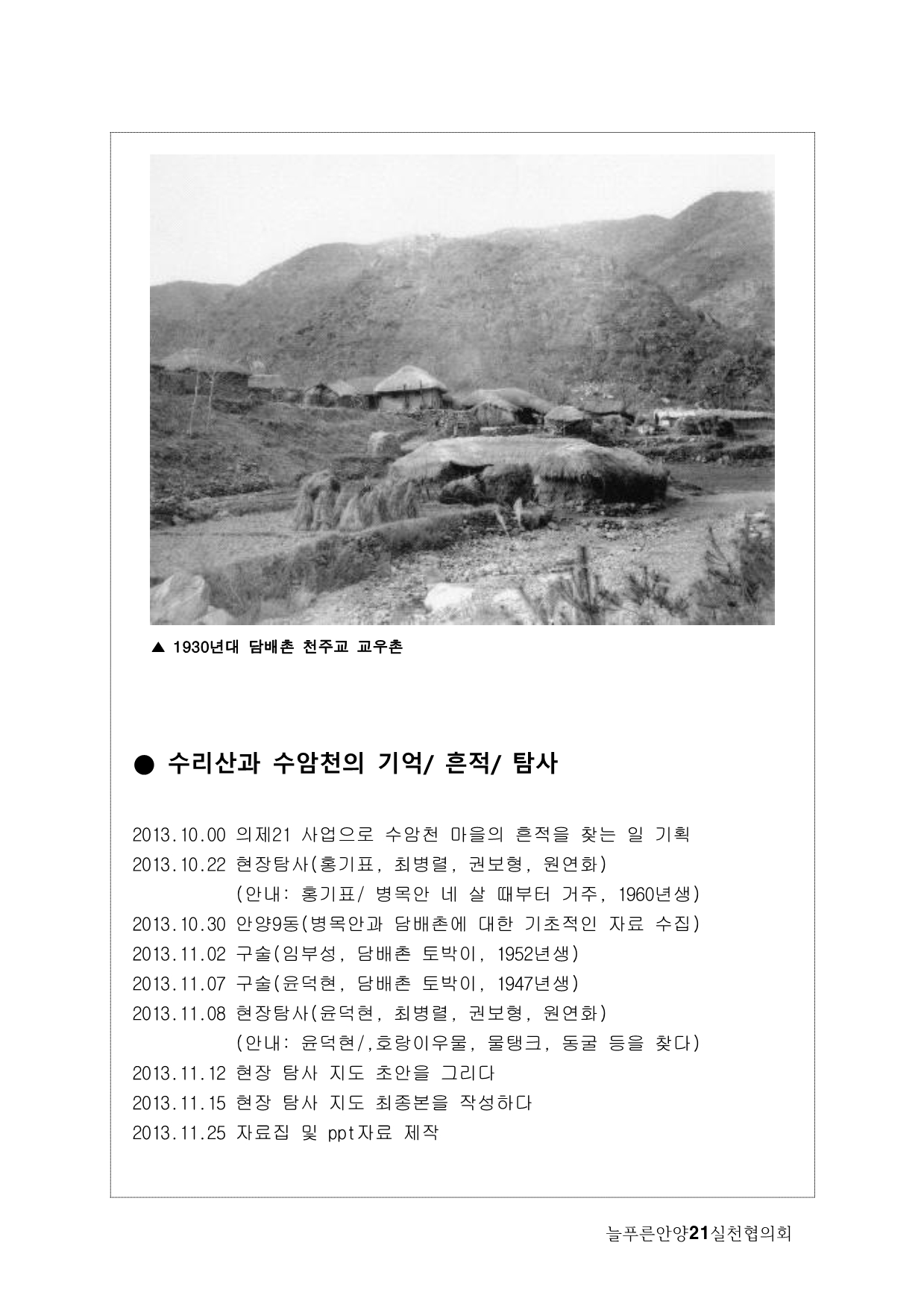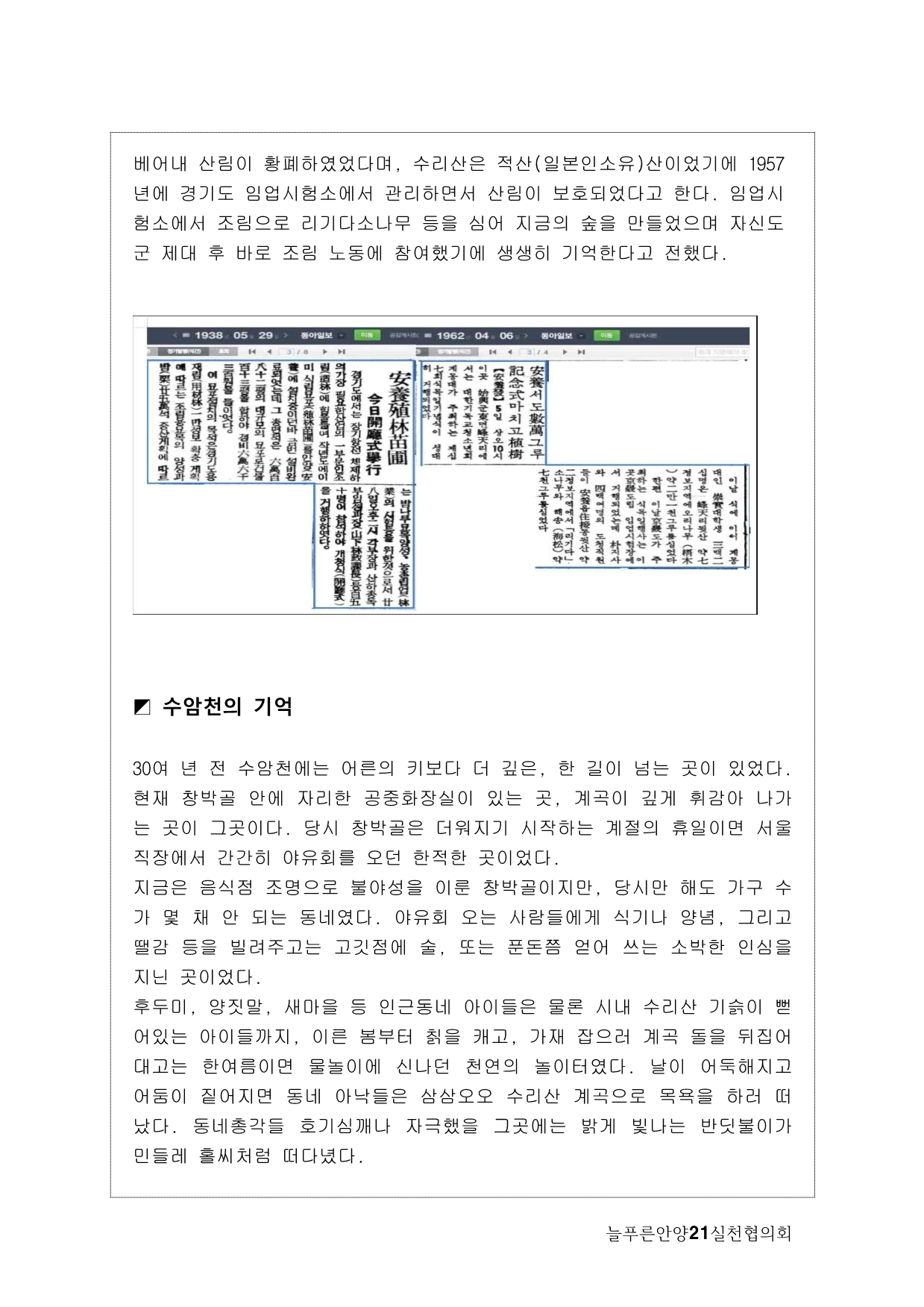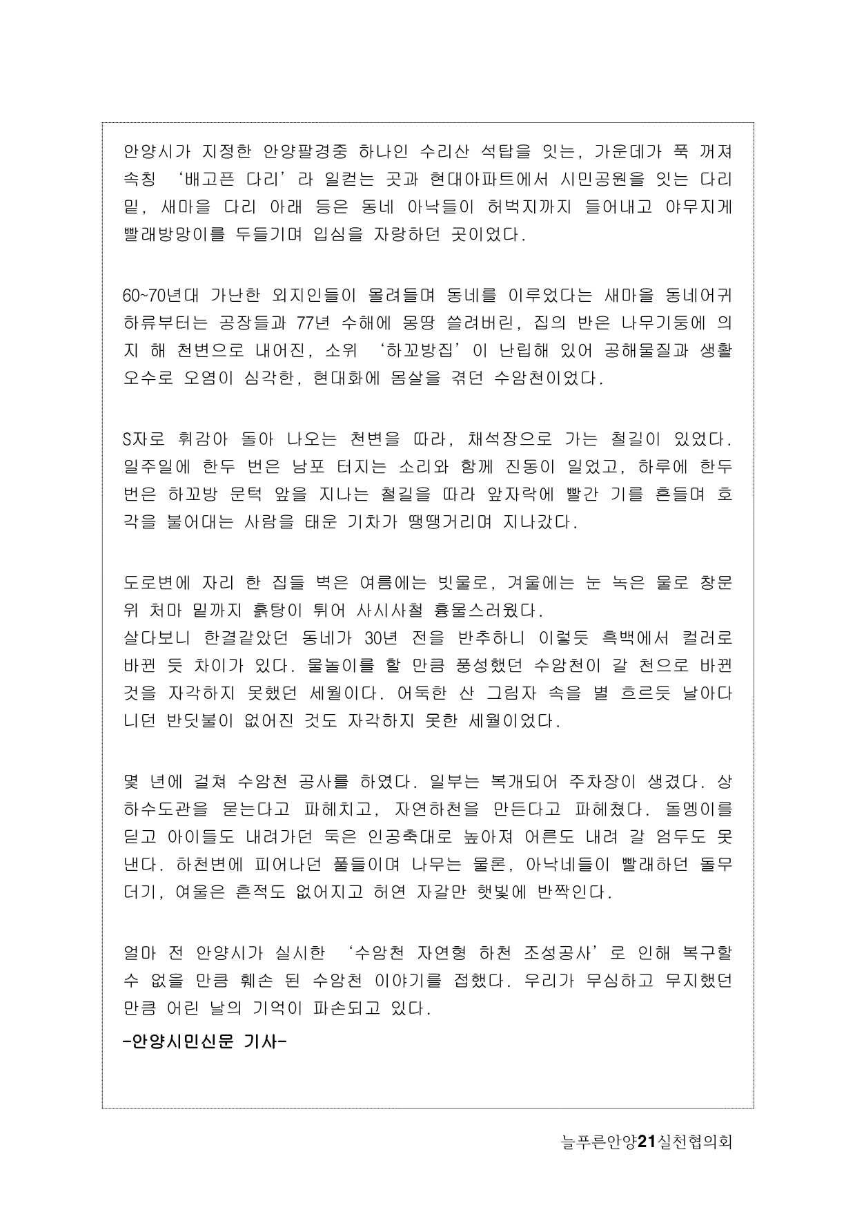 늘푸른안양21에서는 2013년 기획사업으로 수암천 모니터링을 계획하게 됐다. 많은 지천 가운데 우리가 수암천에 주목하게 된 이유는, 그동안 복개천이었다가 올해 복원이 완료됐기 때문이다. 수암천은 수리산에서 발원해 안양 원도심을 관통하면서 안양천 본류와 만나는 매우 의미 있는 하천임에도 그동안 복개로 인해 사람들의 관심에서 멀어져 있었다. 이번 복원을 계기로 수암천을 새롭게 바라보고 수암천을 중심으로 한 생태계의 지속적인 모니터링과 함께 하천을 중심으로 살아오거나 살고 있는 마을과 사람들의 이야기를 하고 싶었다.