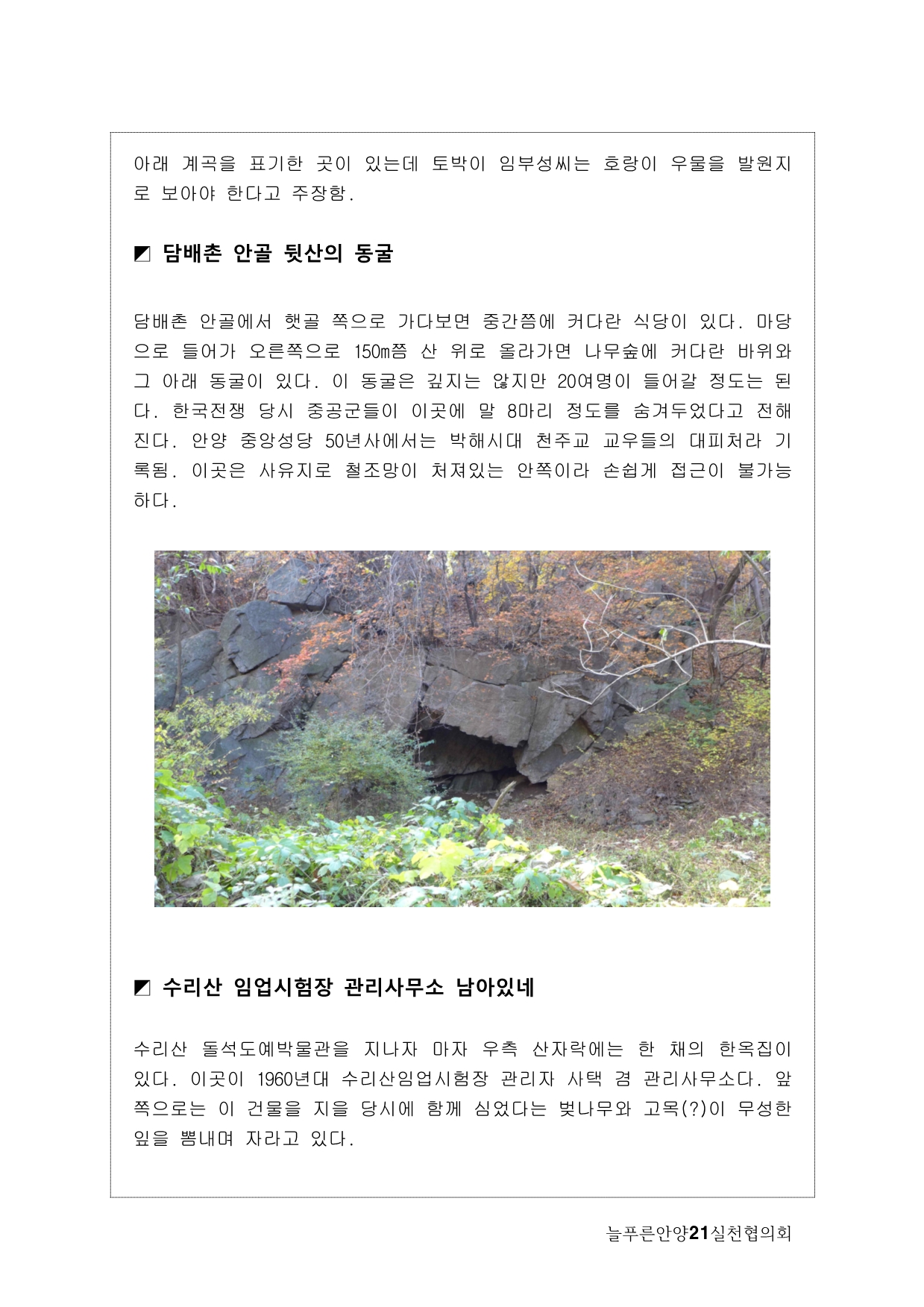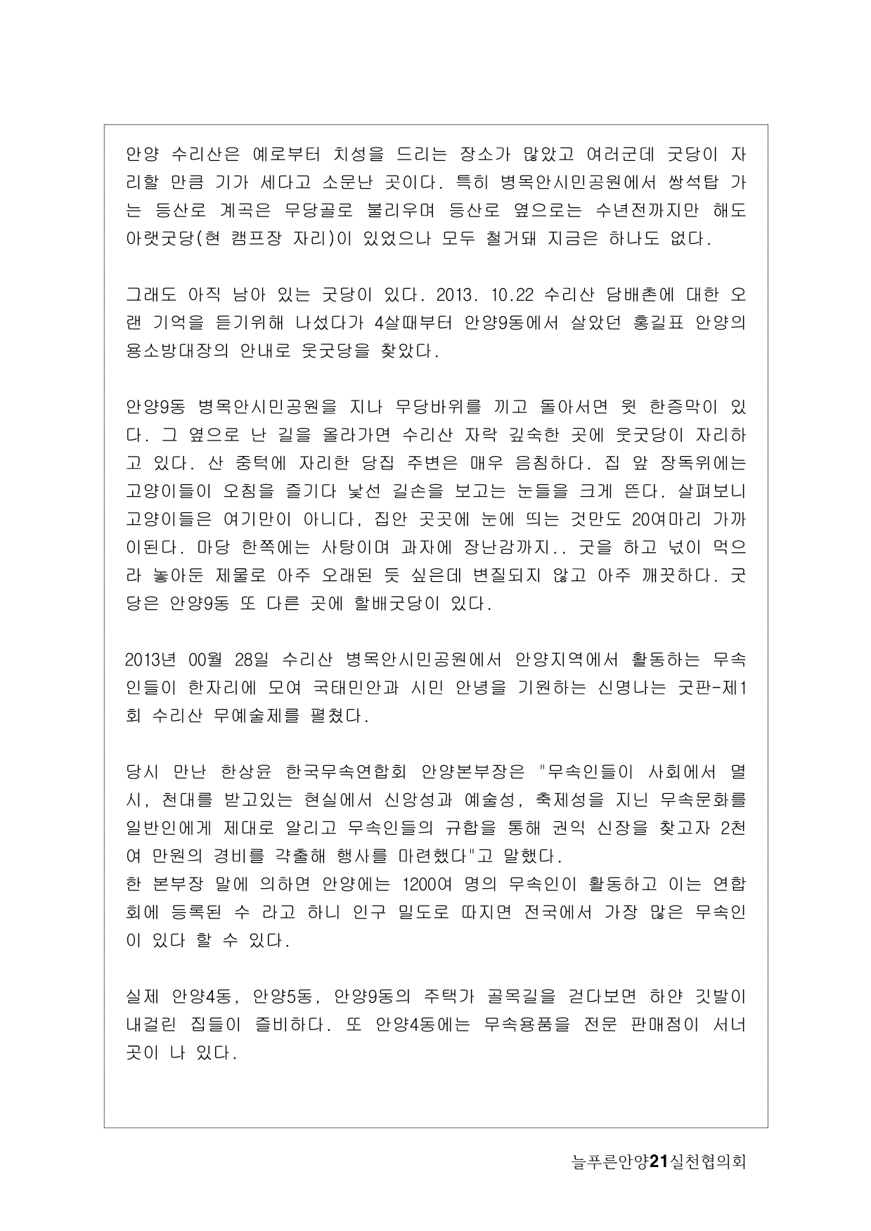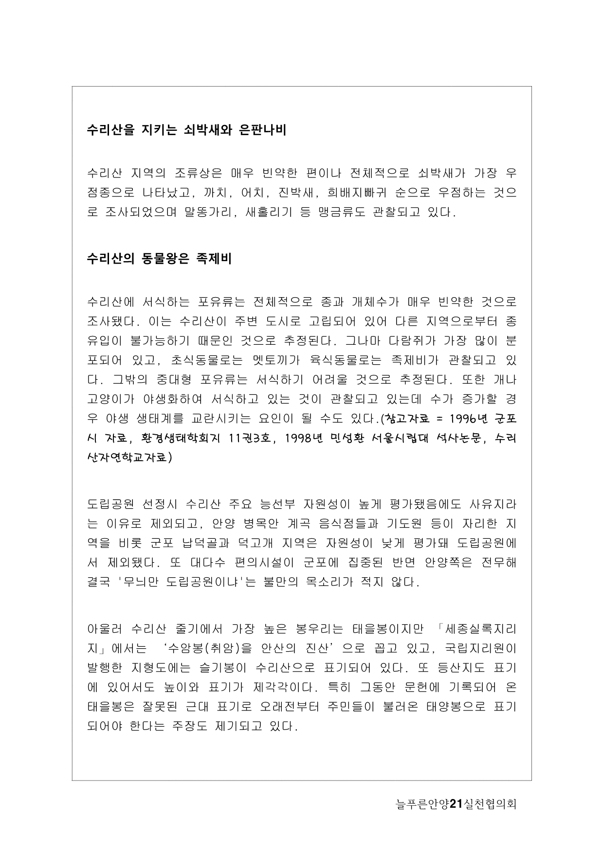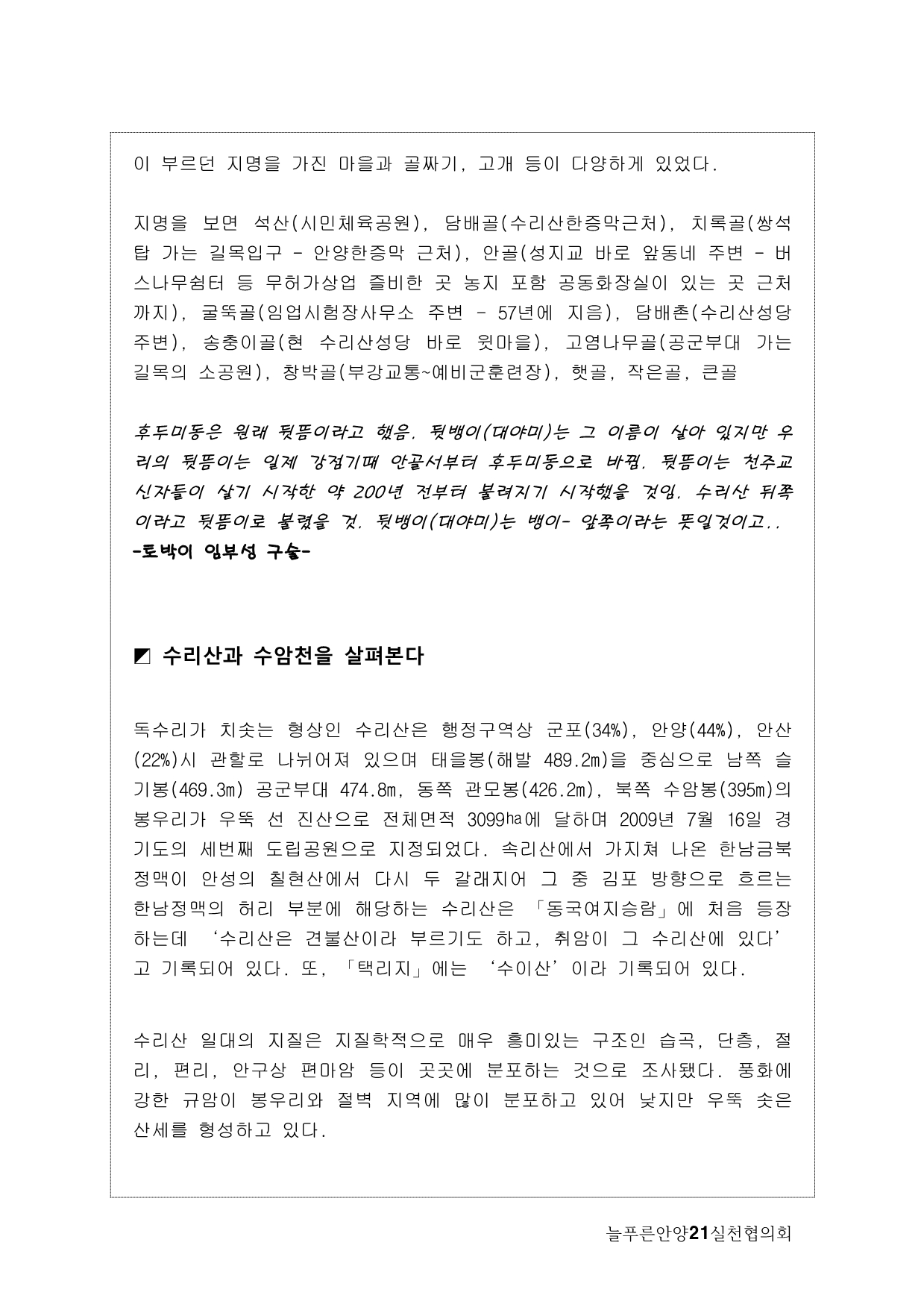 늘푸른안양21에서는 2013년 기획사업으로 수암천 모니터링을 계획하게 됐다. 많은 지천 가운데 우리가 수암천에 주목하게 된 이유는, 그동안 복개천이었다가 올해 복원이 완료됐기 때문이다. 수암천은 수리산에서 발원해 안양 원도심을 관통하면서 안양천 본류와 만나는 매우 의미 있는 하천임에도 그동안 복개로 인해 사람들의 관심에서 멀어져 있었다. 이번 복원을 계기로 수암천을 새롭게 바라보고 수암천을 중심으로 한 생태계의 지속적인 모니터링과 함께 하천을 중심으로 살아오거나 살고 있는 마을과 사람들의 이야기를 하고 싶었다.