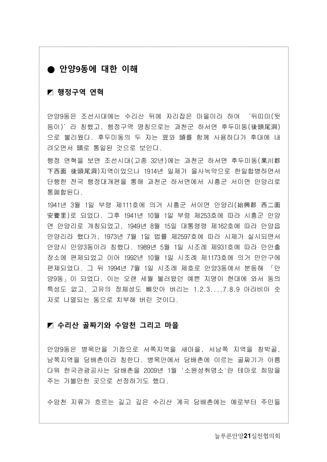 인류의 역사는 하천을 따라 형성되고 발전해 왔다. 안양의 역사와 문화 역시 안양천이 있기에 가능했고, 안양천의 갈래갈래 작은 물줄기를 따라 사람들이 모여들고 오순도순 정을 나누며 사는 마을이 만들어졌다. 안양의 젖줄인 안양천은 한때 생명이라고는 찾아볼 수 없는 오염이 심각한 하천이었지만, 시와 시민들의 지속적인 노력으로 생명력 넘치는 하천이 됐다. 안양천은 본류 이외에도 수암천 삼봉천, 갈월천 등 많은 지천의 물이 모아져 큰 물줄기를 형성하고 있다.