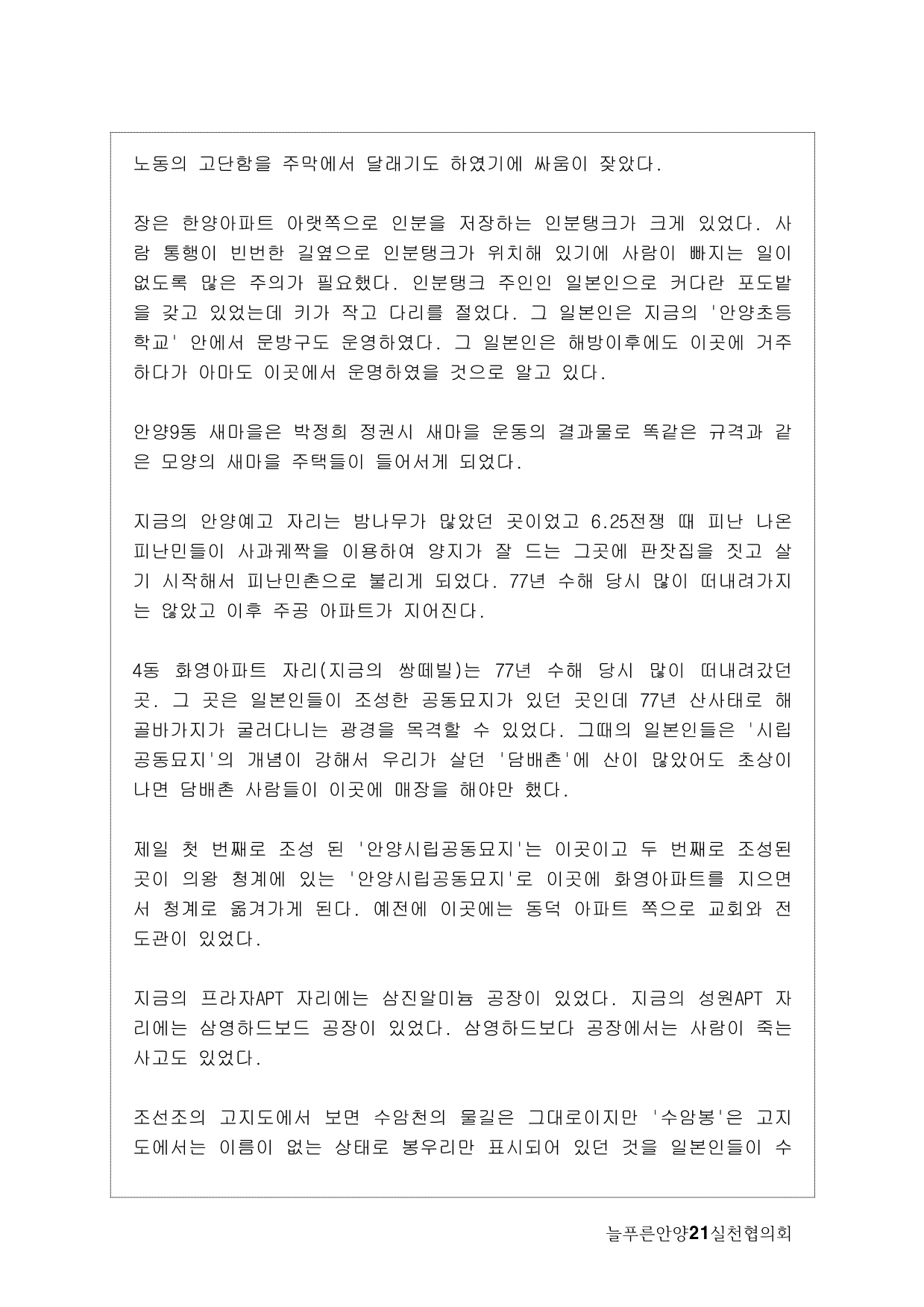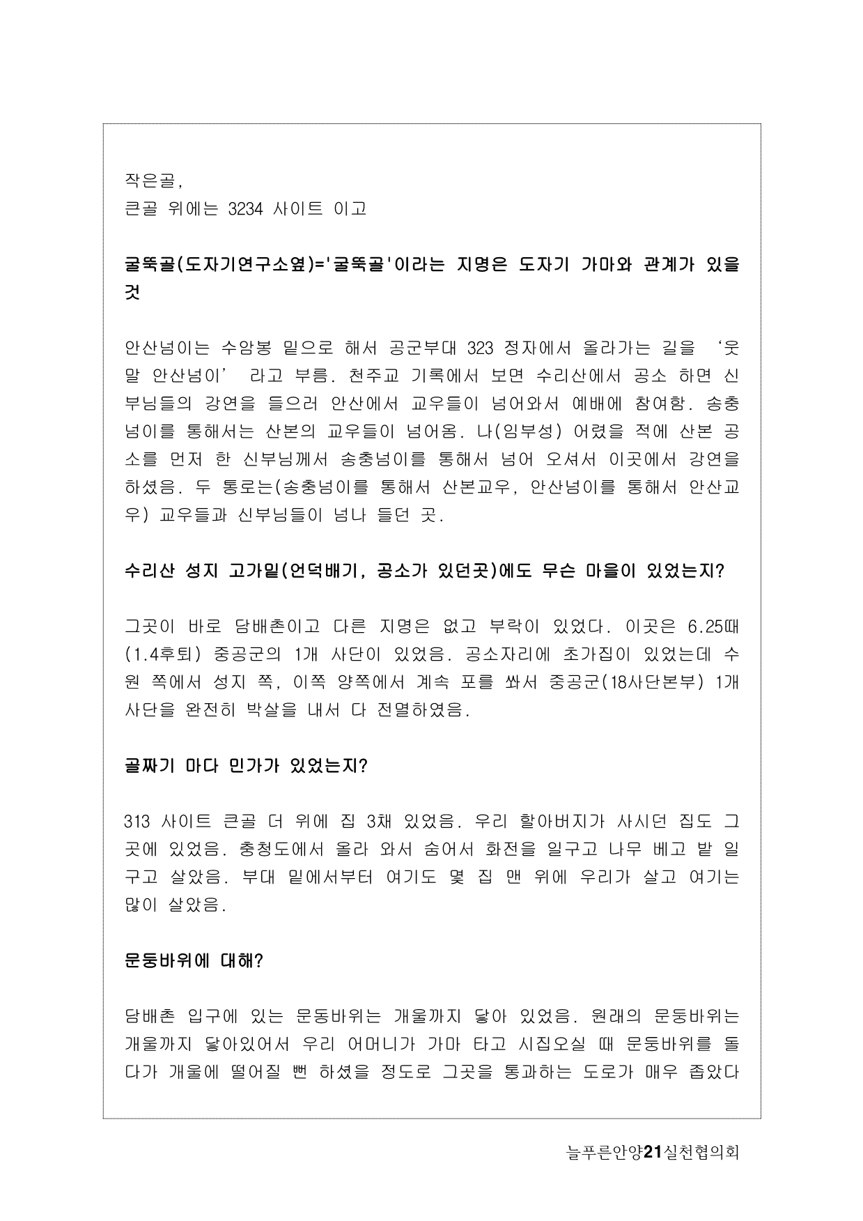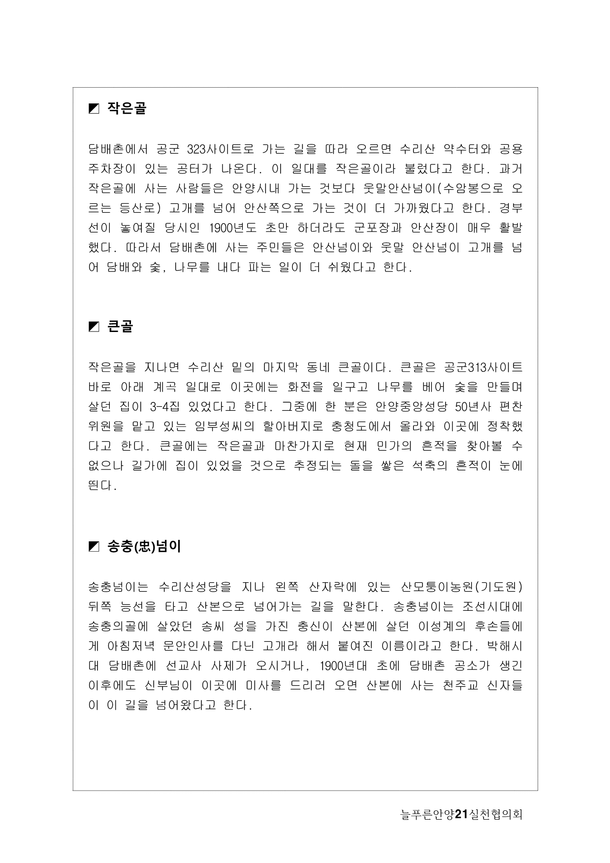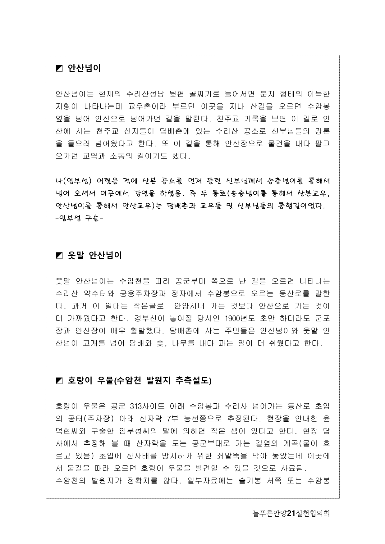 사실, 처음 계획은 생태모니터링이었다. 하지만, 탐사 과정에서 생태 못지않게 중요한 것이 물길과 연결된 마을과 사람들의 이야기를 찾는 것이라고 생각했다. 이곳에 남아 있는 흔적들을 찾아내고 정리하면서 현재 살고 있는 사람들과의 연결고리를 만들어서 역사성과 공동체성을 회복하고 싶은 마음이 무엇보다 컸다. 병목안, 담배촌, 창박골, 안골, 햇골, 큰골, 작은골~~~ 소박하고 정겨운 이름들이다. 더 늦기 전에 우리 옛 이름을 다시 찾고 이곳 사람들이 삶의 터전에 자부심을 느끼며 살 수 있기를 기대하면서.