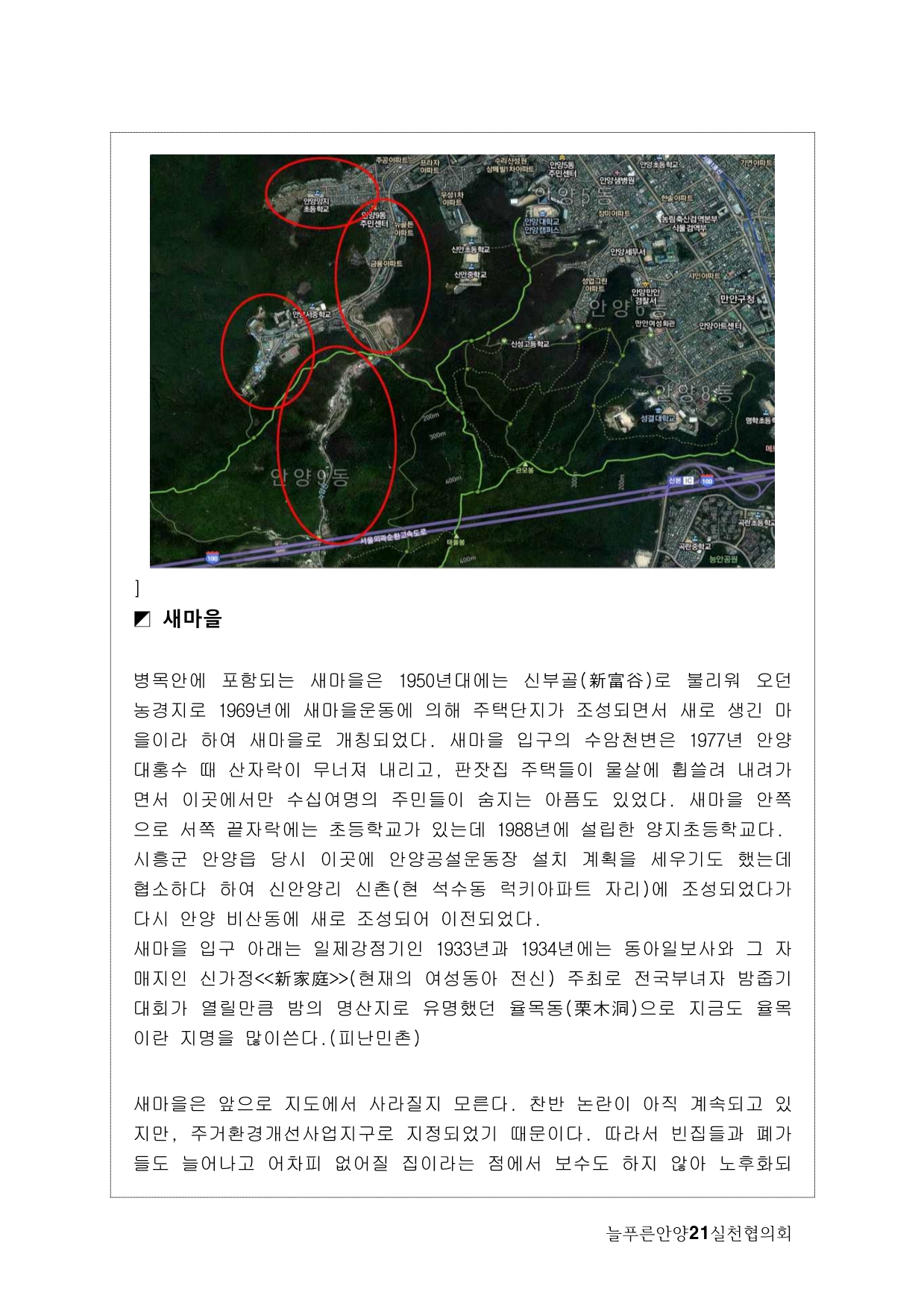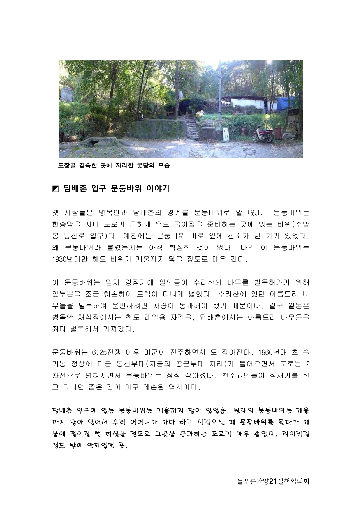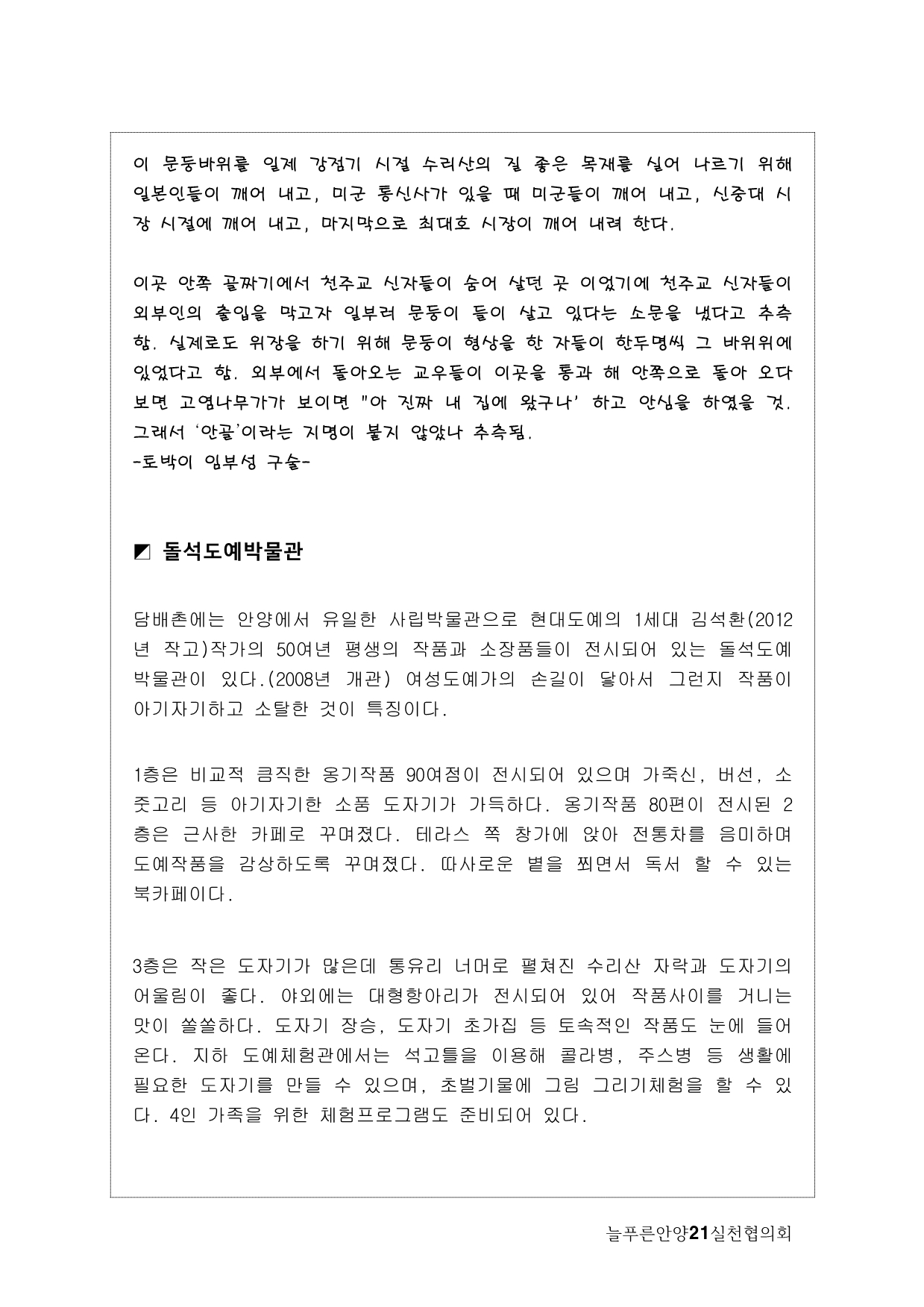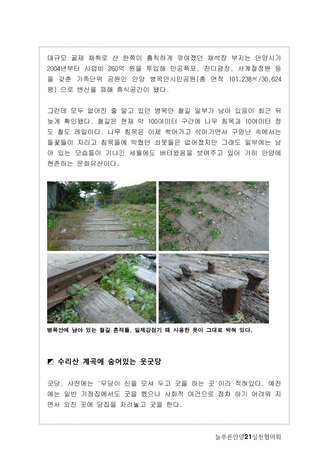 사실, 처음 계획은 생태모니터링이었다. 하지만, 탐사 과정에서 생태 못지않게 중요한 것이 물길과 연결된 마을과 사람들의 이야기를 찾는 것이라고 생각했다. 이곳에 남아 있는 흔적들을 찾아내고 정리하면서 현재 살고 있는 사람들과의 연결고리를 만들어서 역사성과 공동체성을 회복하고 싶은 마음이 무엇보다 컸다. 병목안, 담배촌, 창박골, 안골, 햇골, 큰골, 작은골~~~ 소박하고 정겨운 이름들이다. 더 늦기 전에 우리 옛 이름을 다시 찾고 이곳 사람들이 삶의 터전에 자부심을 느끼며 살 수 있기를 기대하면서.