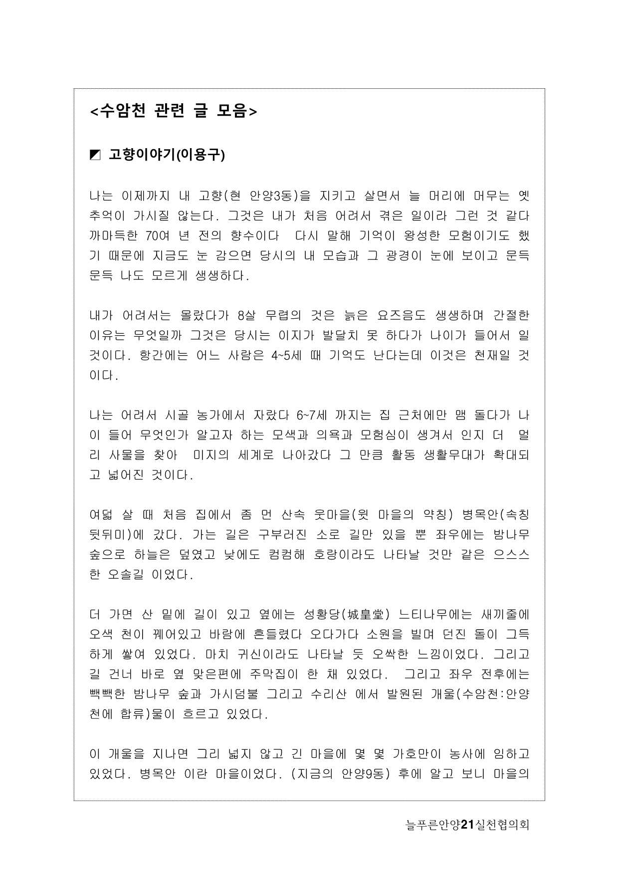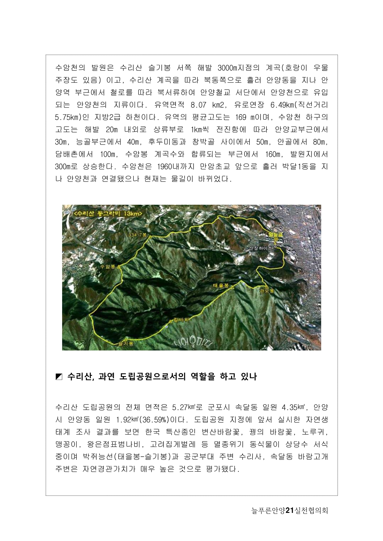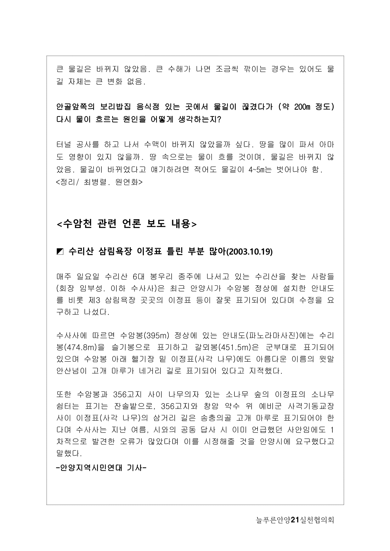늘푸른안양21에서는 2013년 기획사업으로 수암천 모니터링을 계획하게 됐다. 많은 지천 가운데 우리가 수암천에 주목하게 된 이유는, 그동안 복개천이었다가 올해 복원이 완료됐기 때문이다. 수암천은 수리산에서 발원해 안양 원도심을 관통하면서 안양천 본류와 만나는 매우 의미 있는 하천임에도 그동안 복개로 인해 사람들의 관심에서 멀어져 있었다. 이번 복원을 계기로 수암천을 새롭게 바라보고 수암천을 중심으로 한 생태계의 지속적인 모니터링과 함께 하천을 중심으로 살아오거나 살고 있는 마을과 사람들의 이야기를 하고 싶었다.