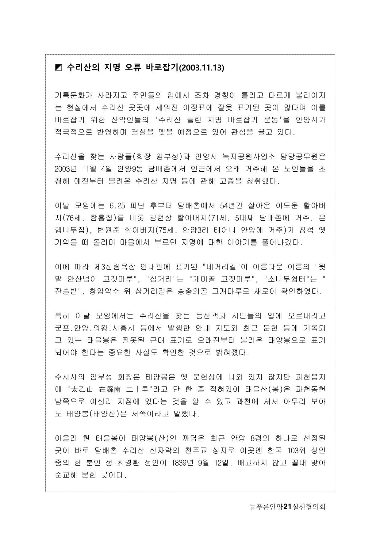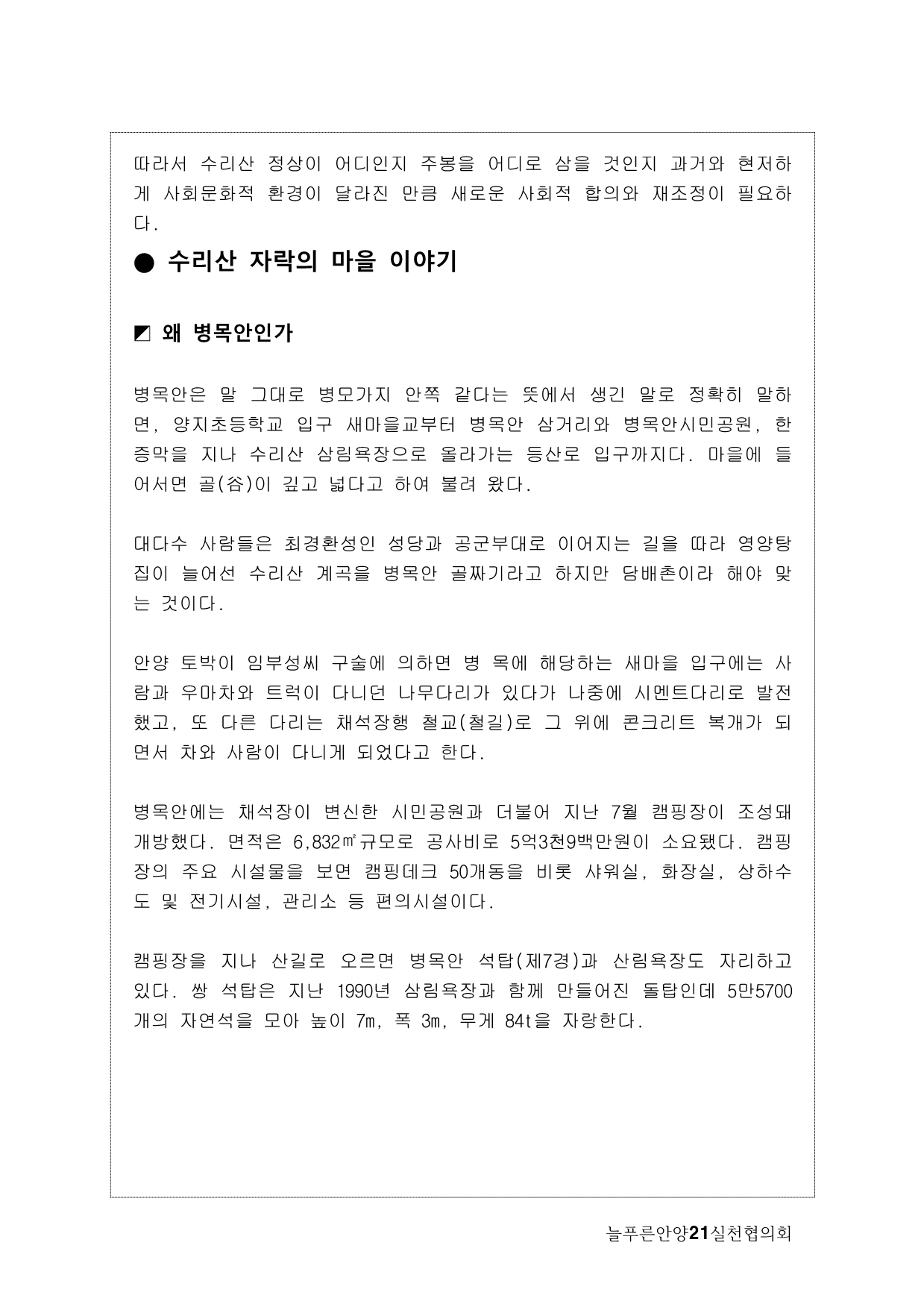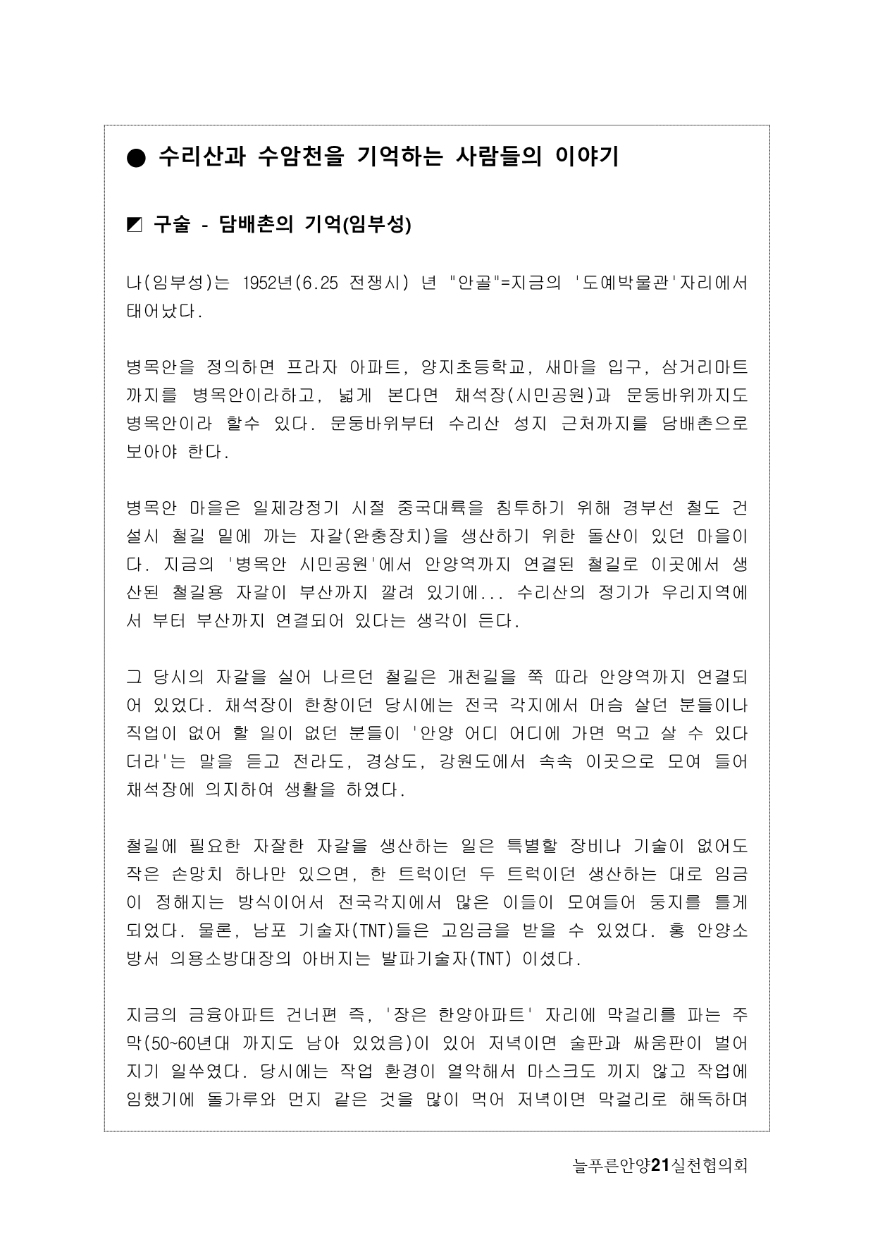 늘푸른안양21에서는 2013년 기획사업으로 수암천 모니터링을 계획하게 됐다. 많은 지천 가운데 우리가 수암천에 주목하게 된 이유는, 그동안 복개천이었다가 올해 복원이 완료됐기 때문이다. 수암천은 수리산에서 발원해 안양 원도심을 관통하면서 안양천 본류와 만나는 매우 의미 있는 하천임에도 그동안 복개로 인해 사람들의 관심에서 멀어져 있었다. 이번 복원을 계기로 수암천을 새롭게 바라보고 수암천을 중심으로 한 생태계의 지속적인 모니터링과 함께 하천을 중심으로 살아오거나 살고 있는 마을과 사람들의 이야기를 하고 싶었다.