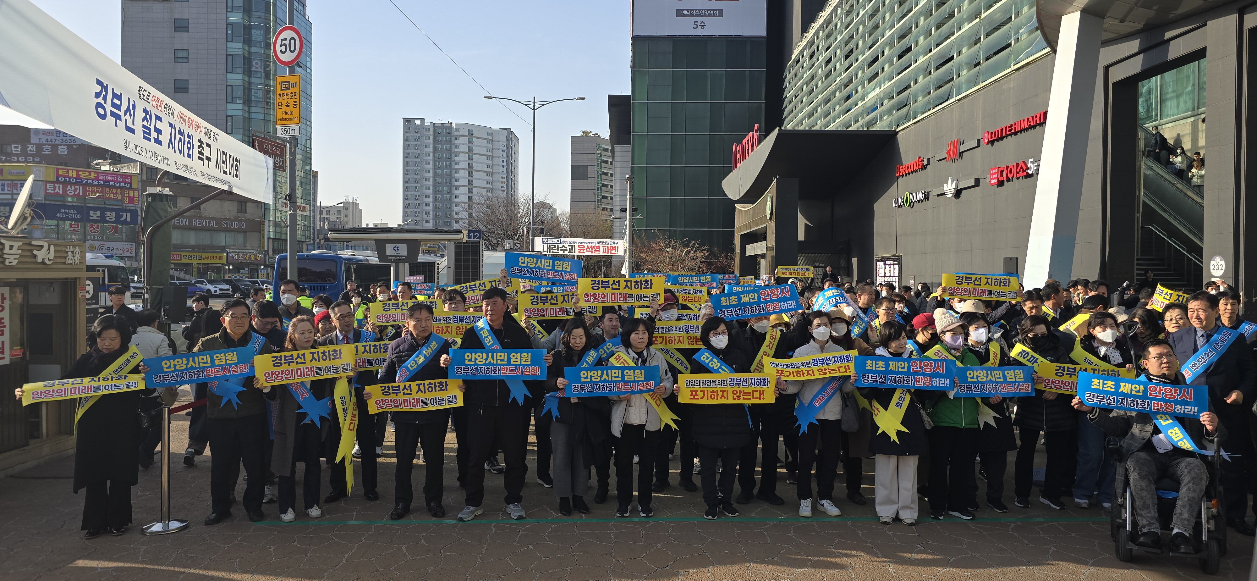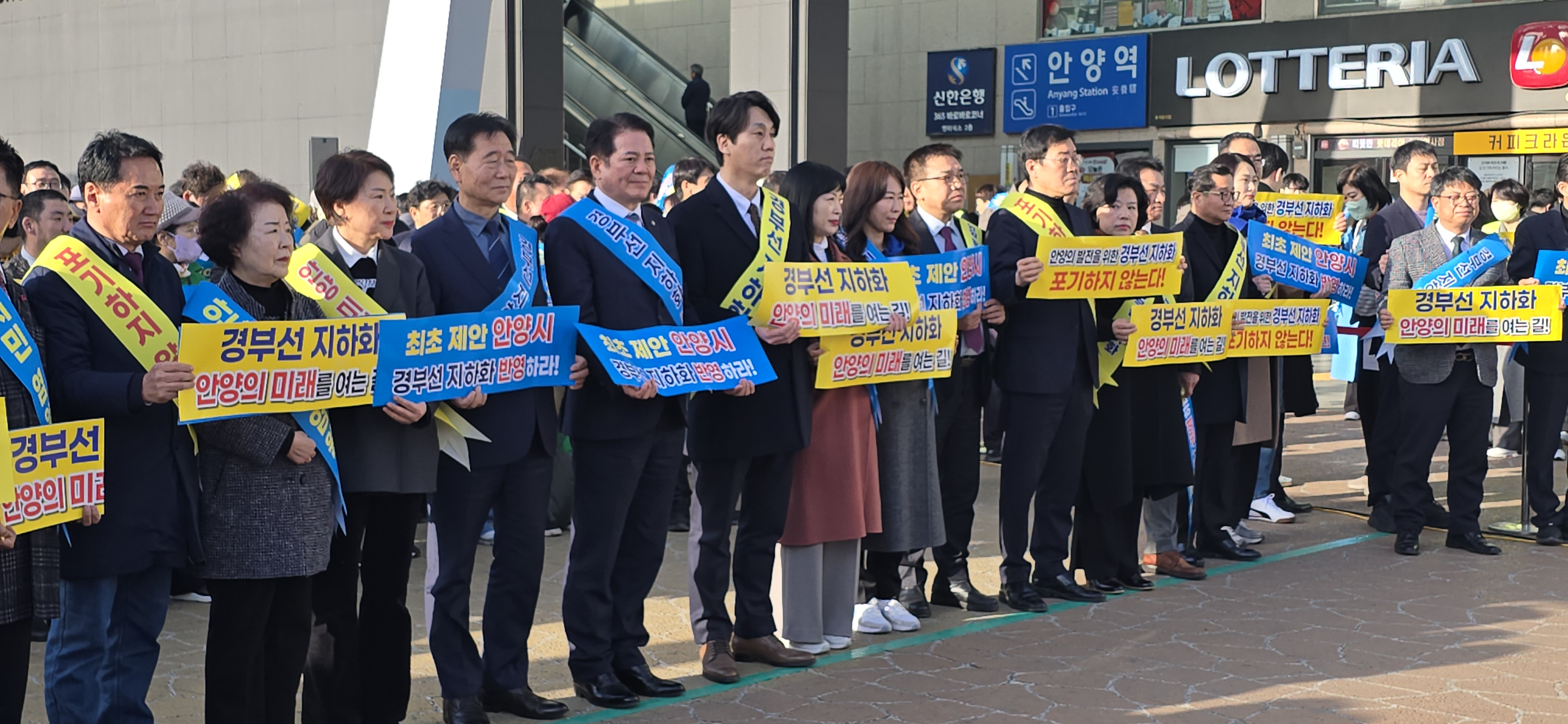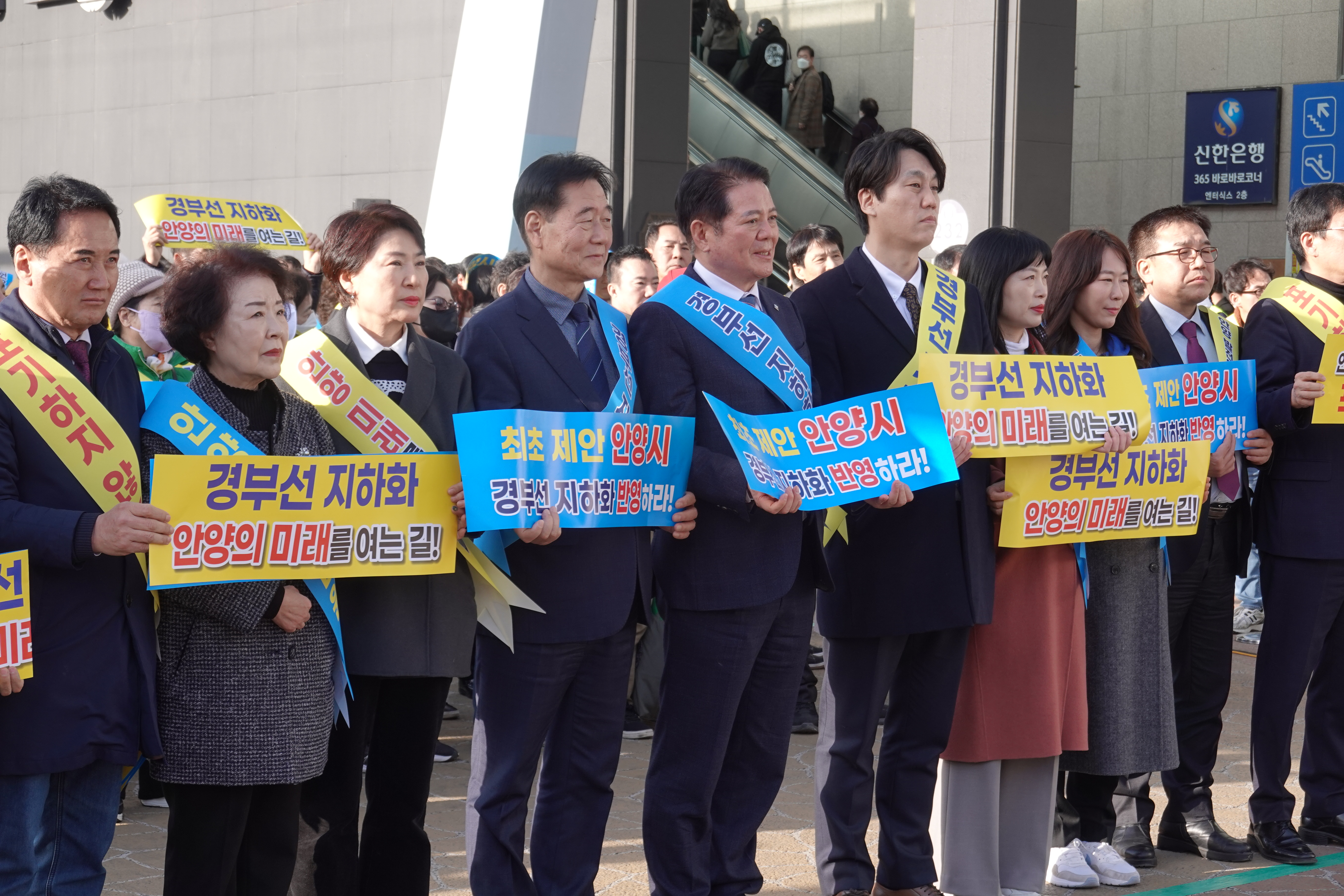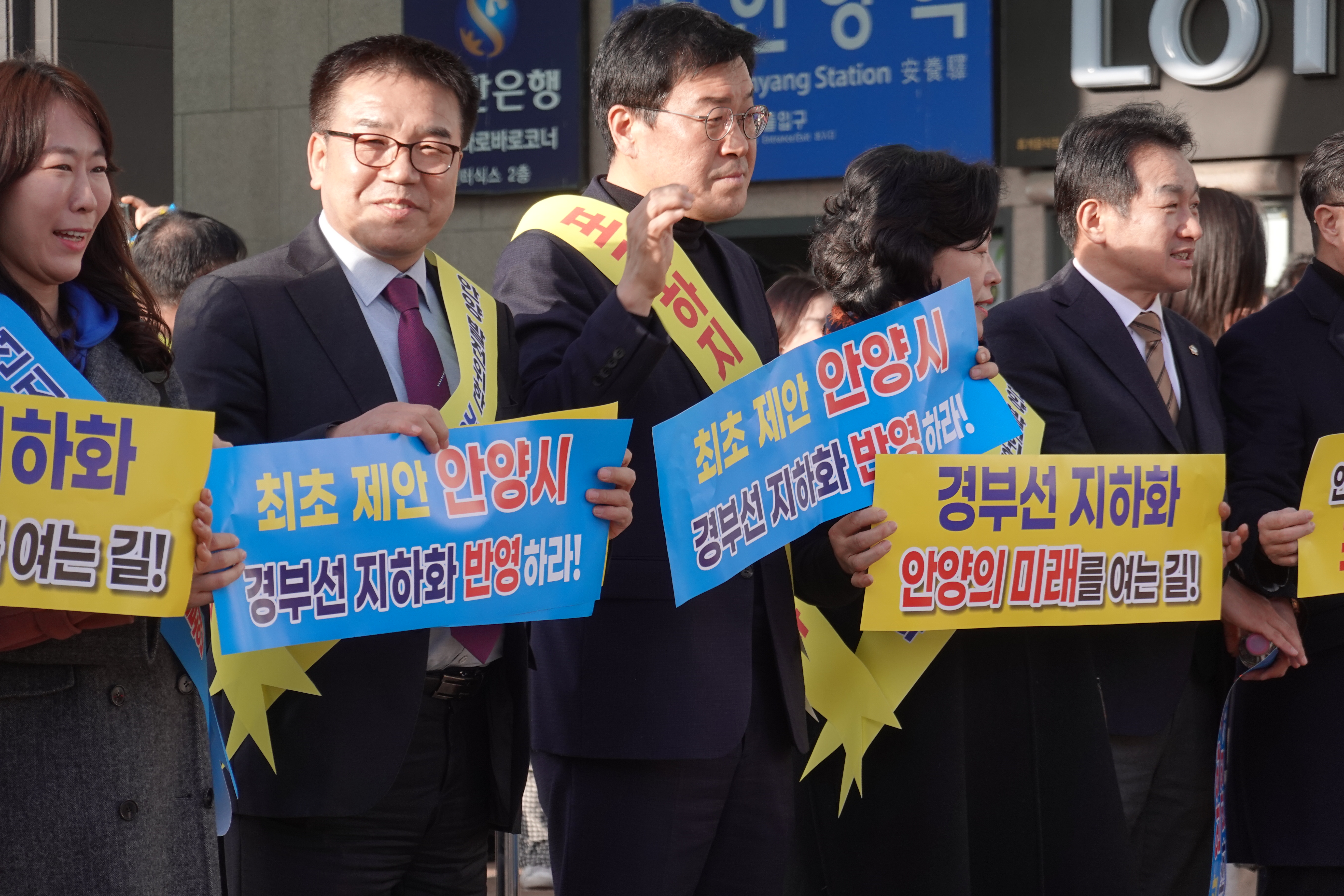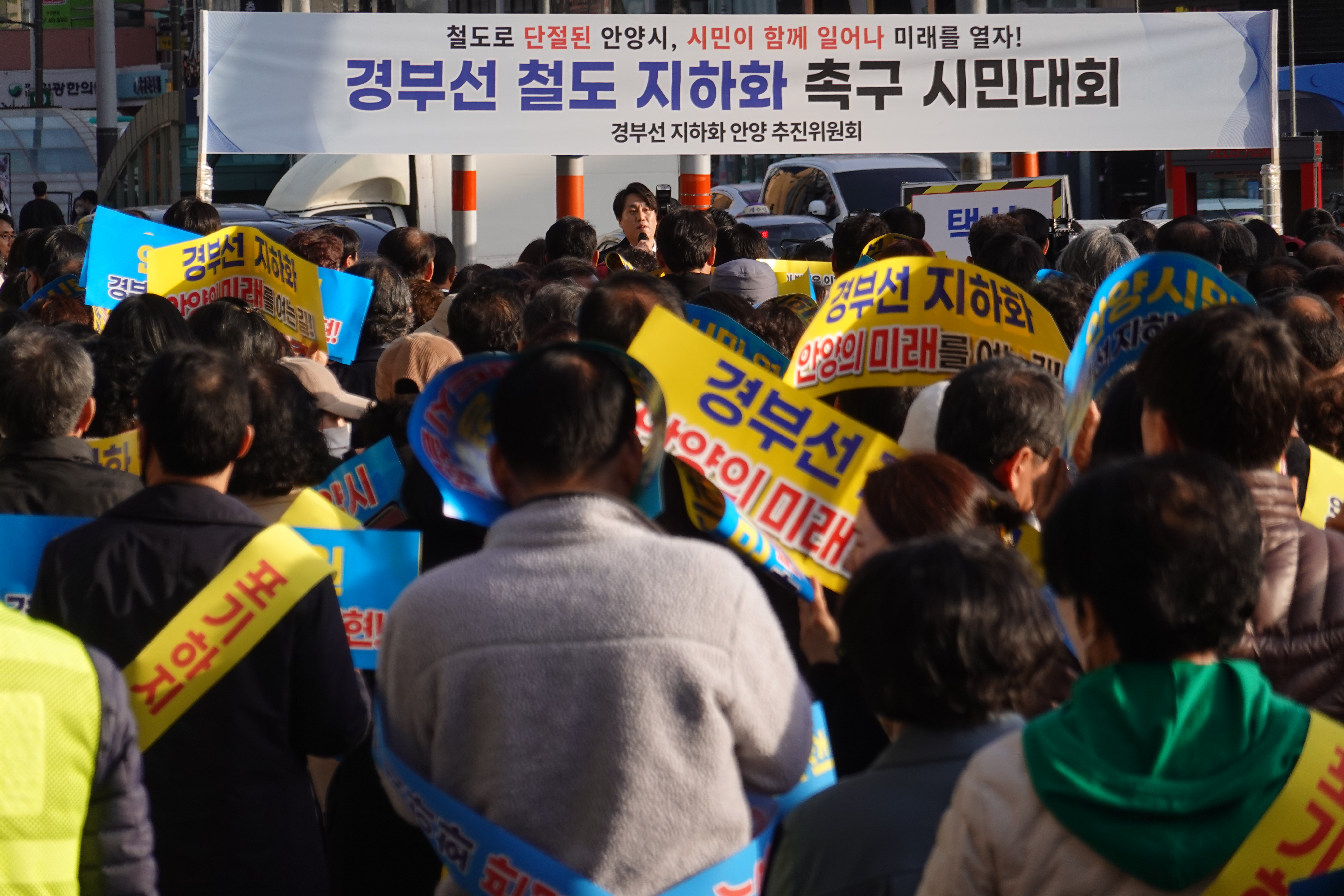 경부선 지하화 촉구 시민대회.‘경부선 지하화 안양 추진위원회’(위원장 김의중)가 13일 오후 5시 안양역 광장에서 철도 지하화 촉구 시민대회를 개최했다. 이날 행사에는 최대호 안양시장과 박준모 안양시의장을 비롯 경기도의원, 안양시의원 및 추진위원회와 시민 400여명이 참석해 경부선 철도 지하화의 필요성을 강조하고, 정부의 종합계획 반영을 촉구하는 성명서를 발표했다.