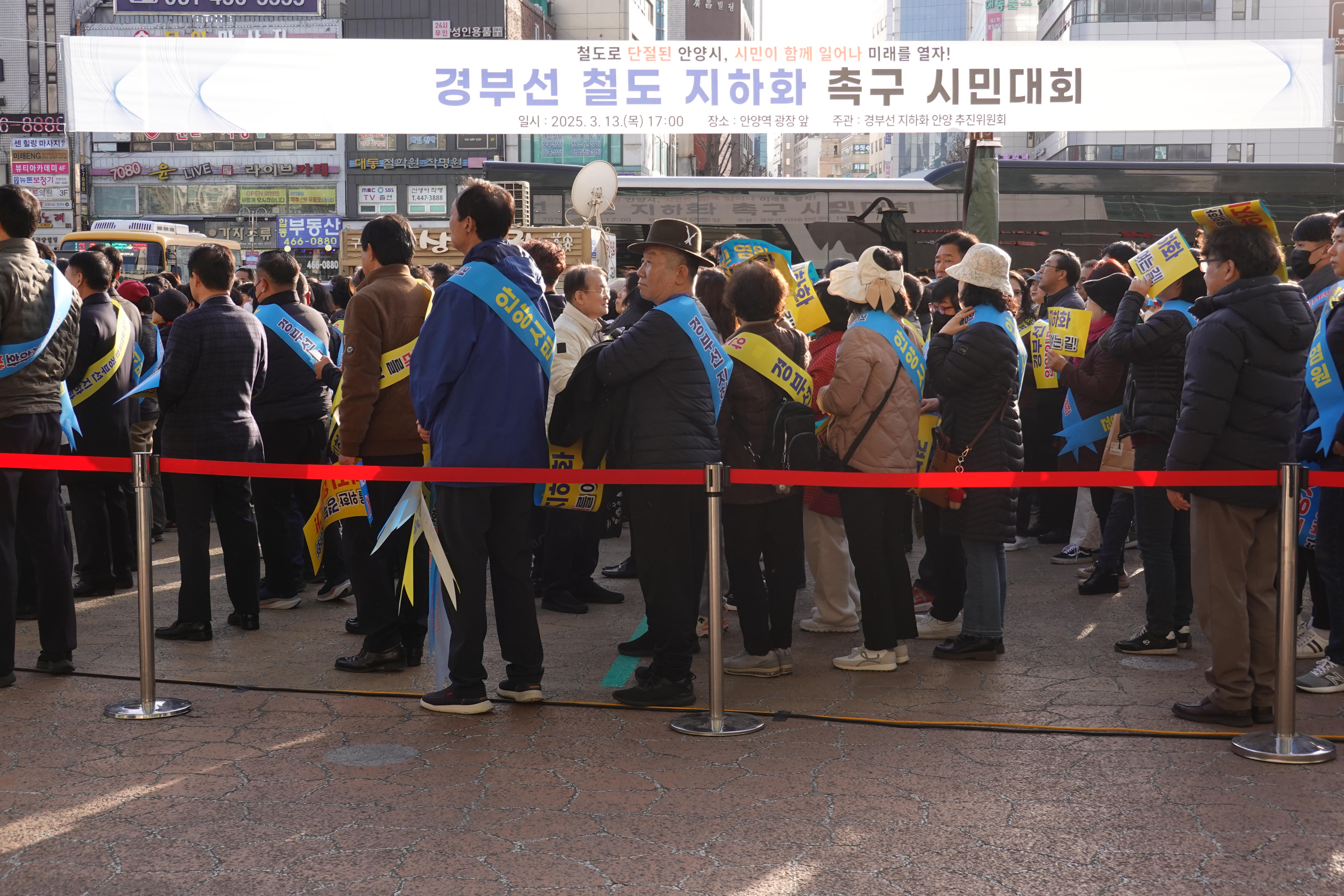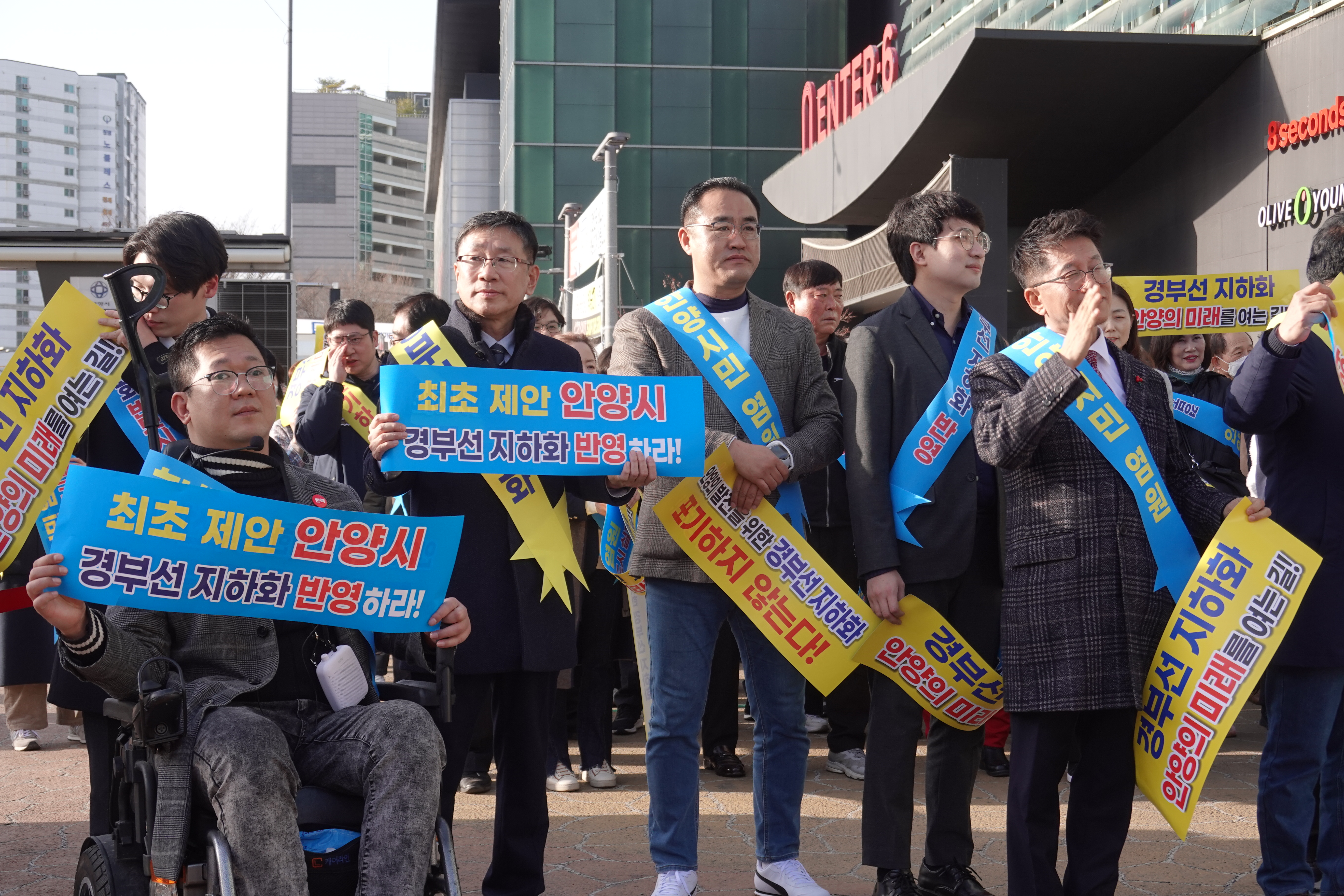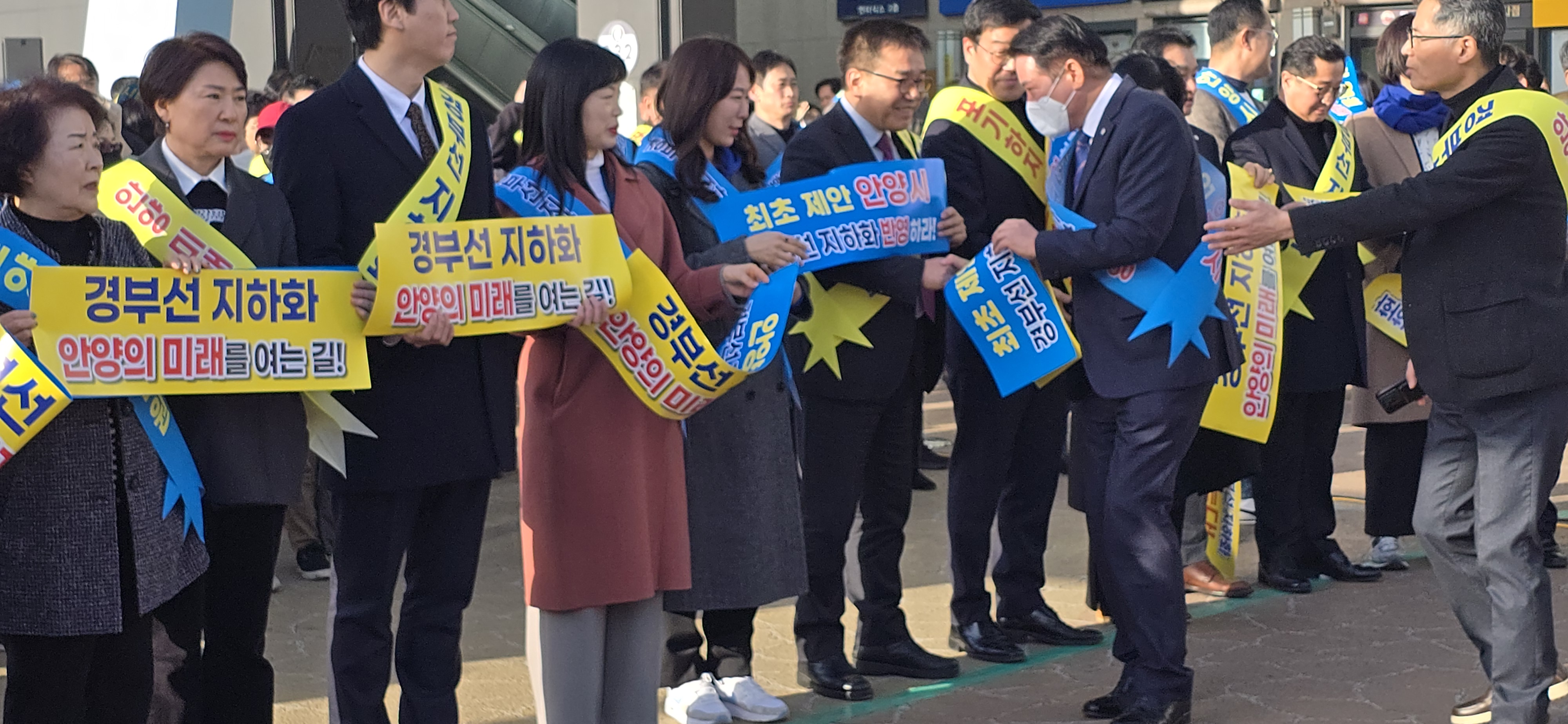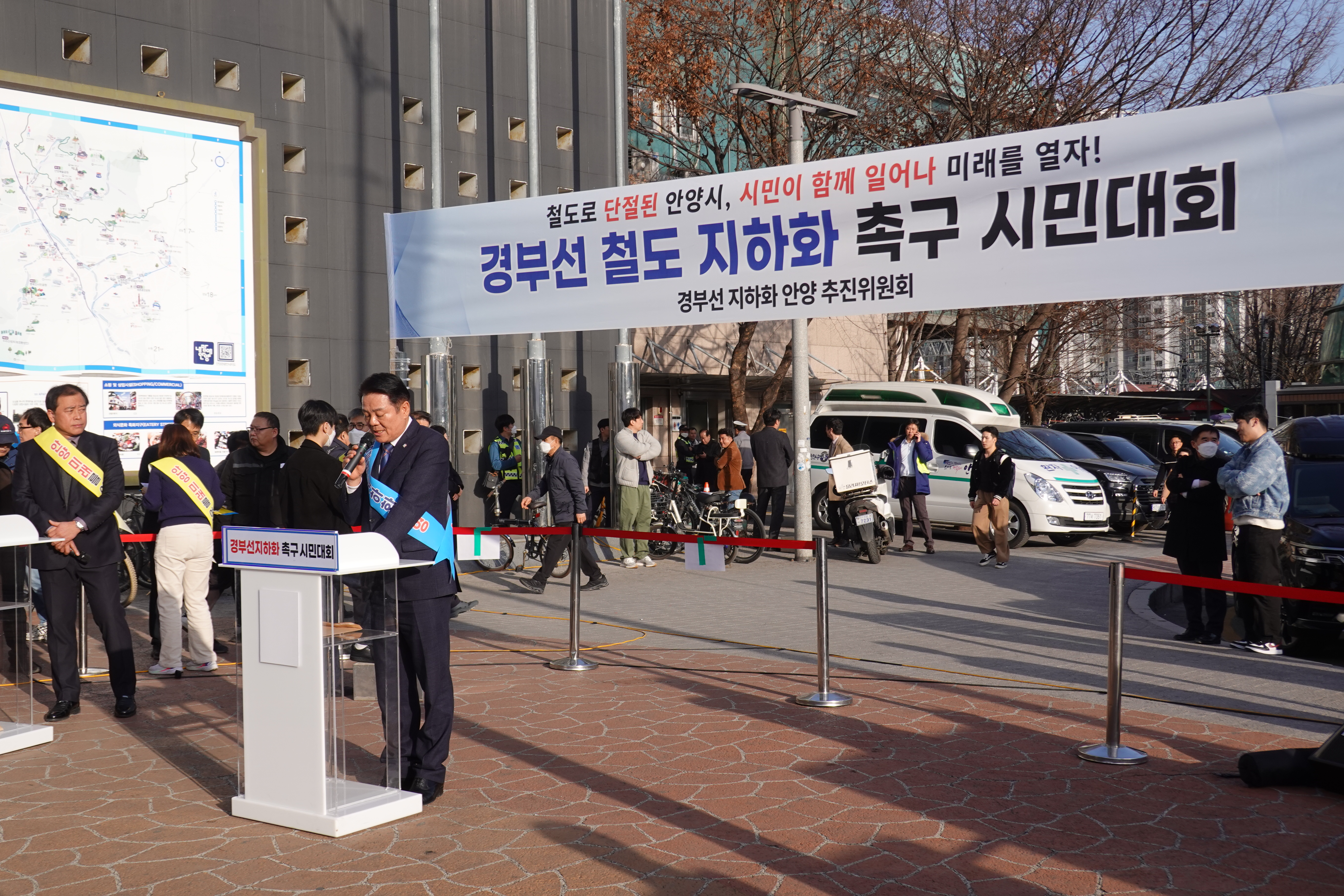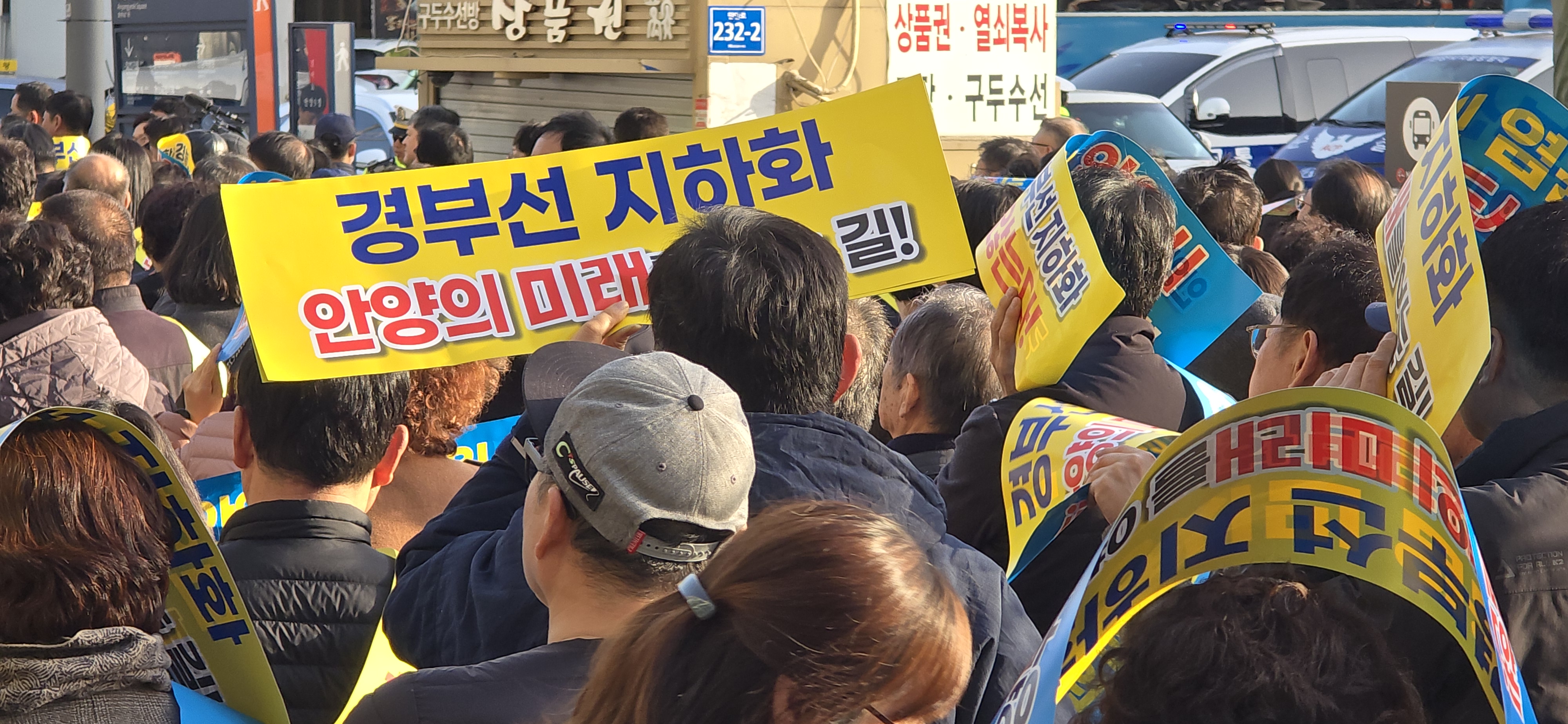경부선 지하화 촉구 시민대회.‘경부선 지하화 안양 추진위원회’(위원장 김의중)가 13일 오후 5시 안양역 광장에서 철도 지하화 촉구 시민대회를 개최했다. 이날 행사에는 최대호 안양시장과 박준모 안양시의장을 비롯 경기도의원, 안양시의원 및 추진위원회와 시민 400여명이 참석해 경부선 철도 지하화의 필요성을 강조하고, 정부의 종합계획 반영을 촉구하는 성명서를 발표했다.