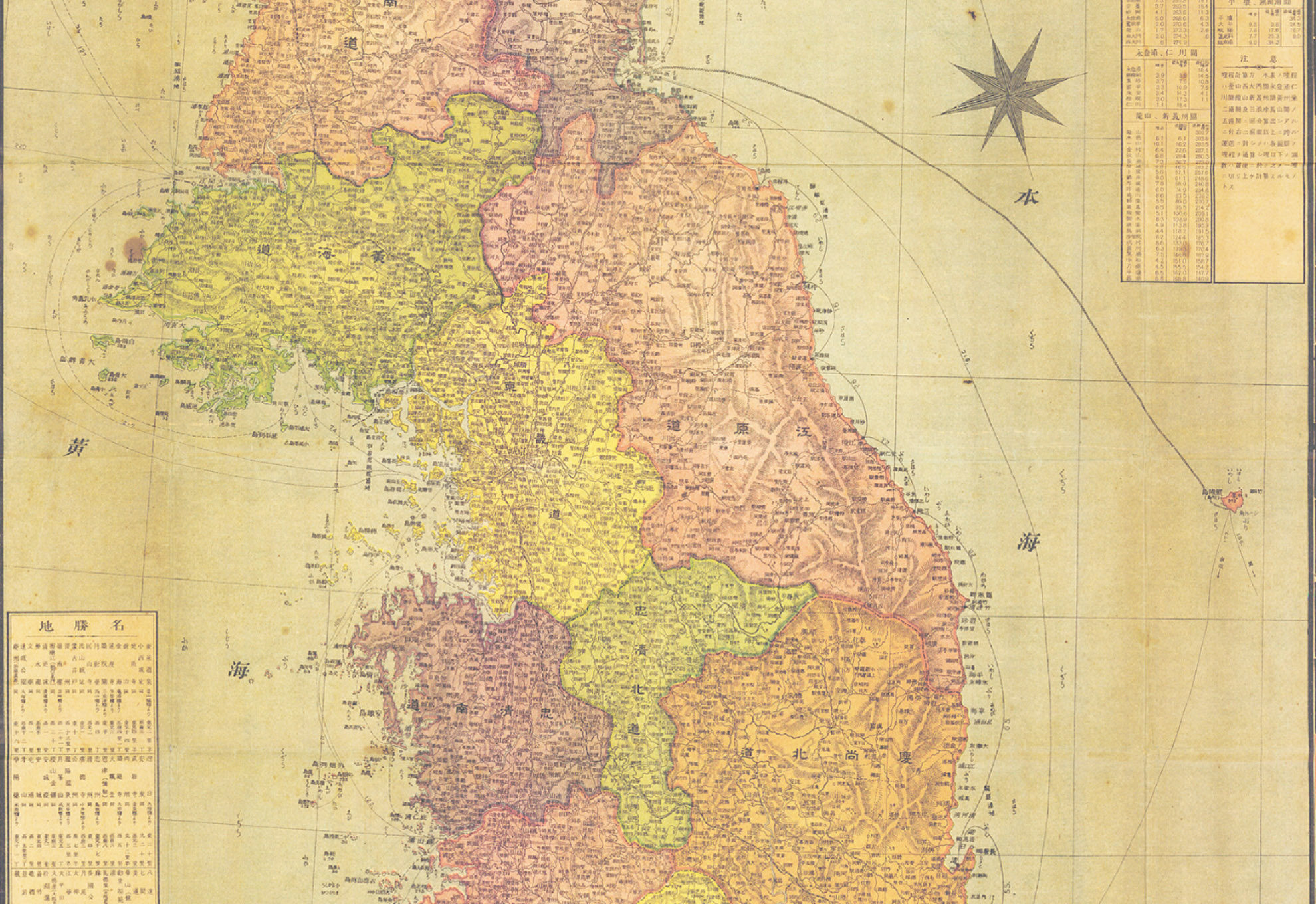이 지도는 만주와 한국 위주의 지도로 산맥을 두드러지게 도식하여 제작된 형태의 지도로 주요지에 대한 도시명과 도로 ,철도노선도를 참조할 수 있으며 범례에는 공통적인 기호와 한국 일본 만주 각각의 주요 관공서 범례 형태를 따로 기재하고 있다.