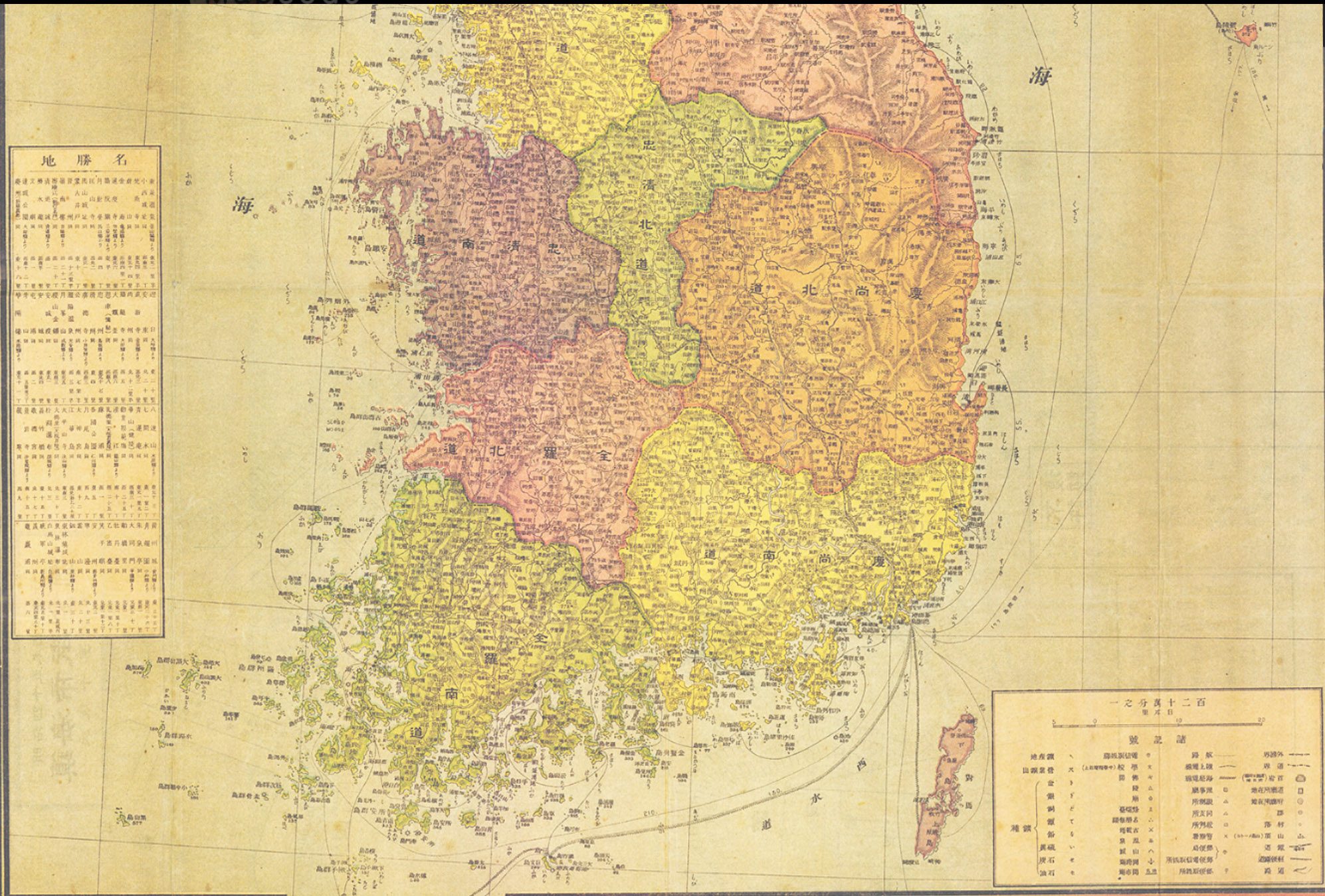 이 지도는 만주와 한국 위주의 지도로 산맥을 두드러지게 도식하여 제작된 형태의 지도로 주요지에 대한 도시명과 도로 ,철도노선도를 참조할 수 있으며 범례에는 공통적인 기호와 한국 일본 만주 각각의 주요 관공서 범례 형태를 따로 기재하고 있다.