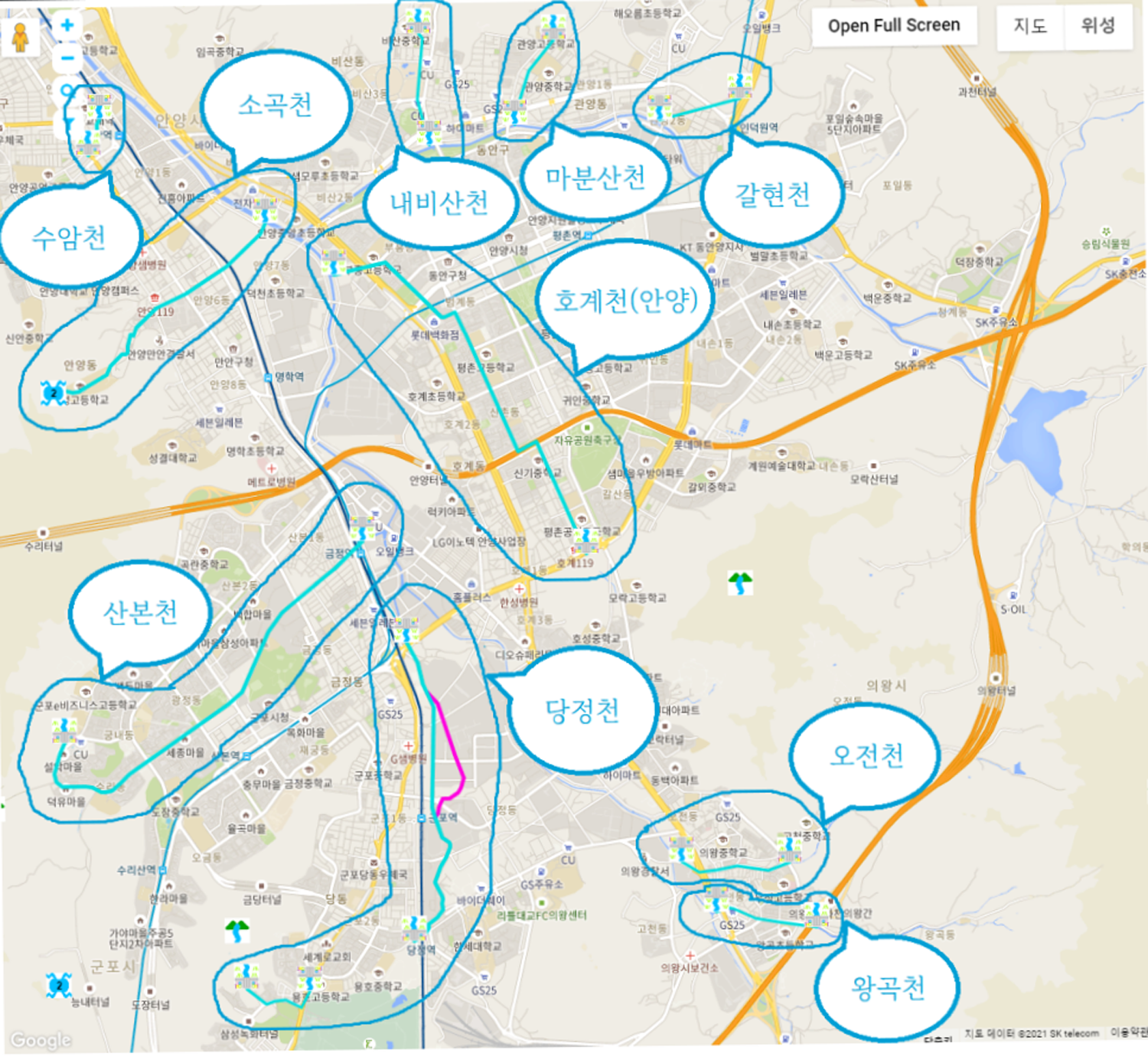 [20251030]안양.군포.의왕 관내 지천과 실개천 지도 안양.군포.의왕시 관내에는 소하천과 실개천이 흐른다. 이들 소하천은 산업화 과정에서 복개됐거나 하수도화 되기도 했다.안양시 관내에는 호현천, 소곡천, 곡내천, 마분산천, 내비산천, 갈현천, 호계천, 임곡천, 창박골천, 내손천, 삼봉천 등 10여개가 넘는 실개천이 흐르며 길이는 17.73km에 이른다. 이야기보따리/자료 2025.10.30