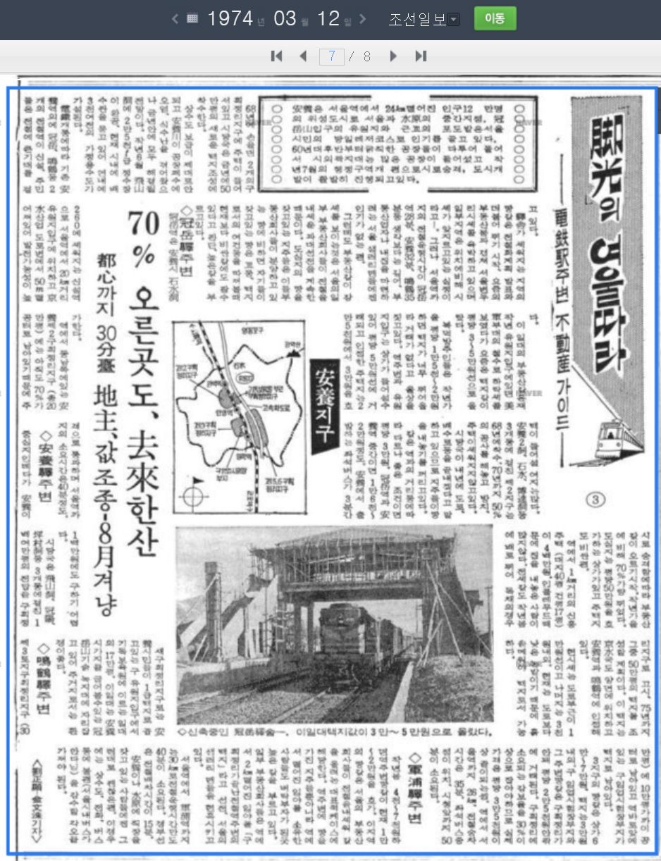 2022.02.26/ #옛신문읽기 #아카이브 #기록 #역사 #응답하라1974 #안양 #군포 #부동산 #지역경제 안양 시승격 당시 1970년대 중반 땅값 평당 3-5만원 수준. 각광의 여울따라 ---전철역 주변 부동산 가이두 3 安養(안양)지구 조선일보 | 1974.03.12 기사(기획/연재) 안양지구 70% 오른 곳도, 거래한산 도심까지 30분대 지주,값조종-8월 겨냥 안양은 서울역에서 24km 떨어진 인구 12 만명의 위성도시로 서울과 수원의 중간지점. 관악산 입구의 유원지와 근교의 포도밭은 서울 시민의 당일 레저코스로 인기를 끌고 있다. 60년대 후반부터 굵직한 공장들이 다. 투어 들어서 시외곽지대는 많은 공장이 들어섰고 작년 7월의 행정구역 개편으로 시로 승격, 도시개발이 활발히 진행되고 있다. 6..