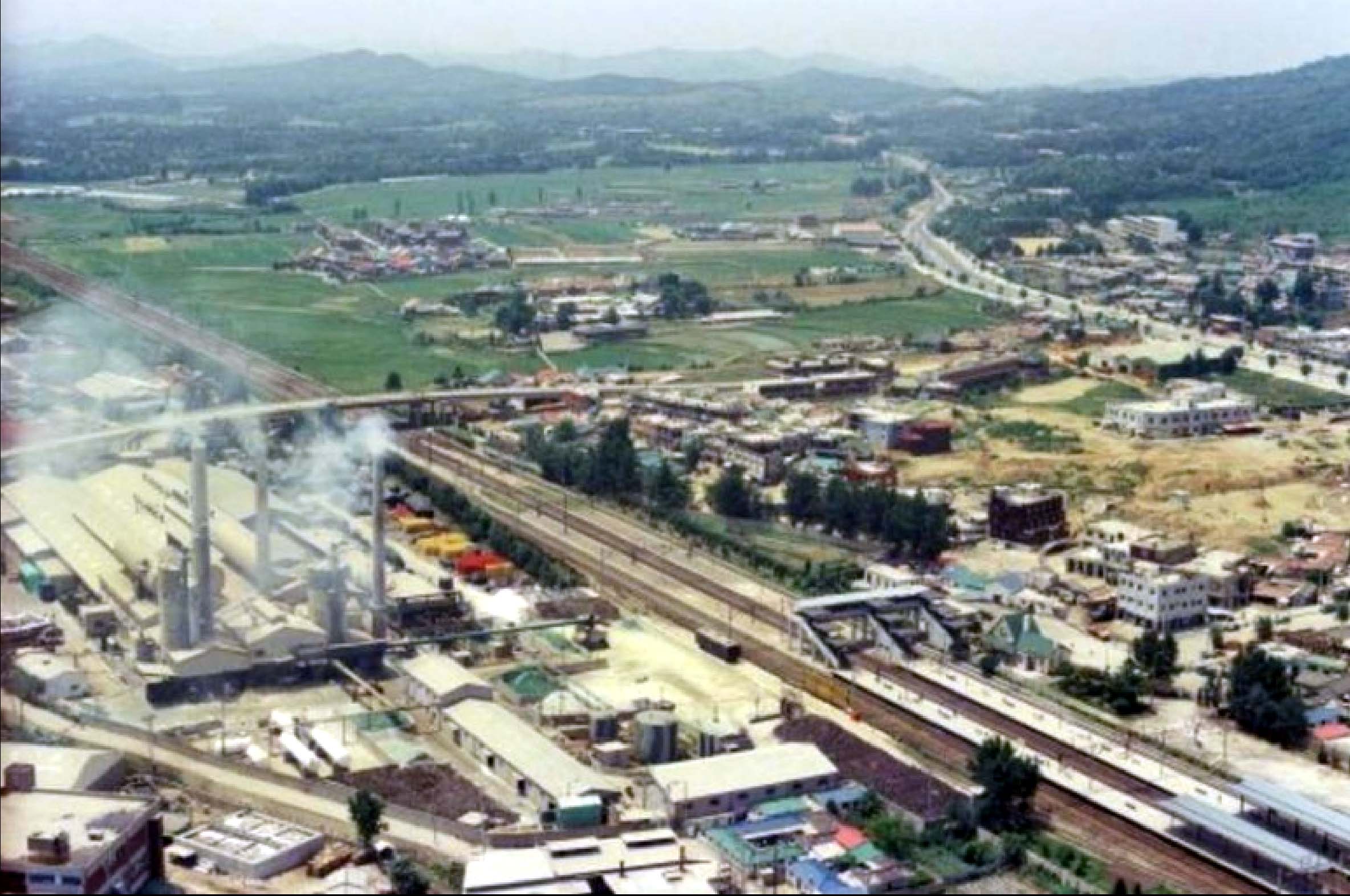 2023.01.11/ #도시기록 #아카이브 #군포역/ 1980년에 찍은 항공사진. 군포역 일대 모습으로 군포1.2동 일대가 한눈에 들어온다. 사진 중간을 지나는 철길과 군포역이 보인다. 군포역 우측의 군포1동 일대 주택가에는 듬성듬성 빈 공터들이 많다. 군포역 좌측의 굴뚝공장들이 있는 곳은 당동공업지역으로 최근 첨단 IT산업단지로의 변신을 위해 꿈틀되고 있다. 군포역 위쪽으로 보이는 고가도로는 당정고가도로이며 그 뒤로 보이는 녹색지역은 삼성의 골프장인 안양컨트리클럽이다.