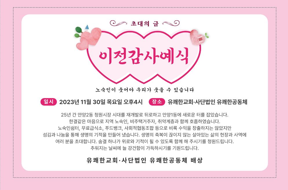 2023.11.26/ #안양 #유쾌한공동체 #이전 #새보금자리/ 안양 구도로(만안로)변 안양2동 청원시장에 자리해 거리 노숙인, 비주택거주자, 취약계층분들과 검김과 나눔을 통해 호흡을 함께했던 유쾌한공동체가 시장의 재개발로 안양1동에 새둥지를 마련해 오는 30일 오후4시 개소식을 갖는다고 합니다. 변함없는 관심과 새로운 곳에서의 새로운 시작을 응원해 주세요. 안녕하세요~ 유쾌한공동체입니다. 2023년 11월 30일 목요일 오후 4시에 저희 유쾌한공동체에서 이전감사예식을 진행합니다. 25년 간 안양2동 청원시장 시대를 재개발로 뒤로하고 안양1동에 새로운 터를 잡았습니다. 한결같은 마음으로 지역 노숙인, 비주택거주자, 취약계층과 함께 호흡하였습니다. 노숙인쉼터, 무료급식소, 푸드뱅크, 사회적협동조합 등으로 ..