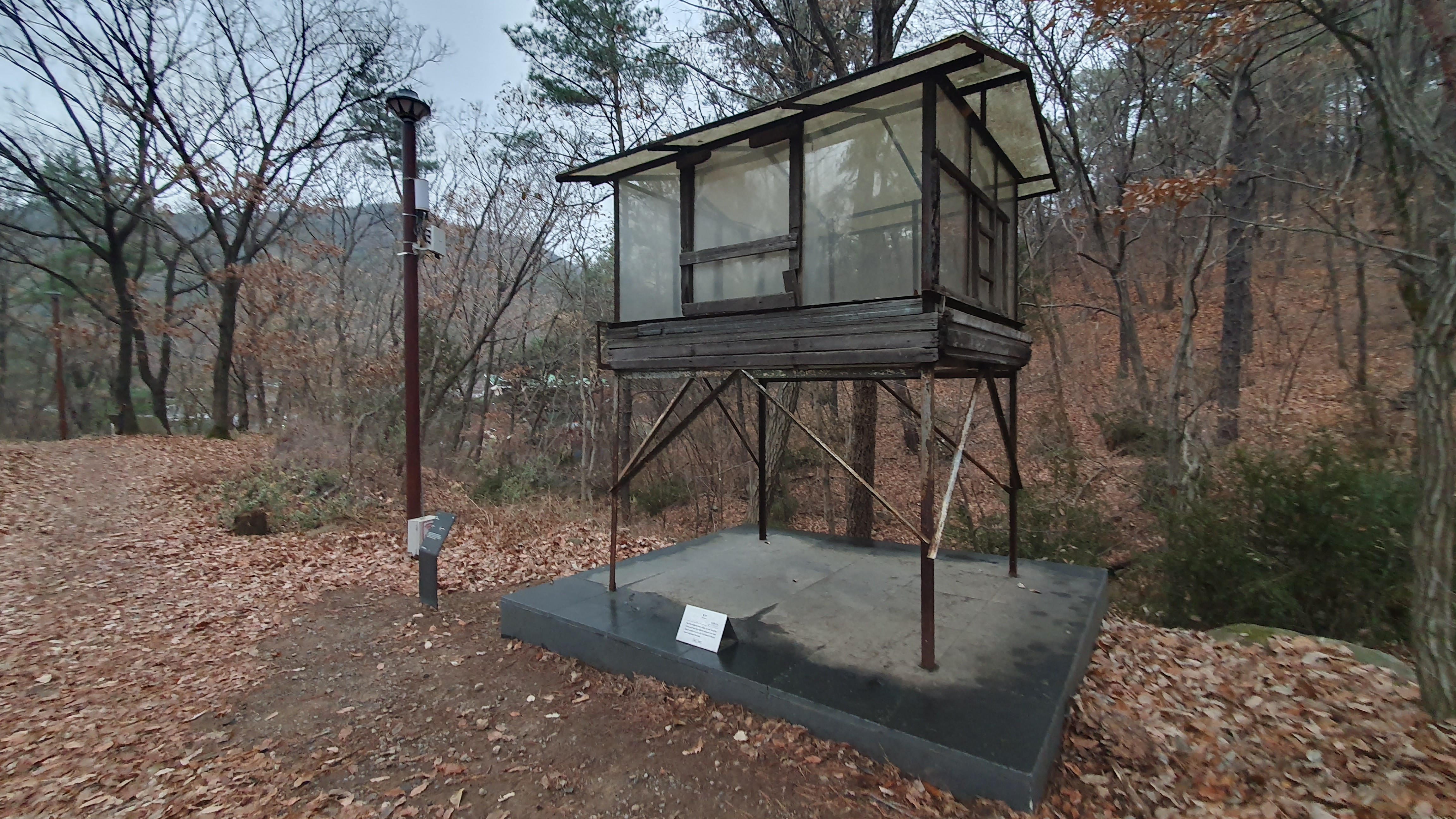 2023.11.29/ #APAP #안양곻공예술프로젝트 #1회작품 #since2005/ 프랑스 작가 장-뤽 빌무트의 [발견]은 APAP 1회 작품으로 안양예술공원 삼성산 눙선 깊숙한 곳에 자리하고 있다. 2005년에 설치된 제1회 APAP 작품들이 설치 18여년이 되면서 노후화등으로 적지않은 작품들이 철거됐음에도 현존하고 있어 반가웠다. 이 작품은 삼성천 곁에 버려진 방갈로를 다시 복원해서 작품을 만들었다고 하는데, 흥미로운 생각이다. 한 때는 손님에게 음식을 제공했던 장소였지만 우리의 기억에서 사라져 폐건물이 되어 버린 것에 다시 생명을 불어넣었다. 그래서 계속해서 이곳의 기억과 역사를 담은 채 머물 수 있게 되어 반갑다.