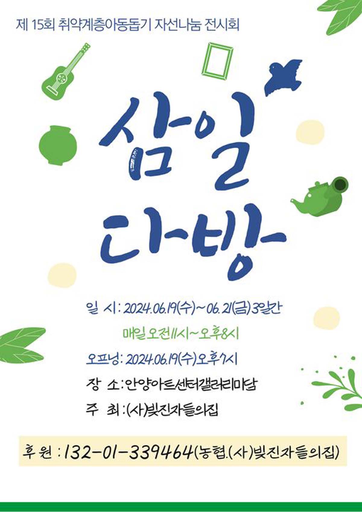 사회문화복지단체 안양 빚진자들의집에서 아이들과 한 해를 잘 지내기위해 매년 기금마련 행사를 연다. 어느덧 열다섯번째를 맞이하는 자선나눔전시회 겸 삼일다방 "하늘새 새봄에 씨앗을 물고"가 오는 6월 19일(오프닝행사 오후7시)부터 21일까지 3일간 안양 아트센터 1층 갤러리 미담에서 열린다. 이를위해 빚진자들의집에서는 지금은 작품, 애장품을 받고 있다. 그림, 도예, 사진, 방짜유기, 조각, 서예, 등 직접 만든 작품, 또는 선물받았는데 사용하지 않은 물건이나 나누고싶은 물건을 기증받고 있다.(문의: 031-441-2888)보내실 곳안양시 만안구 수리산로45, 2층(사)빚진자들의집문의 031-441-2688 자선나눔전시회는 안양, 의왕, 군포지역의 위기, 다문화, 장애, 조손가정 아동들을 돕기 위..