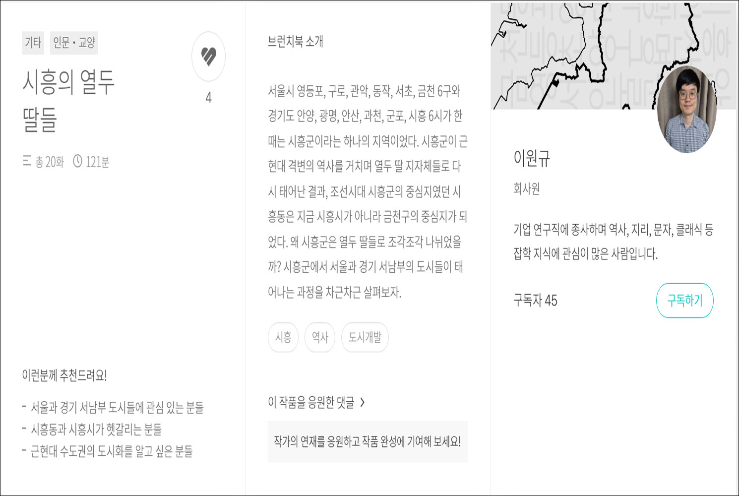 서울시 영등포, 구로, 관악, 동작, 서초, 금천 6구와 경기도 안양, 광명, 안산, 과천, 군포, 시흥 6시가 한때는 시흥군이라는 하나의 지역이었다. 시흥군이 근현대 격변의 역사를 거치며 열두 딸 지자체들로 다시 태어난 결과, 조선시대 시흥군의 중심지였던 시흥동은 지금 시흥시가 아니라 금천구의 중심지가 되었다. 왜 시흥군은 열두 딸들로 조각조각 나뉘었을까? 시흥군에서 서울과 경기 서남부의 도시들이 태어나는 과정을 차근차근 살펴보자. 글쓴이는 기업 연구직에 종사하며 역사, 지리, 문자, 클래식 등 잡학 지식에 관심이 많은 회사원인 이원규님. 사라지고 잊혀지고 왜곡돼 가는 시흥군 지역사에 대해 자세한 조사와 분석과 연구에 감탄과 감사와 더불어 박수를 보낸다. https://brunch.co.kr/brunc..
