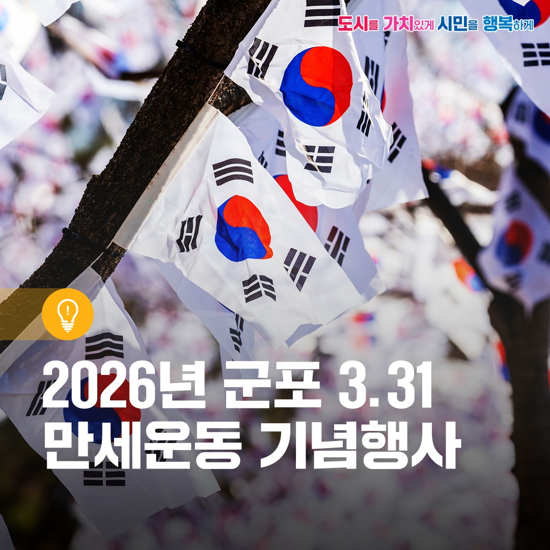 1919년 3월 31일, 군포장(안양 호계동 구사거리)에서 군포역까지 2천여명의 사람들이 행진하며 만세를 외쳤습니다.그날의 숭고한 독립 정신을 계승하고 시민과 함께 화합하는 '군포 3.31 만세운동 기념행사'가 오는 31일 군포역 광장에서 열립니다. 📅 일시- 2026. 3. 31.(화) 14:30~16:00※ 14:30 식전행사(한소리예술단) 및 만세운동 재연행사/ 15:00 기념식🔎 장소- 군포역 앞 광장👨‍👩‍👧‍👦 참여인원- 약 300여명📋 주요내용- 만세운동 재연행사 및 기념식※ 부대행사 : 역사사진 및 공모전 작품 전시, 군포역전시장 이벤트 행사🔎 자세한 내용은 군포시 블로그를 통해 확인하실 수 있습니다!https://blog.naver.com/o2gunpo/2242234730..