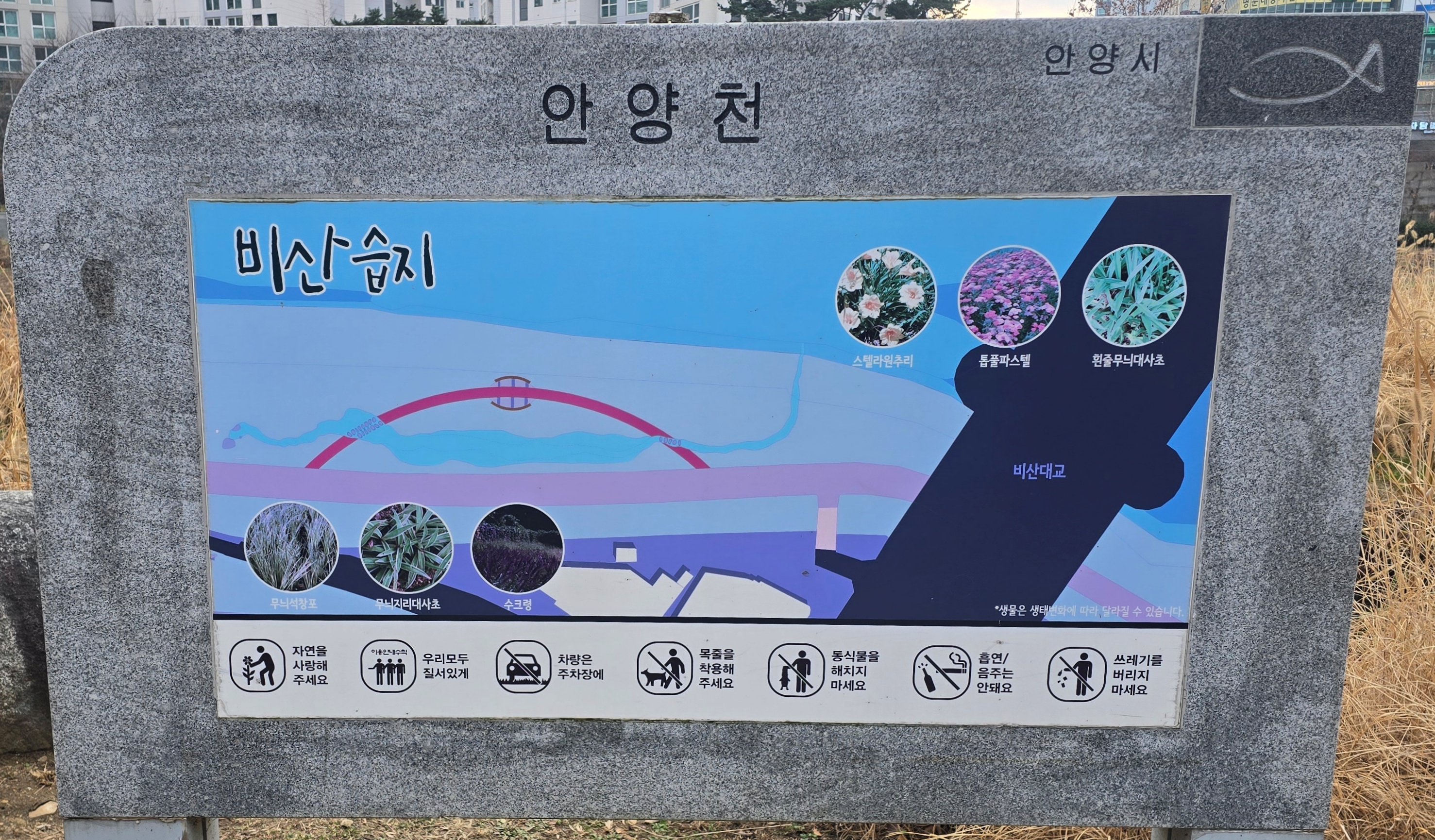 [20251229]안양천 비산대교 아래 쉼터 비산습지 풍경 2025.12.28/ #도시기록 #안양천 #비산습지/ 안양천 비산대교 남단 아래 쉼터 생태계의 보고(寶庫) 습지란 하천이나 연못, 늪으로 둘러싸인 습히고 축축한 땅을 말한다. 'Welland'라는 책에서 습지는 생물의 슈퍼미켓이라 비유되었을 정도로 다양한 생물의 집합소라고 할 수 있다. 또 습지는 탄소를 가장하여 기후변화시키는 하기도 그 중요성이 더 높다.안양에는 안양천에 연현습지, 화창습지, 비산습지 등 3개소. 학의천에 학운습지, 동안습지 등 2개소의 총 5개의 습지가 조성되어 있다. 안양에 있는 습지는 대부분 건조한 천변 고수부지에 조성하여 특정 경관을 개선하고 하천과 육상을 연계하여 하천의 생태적 기능을 강화하고 수질개선과 쉼터의 역할을 하고 있다. 도시사진기록/골목풍경 2025.12.28