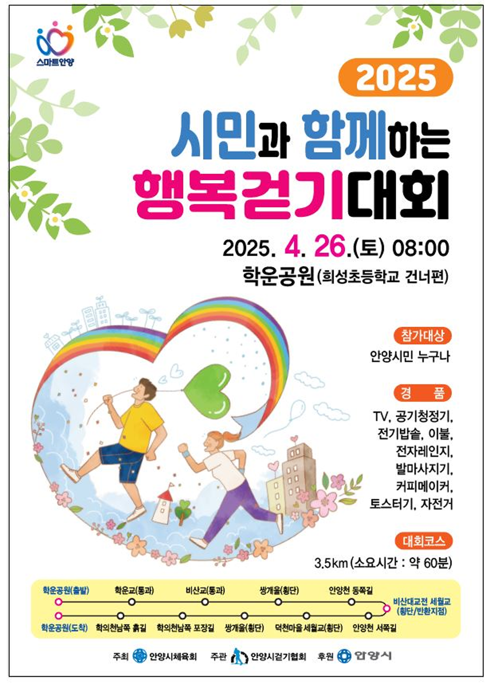 [20250321]안양시 행복걷기대회 봄행사, 4월26일 학운공원 안양시민과 함께하는 행복걷기대회 2025년도 봄행사가 오는 4월 26일 오전 8시 안양 학운공원)희성초교 건너편)에서 개최된다. 안양시체육회가 주최하고 안양시걷기협회가 주관하는 이날 걷기대회는 학운공원 운동장에 집결해 공원산책로(포장길)-학운교(통과)-비산교(통과)-쌍개울세월교-쌍개울문화광장-안양천동쪽둔치길-비산대교전세월교(황단.반환지점)-안양천서쪽둔길-덕천마을세월교(횡단)-쌍개울문화광장-쌍개울세월교-학의천남쪽포장길-학의천남쪽흙길-학운공원(도착)으로 되돌아오는 약 3.5km 코스로 약 1시간 정도 소요된다 대회에는 안양시민 누구나 별도 신청 없이 당일 학운공원에 가벼운 운동복 차림으로 참여할 수 있으며, 걷기를 마치고 운동장에 집결한 후에는 경품권 추첨이 있다. 대회에는 안양시민 누구나 별도 신청 없이 .. 안양지역뉴스/안양 2025.03.20