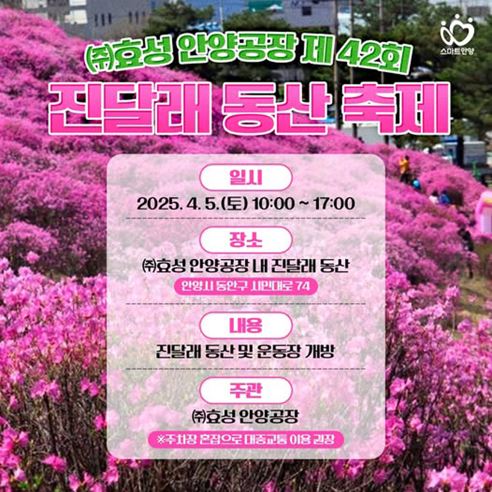 [20250402]효성 안양공장 진달래동산 4월5일 단 하루 개방 안양시 동안구 시민대로 74 명학대교와 안양천변에 자리한 (주)효성 안양공장 내 진달래동산을 핑크빛으로 물들이는 제42회 진달래축제가 오는 4월 5일(오전 10시-오후5시) 단 하루동안 시민에게 개방된다. 효성 안양공장 뒷동산에는 약 1만㎡(약 3000평) 넓이의 진달래 군락이 있어 봄철마다 분홍빛으로 물든다. 1970년대 후반부터 매년 지역 사회에 개방해 왔으며 2019년부터 2022년까지 3년간은 코로나19 확산 방지를 위해 축제가 중단됐으며 지난해(2024년)에는 효성그룹 2세인 조석래 명예회장의 위독한 소식(결국 3월29일 별세)이 갑작스럽게 전해지면서 개방행사가 전면 취소됐다 효성 진달래 축제에서는 꽃구경뿐만 아니라 어린이들을 위한 공연과 놀이, 먹거리와 함께 일일장터도 열린다. 한편 진달래.. 안양지역뉴스/안양 2025.04.02