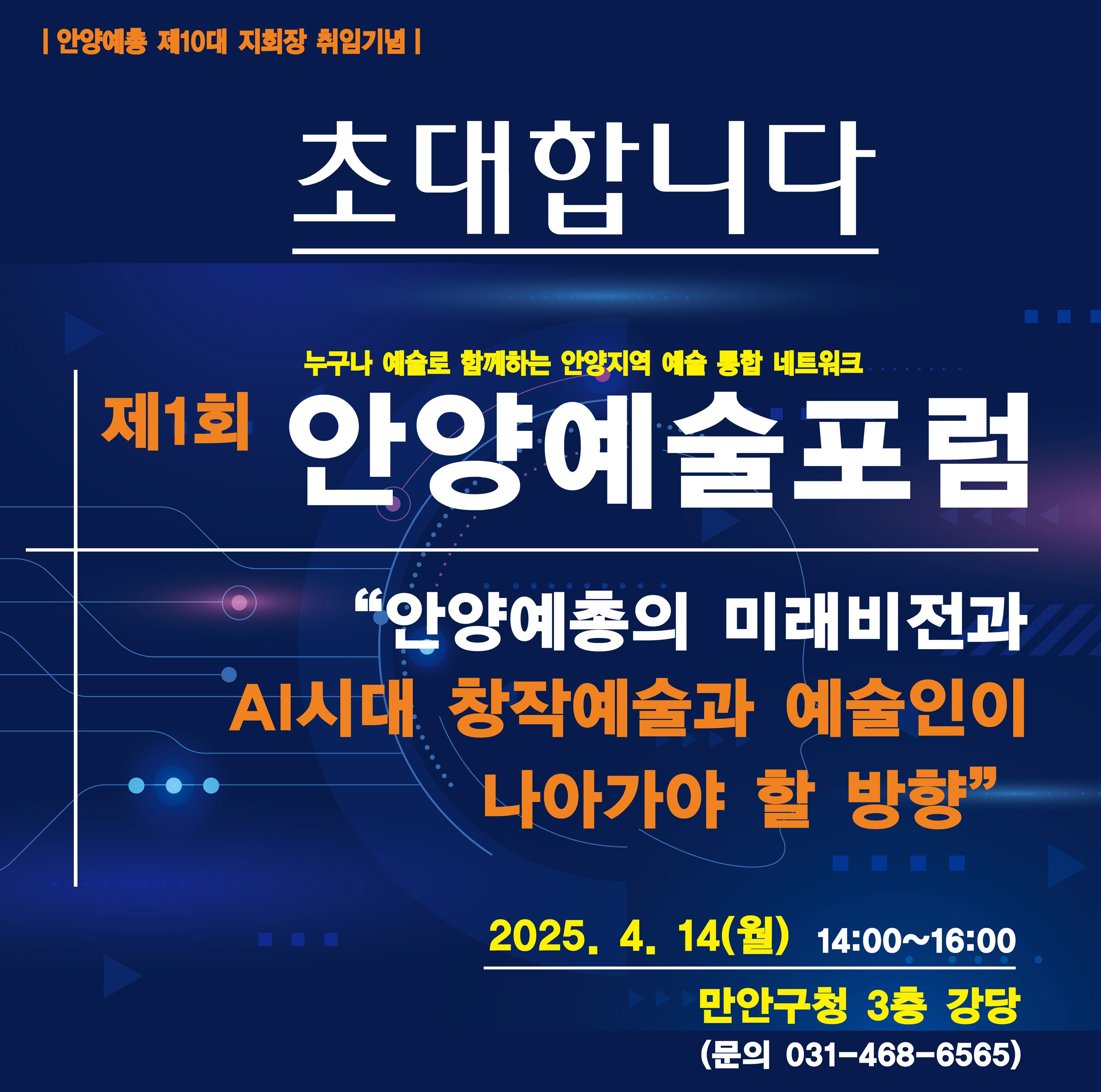 [20250404]안양지역 예술통합네트워크 안양예술포럼 출범 한국예술문화단체총연합회 안양지회(약칭 안양예총)는 오는 14일(월) 오후 2시 만안구청 3층 강당에서 안양지역 예술 통합네트워크인 안양예술포럼(Anyang Art Forum) 출범식과 함께 제1회 안양예술포럼을 개최한다. 안양예술포럼은 안양예총이 안양지역 예술문화의 정체성 확립과 성장 발전을 위해 지역 예 술단체와 예술인 그리고 시민들이 자유롭게 소통하고 협력할 수 있는 네트워크가 필요하다는 인식하에 오랜 기간 준비해 왔으며, 예술포럼을 통해 지역 예술문화 역량의 결집과 협력 강화, 다양한 예술문화 콘텐츠 발굴, 지역 현실에 맞는 예술문화 정책 발굴사업 등을 통해 지역 예술 인들의 권익 보호와 안양예술의 위상을 높이는데 기여할 계획이다. 제1회 안양예술포럼은 2부로 나누어 진행된다. 1부는 안양예술포.. 안양지역뉴스/안양 2025.04.03