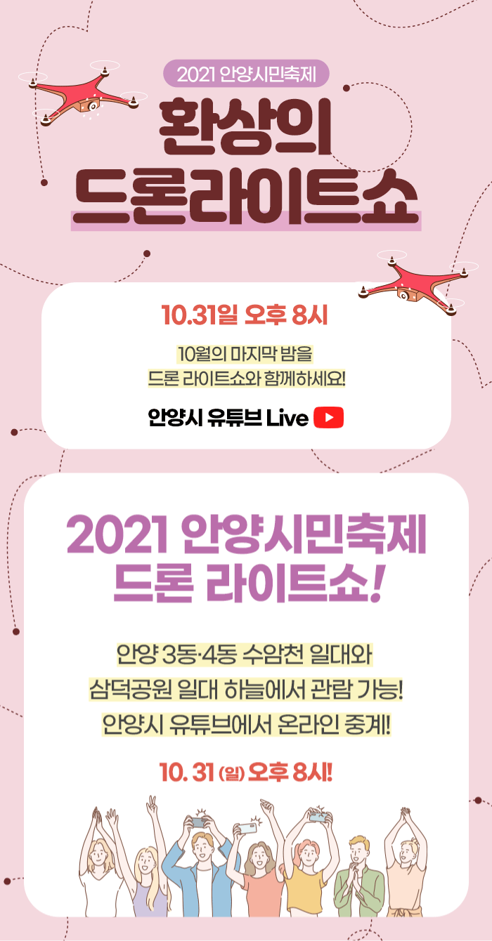 10월의 마지막 밤인 지난 10월31일 8시45분, 안양시 만안구 삼덕공원 하늘에서 드론 라이트쇼가 펼쳐졌다. 온라인으로 진행되고 있는 2021 안양시민축제 우선멈‘춤’프로젝트의 하이라이트인 로 진행된 이날 행사는 300대의 드론이 안양공고 운동장에서 일제히 떠올라 형형색색 하늘을 수놓는 장관을 연출됐다. 드론 라이트 쇼는 의료진, 자원봉사자, 소상공인에게 감사의 메시지를 전달하기 위해‘의료진 덕분에’와 ‘안양시민 덕분에’의 수어를 만들고, 함께 코로나19 극복을 위해 노력한 시민을 위한 하트 모양을 만들어 감사와 응원의 메시지를 전달했으며 ‘스마트 안양’과 ‘안양합니다’글자를 드론으로 만들며, 안양시민을 위한 다양한 볼거리를 제공했다. 삼덕공원과 수암천 일대에는 드론 쇼를 관람하기 위해 시민들이 자리했..