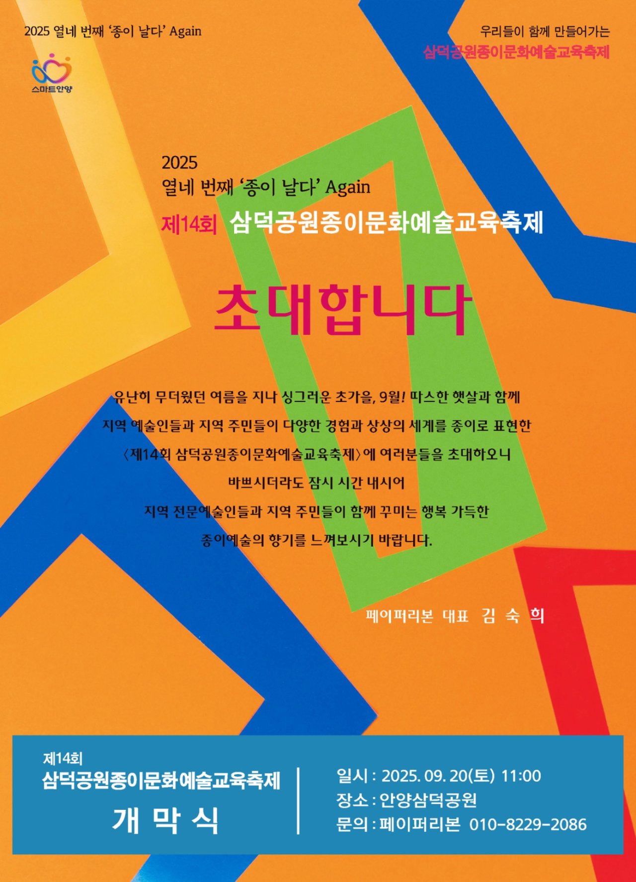 문화예술교육축제 한마당 '20125 열네번째 삼덕공원_종이문화예술교육축제'가 '종이, 날다' Again을 주제로 지난 20일 오전 10시 20분부터 오후 5시까지 과거 제지공장이었던 안양삼덕공원에서 개최됐다. 종이문화 예술교육축제는 도심속 공장 부지를 시민들을 위한 휴식공간으로 기증한 기부자를 예우하고, 환경을 생각하는 취지에서 마련돼 금년에는 페이퍼 리본이 주최하고 페이퍼 리본 축제위원회가 주관했으며 안양시와 안양문회술예술제단이 후원했다. 또 안양예총, 안양과천상공회의소. 재단법인종이문화재단, 종이나라, 안양YMCA, 꿈꾸는교회, 안양중앙인정시장 문광형사업단 등에서 협력단체로 참여하고 지원했다 삼덕공원이 위치한 곳은 안양의 원도심이자 교육기관이 밀집된 지역이다. 지역예술인들은 2008년부터 종이를 생..