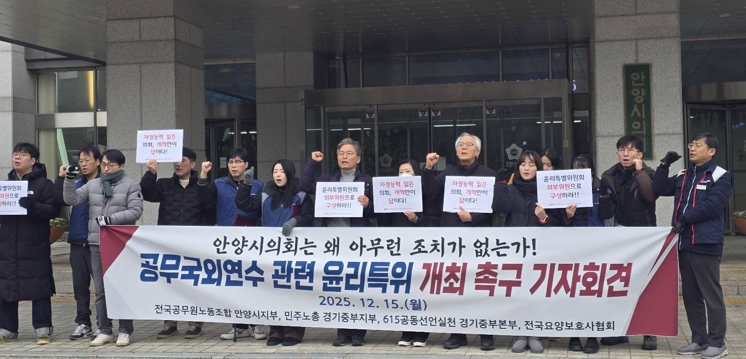 시의회 비리 심사 윤리특위 개최 및 윤리특위 규칙 개정 촉구 기자회견문>공무국외연수 관련 검찰 송치 상황에서 윤리특위조차 열지 않는 안양시의회, 스스로 존재 이유를 부정하고 있다! 최근 안양시의회의 공무국외연수 과정에서 다수의 시의원들이 비리관련 의혹으로 검찰에 송치된 것은 시민사회와 공직사회 모두에 큰 충격을 주었다. 공공성·청렴성을 바탕으로 운영돼야 할 지방의회가 해외연수 제도를 악용했다는 의혹을 받고 있다는 사실만으로도, 안양시 민주주의의 근간을 흔드는 심각한 사안이다. 또한, 성실하게 근무하던 공무원들을 파견받아 의정활동 과정에서 그들에게 막대한 피해를 끼치고도 보호방안도 반성의 기미도 없다. 그러나 더욱 심각한 문제는, 이러한 사태에도 불구하고 안양시의회가 자체 윤리자정기구인 윤리특별위원회를 ..