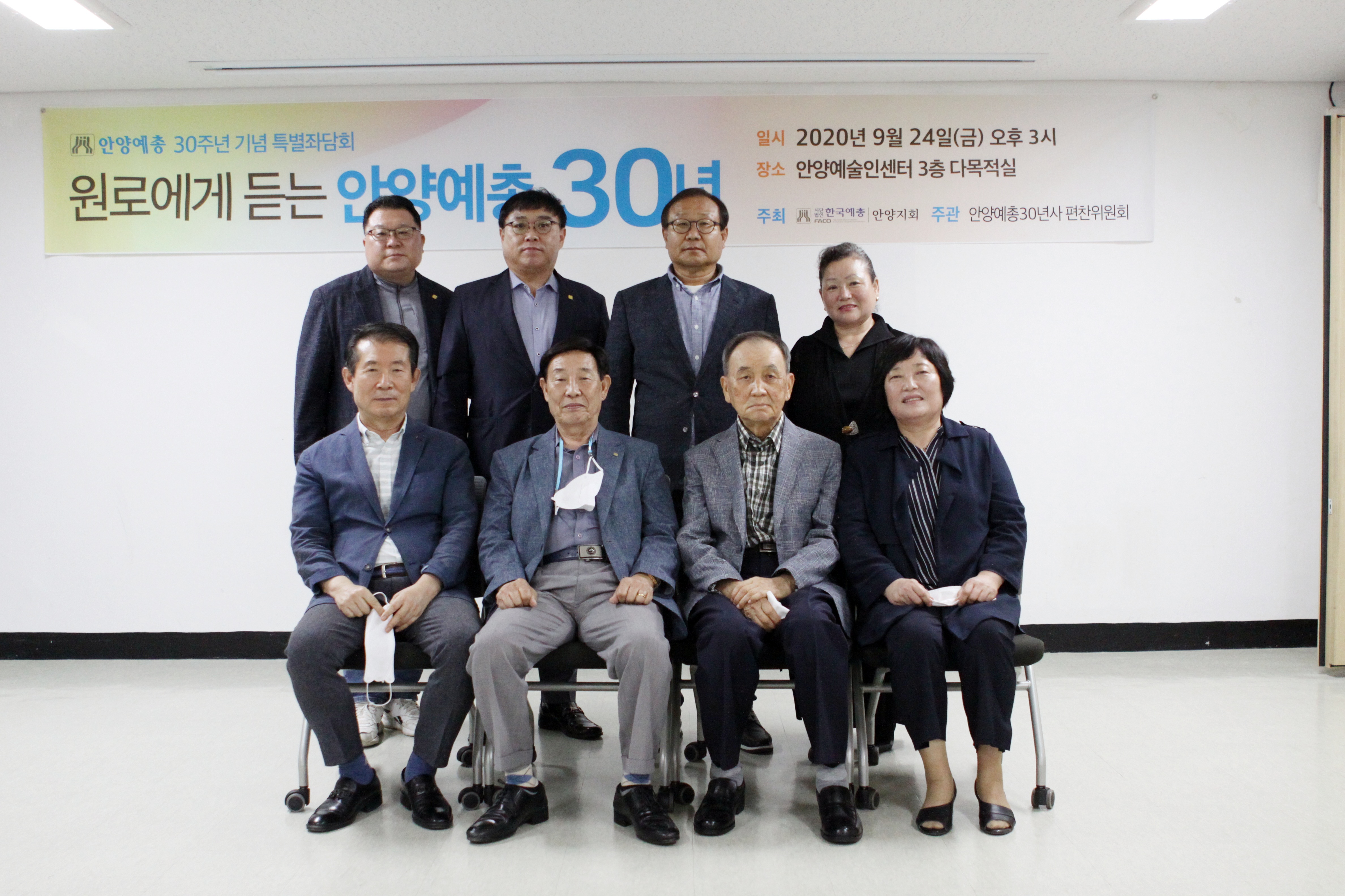 [안양예총 30주년 기념 특별좌담회] 원로에게 듣는 안양예총 30년 어느덧 안양예총이 창립 30주년을 맞았다. 이번 특별좌담회는 『안양예총 30년사』 편찬 사업의 일환으로 마련되었다. 특별좌담회를 통해 그동안 지역 문화예술의 현장 곳곳에서 안양예총과 함께했던 원로들을 통해 안양예총이 걸어왔던 30년의 발자취를 꼼꼼히 조명해 보고 앞으로 안양예총이 지역 문화예술을 위해 나아가야할 방향에 대한 원로들의 고언들을 모아 안양예총 30년사에 담아보고자 한다. ◦ 일 정 : 2020년 9월 24일(목) 오후3시 ◦ 장 소 : 안양예총 회의실 ◦ 대 담 자 : 이재옥 안양예총 회장(진행), 박형만 안양예총 사무국장(사회) 최계식 안양문협 고문, 오용길 안양미협 고문, 안희진 안양국악협회 고문, 천진철 안양예총 고..