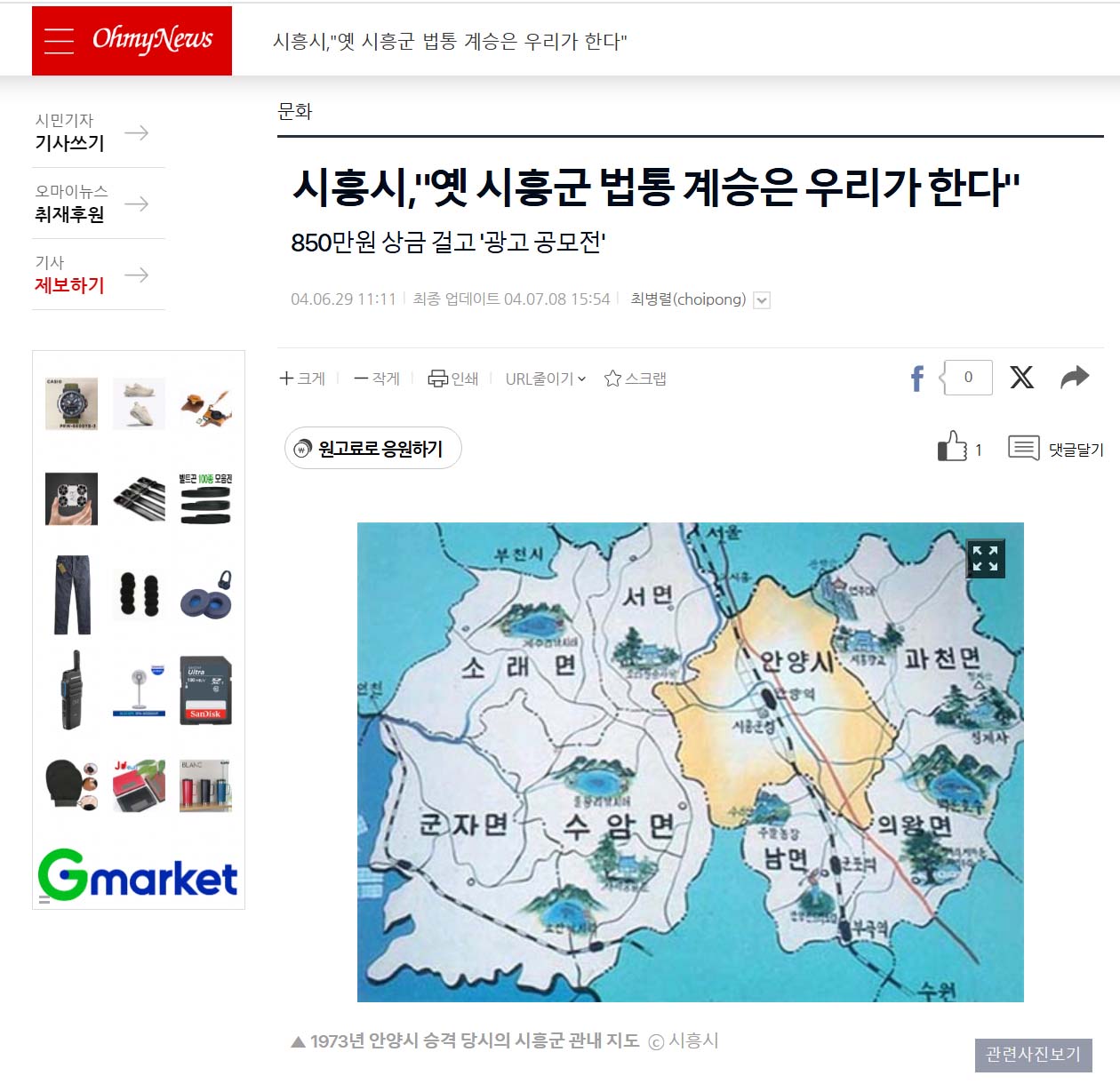 기시 원문보기https://www.ohmynews.com/NWS_Web/View/at_pg.aspx?CNTN_CD=A0000194594 시흥시,"옛 시흥군 법통 계승은 우리가 한다""경기도 시흥시를 아십니까?" 인구 38만의 시흥시가 정체성 확립과 대외적으로 시흥에 대한 인지도를 높이고 상업광고 매체를 이용한 이미지 홍보를 위해 '와우시흥 광고 공모전'을 실시한다. 시www.ohmynews.com 문화시흥시,"옛 시흥군 법통 계승은 우리가 한다"850만원 상금 걸고 '광고 공모전'04.06.29 11:11l최종 업데이트 04.07.08 15:54l 최병렬(choipong) 큰사진보기1973년 안양시 승격 당시의 시흥군 관내 지도 ▲1973년 안양시 승격 당시의 시흥군 관내 지도 ⓒ 시흥시관련사진보기 "경..