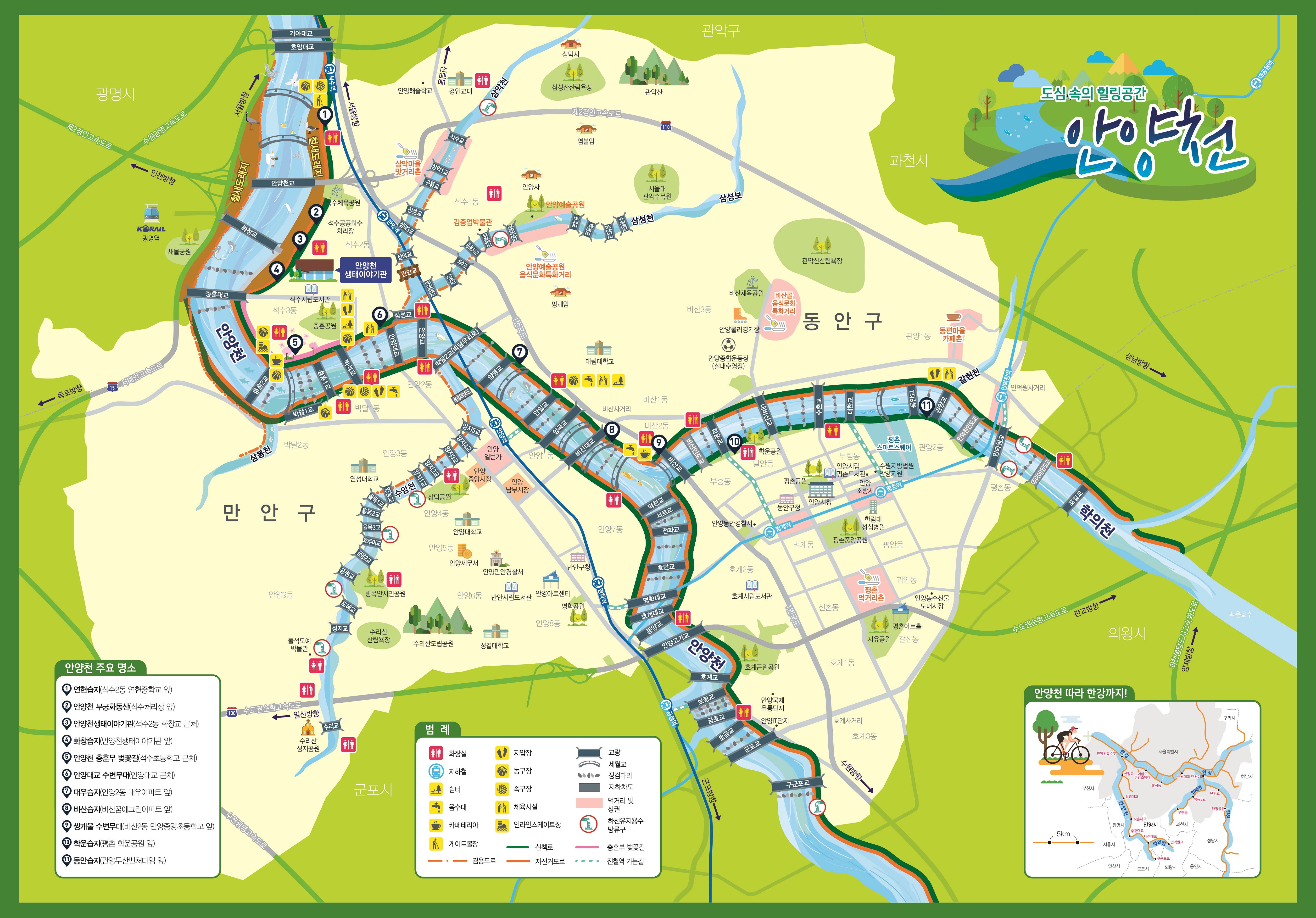 안양천(安養川)은 은 한강의 제 1지류로, 경기도 의왕시 지지대 고개에서 발원하여 군포시를 경유, 안양시 도심을 중앙으로 관류하여 광명, 서울시를 거쳐 한강에 유입되는 도시형 하천이다. (자료에 따라 발원지가 의왕시 지지대개와 백운산, 과천시 청계산, 안양 삼성산 등으로 표기되기도 한다) 안양천의 유역면적은 286㎢, 하천연장이 32.5㎞ 로 비교적 큰 규모이며, 학의천, 삼성천, 수암천, 삼막천, 오전천, 산본천 등 대소 지천이 있다. 안양시 안양2동을 지나는 경부선 안양교를 경계로 상류는 경기도 관할 지방하천이며, 하류는 국가하천으로 지정됐다. 안양천 유역에는 경기도 7개시(안양시, 군포시, 의왕시, 광명시, 시흥시, 과천시, 부천시)와 서울시 7개구(관악구, 구로구, 금천구, 동작구, 영등포구,..