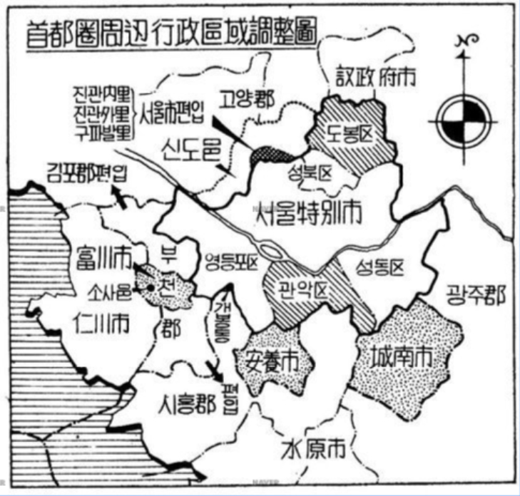 [20230328]1973년 안양 시 승격 당시 행정구역 개편 지도 2023.03.28/ #아카이브 #옛지도읽기 #안양 #시승격 #since1973년 #만문누리/ 2023년은 안양시가 1973년 읍에서 시로 승격한지 50주년이 되는해로 만문누리 차원에서 관련 자료들을 발굴하고 있다. 이 지도 그림은 1973년 안양읍이 시로 승격될 당시 동아일보 1면에 실렸던 지면(1973.03.01일자)에 그려진수도권 행정구역 개편 삽화다. 타임머신/옛지도읽기 2023.03.28