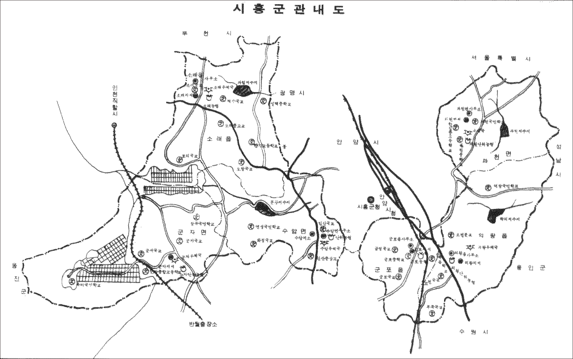 [20230323]1989년 소멸된 옛 시흥군의 1975년 관내도 2023.03.23/ #아카이브 #옛지도 #시흥군 #1975년/ 1989년 소멸돼 사라진 시흥군의 1975년 무렵 관내도. 1975년 발행된 제15회 시흥군 통계연보에 실린 자료이다. 시흥군(始興郡)은 1895년부터 1988년까지 존재했던 경기도의 행정 구역으로 가장 번창했을 당시 안양시 중앙동(현 안양일범가)에 군 청사가 자리했었으며 소멸 직전에는 안양6동 현 만안평생교육센터 자리에도 잠시 있었다. 원래의 시흥군은 현재의 서울특별시 금천구 시흥동에 군청을 두고, 서울특별시 금천구를 중심으로 영등포구(양화동 제외) · 관악구(남현동 제외) · 동작구 일부(신대방동, 상도동) · 구로구 동부(안양천 동쪽)와 경기도 광명시(옥길동 제외) · 안양시 일부(석수동, 박달동)를 관할구역으로 하였다. 1914년 4.. 타임머신/옛지도읽기 2023.03.23