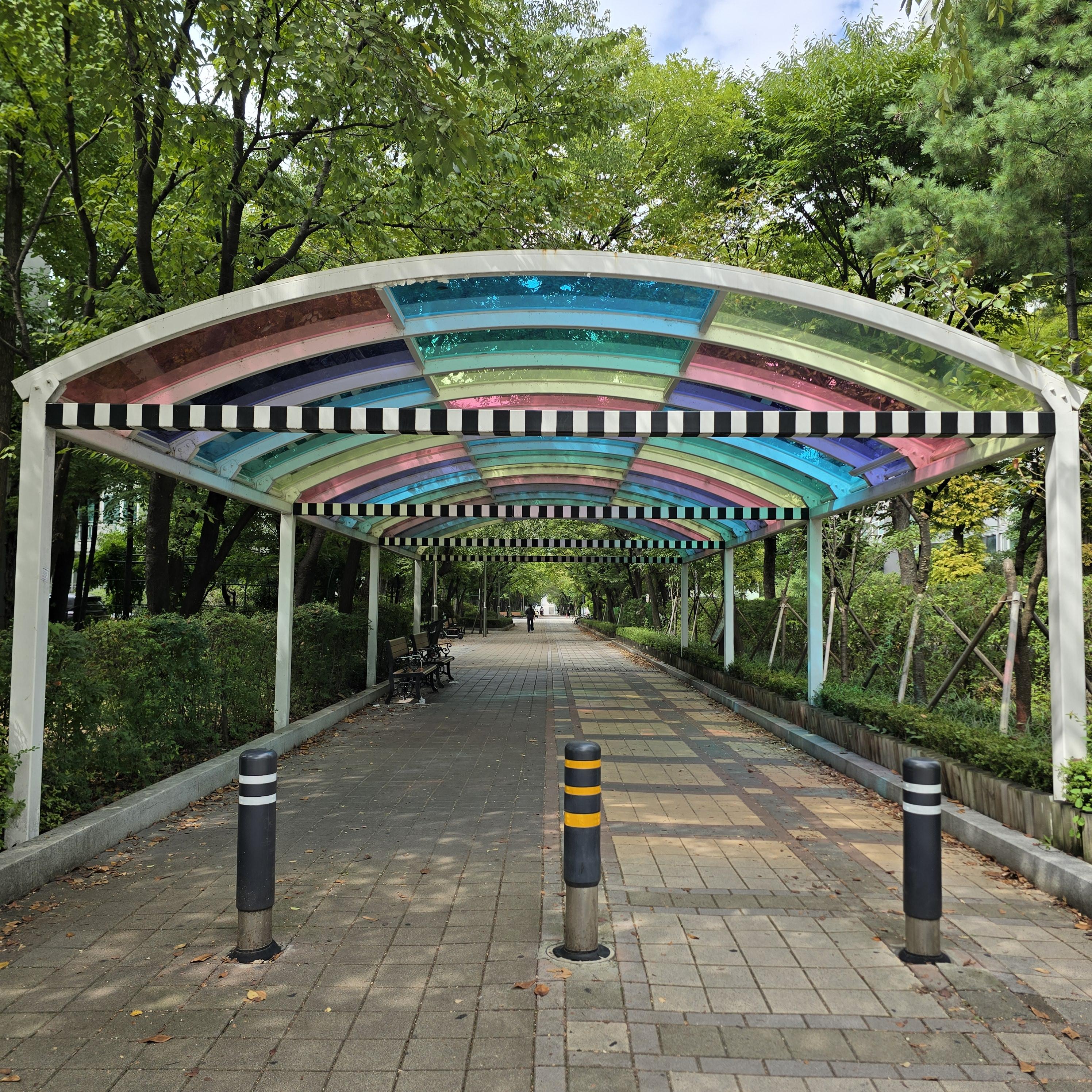 2024.09.19/ #도시기록 #APAP #안양 #평촌 #샛별아파트 #사잇길 #다나엘_뷔렝 #오색찬란한_하늘아래_산책길/ 안양공공예술프로젝트(APAP) 작품중 하나로 프랑스 작가 다니엘 뷔렝의 오색찬란한 하늘 아래 산책길>이다. 위치는 동안구청 근처의 샛별마을(평촌 샛별 1로)에 있다. 아파트단지 사잇길에 있던 장미넝쿨 터널을 제거하고 설치한 작품으로, 색유리로 만들어 일년 내내 선명한 색을 통로에 비춘다. 줄무늬 띠 작품으로 유명한 작가는 특정한 공간에 작품을 설치하고 개입하여 관람자가 인식하지 못했던 요소들을 보여주는 작업들을 지속해 왔다. 다니엘 뷔렝이 처음 스케치한 형태는 반원 모양이었으나, 이후 기존 구조물과 유사한 2.5 m 높이의 기둥 위에 둥근 지붕을 얹은 형태로 디자인을 변경했다...
