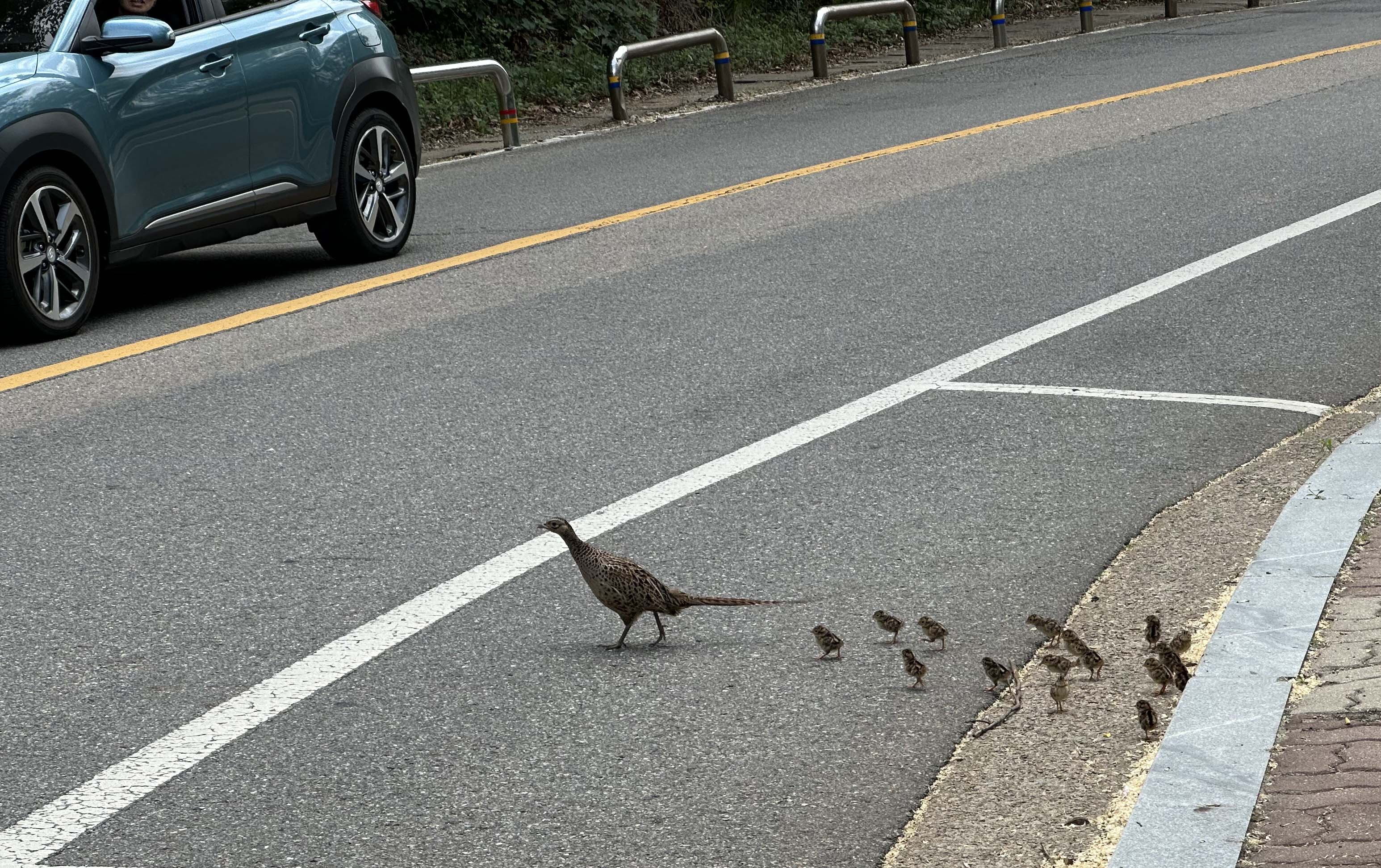 [20230522]꿩 가족(엄마와 새끼들)의 경인교대앞 도로 무단횡단