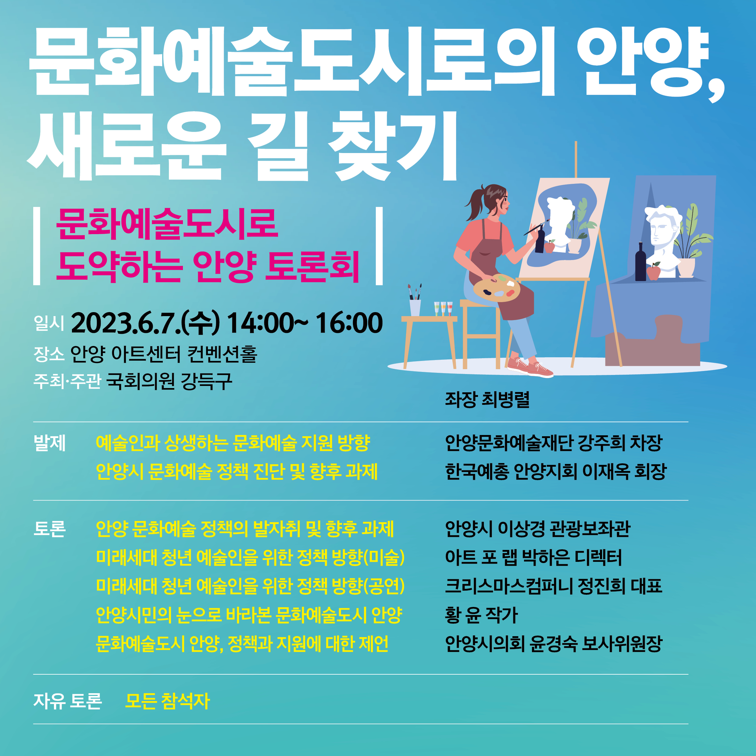 지난 7일 오후2시 안양아트센터 컨벤션홀에서 개최한 예술도시로의 안양, 새로운 길 찾기’ 토론회 자료집(PDF파일)이다 이날 토론회는 문화예술도시 안양의 위상을 찾기 위한 진단과 대안을 모색하기 위해 강득구의원(더불어민주당 안양만안)이 마련했다. 토론회에는 강득구 국회의원을 비롯 최병일 안양시의장과 시의원들, 안양문화예술재단 박인옥 대표, 천진철 경기예총 회장, 이재옥 안양예총 회장, 안양시 관련 부서 공무원, 안양시 청년 예술인과 문화예술에 관심있는 안양시민 등이 참석했다. 이날 토론회의 첫 번째 발제는 안양문화예술재단 강주희 차장이 ‘예술인과 상생하는 문화예술 지원 방향’을 주제로, 두 번째로는 한국예총 안양지회 이재옥 회장이 ‘안양시 문화예술 정책 진단 및 향후 과제’ 를 중심으로 발표했다. 이어지..