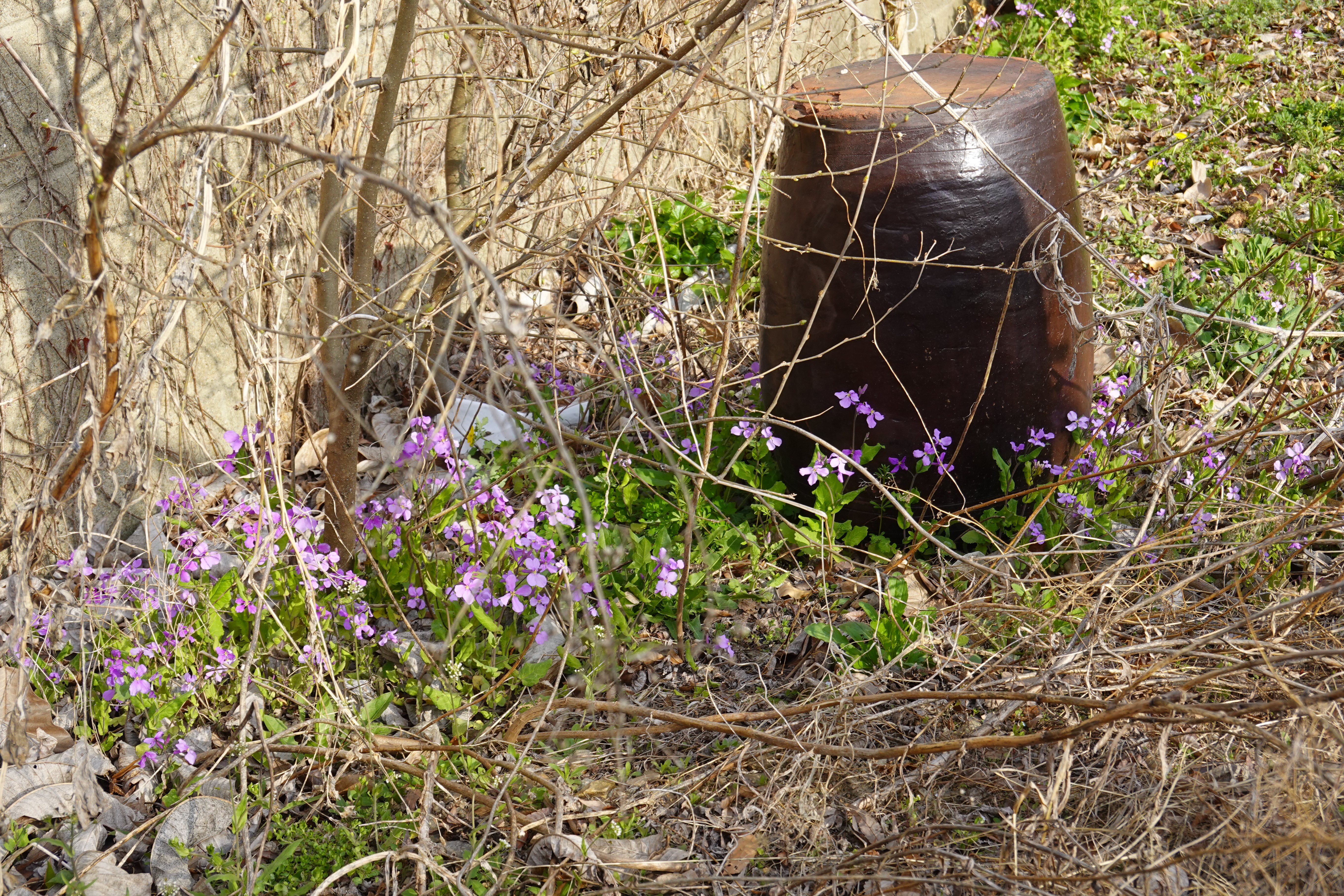 2023.04.10/ #도시기록 #소래풀 #담배촌 #안양9동 #수암천/ 안양 수암천 상류 담배촌 초입 어느 민가 담벼락 텃밭에서 소래풀(보라유채꽃)을 발견하다. 안양천 지천중 하나인 수암천 연계 지역에서 보기는 처음이다. 주변 물가에도 있겠거니 하고 찾아보았지만 같은 지역 수암천변에서는 발견하지 못했다.