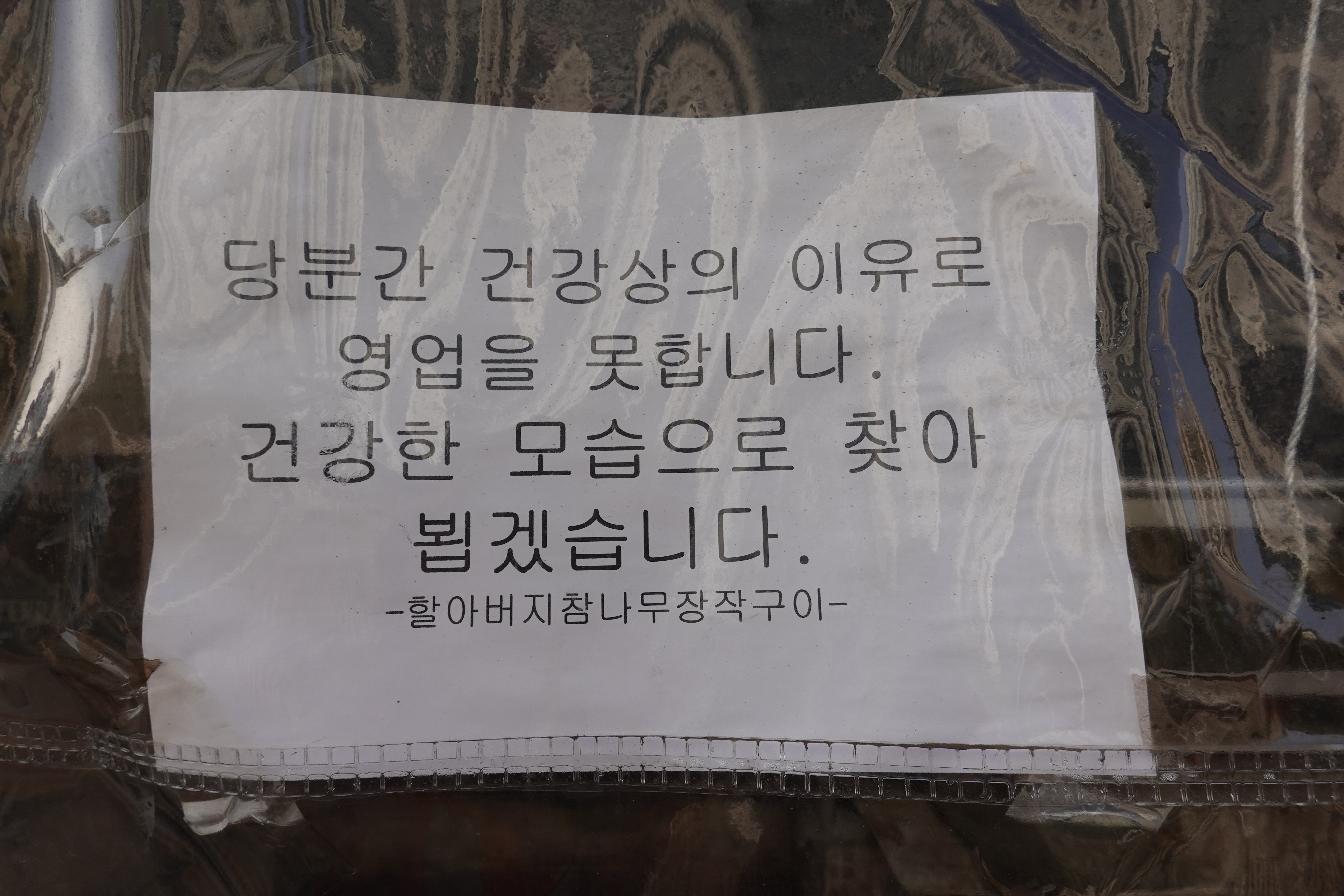 2023.04.10/ #기록 #할아버지참나무장작구이 #안양3동 #통닭맛집/안양9동 담배촌 계곡으로 도롱뇽 산란을 확인하고 내려오던길. 간만에 맜있는 장작구이 통닭을 맛볼까하고 들렸더니 문이 잠겨 있네요. "당분간 건강상의 이유로 영업을 못합니다. 건강한 모습으로 찾아뵙겠습니다." 노인장 두 내외분이 오손도손 운영하셨는데... 마음이 안쓰럽네요. 문앞 부착된 메모지에는 손님들이 손글씨로 쓴 걱정과 완쾌를 기원하며 응원하는 글들이 적혀있다. "빠른 쾌유를 기원합니다."