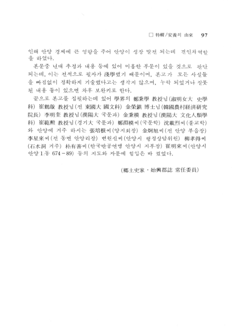 끝으로 본고를 집필하는데 있어 학계의 정병학 교수님(숙명여대 사학과) 최혁수 교수님(전 동국대 국문과) 김영진 박사님(한국농촌경제연구원 연구원장) 이명규 교수님(한양대 국문과) 김병모 교수님(한양대 문화인류학과) 최범훈 교수님(경기대 국문과) 장힘한씨(국문학) 심멸렬씨(불교학)와 안양에 거주 하시는 장배근씨(양지회장) 김형욱씨(전 안양 부읍장) 이성래 씨(전 동면 안양리장) 변원신씨(안양시 ,행정상담위원) 유효득씨(석수동 거주), 박유선씨(한국반공연앵 안양시 지부장) 최명래씨(안양시 안양동 674-89) 둥의 지도와 자문에 힘입은 바 컸었다.