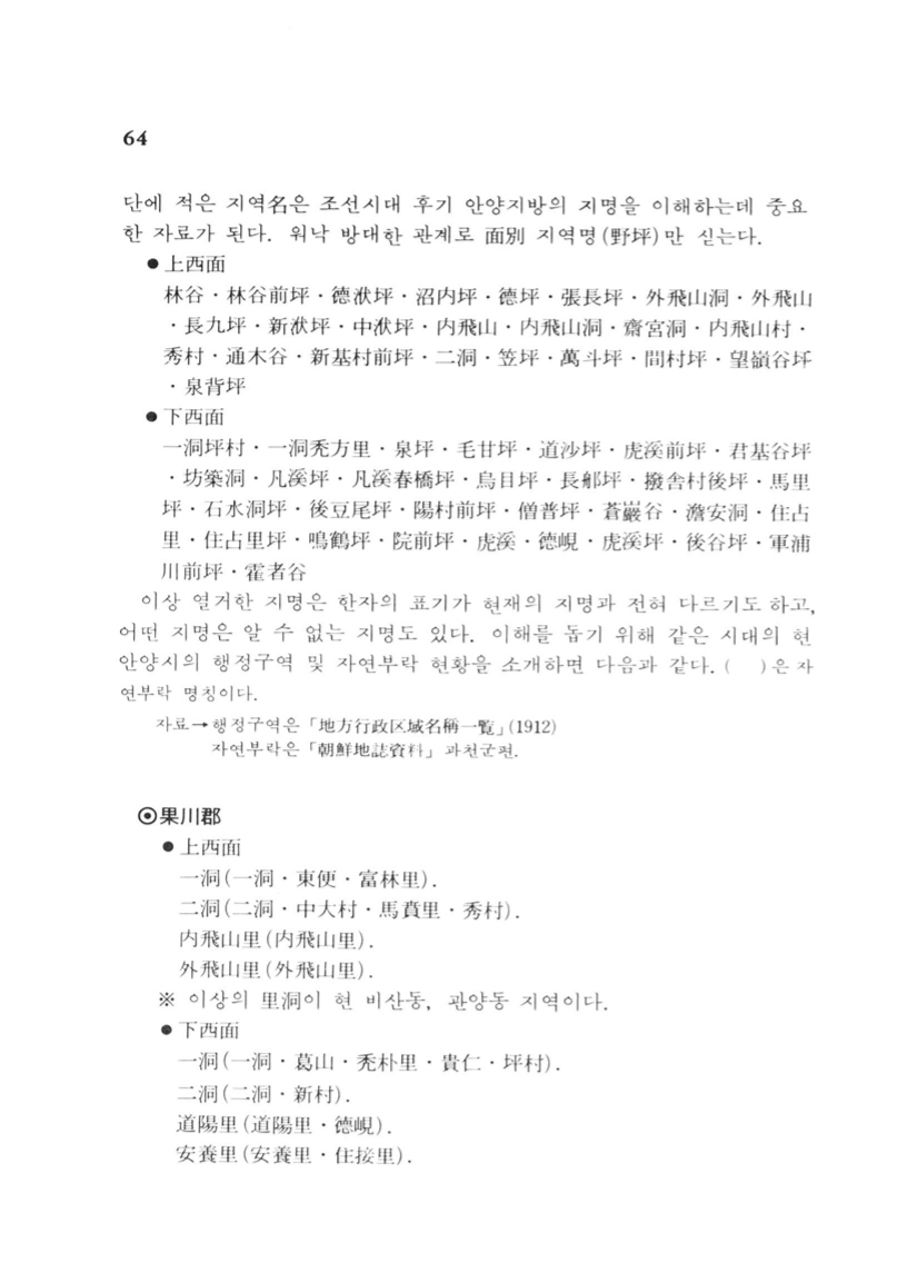 ⓹삼성천을 경계로 하여 서로 다른 행정구역이연서 安養里란 같은 지명을 택했다는 것은 우연이 아닌 필연이었던 것으로 추정되며, 그 주변 일대를 佛心으로 安養世界를 이룩하려고 했던 션조들의 갚은 뜻이 내포되어 있었응을 미루어 짐작할 수가 있기 때문이다.