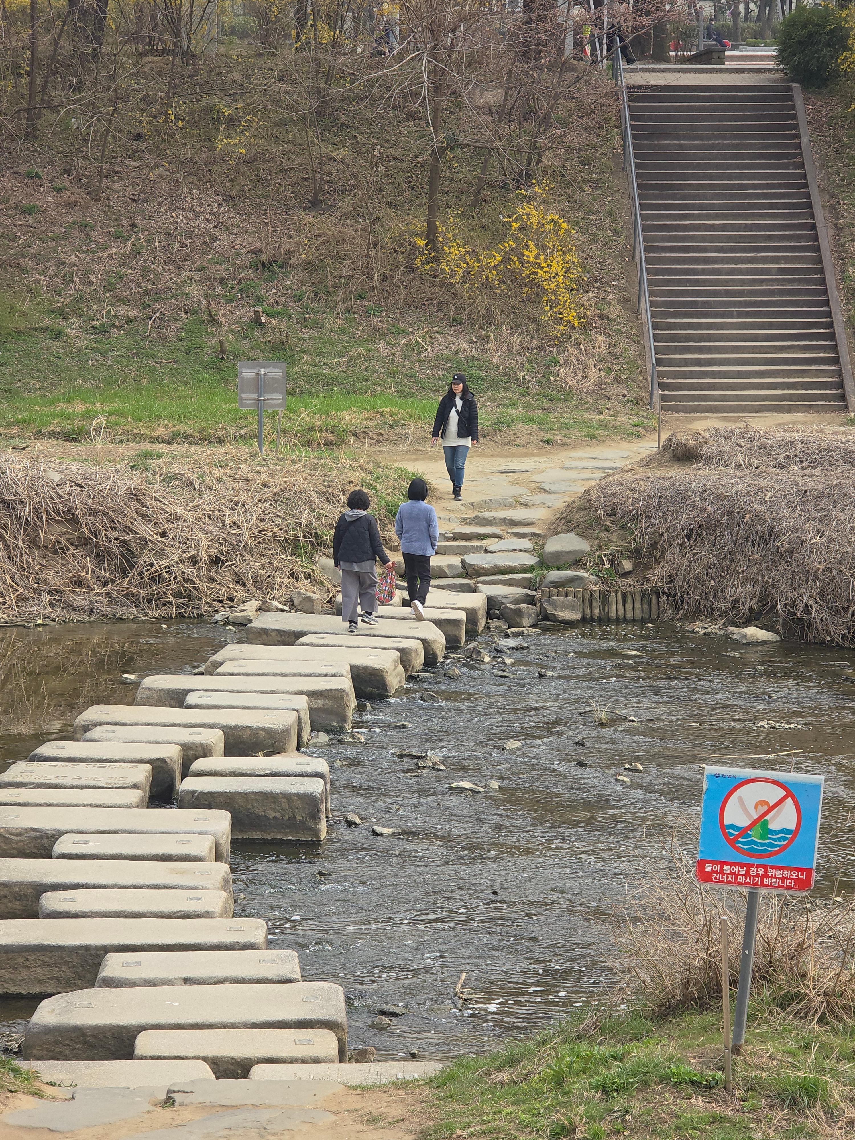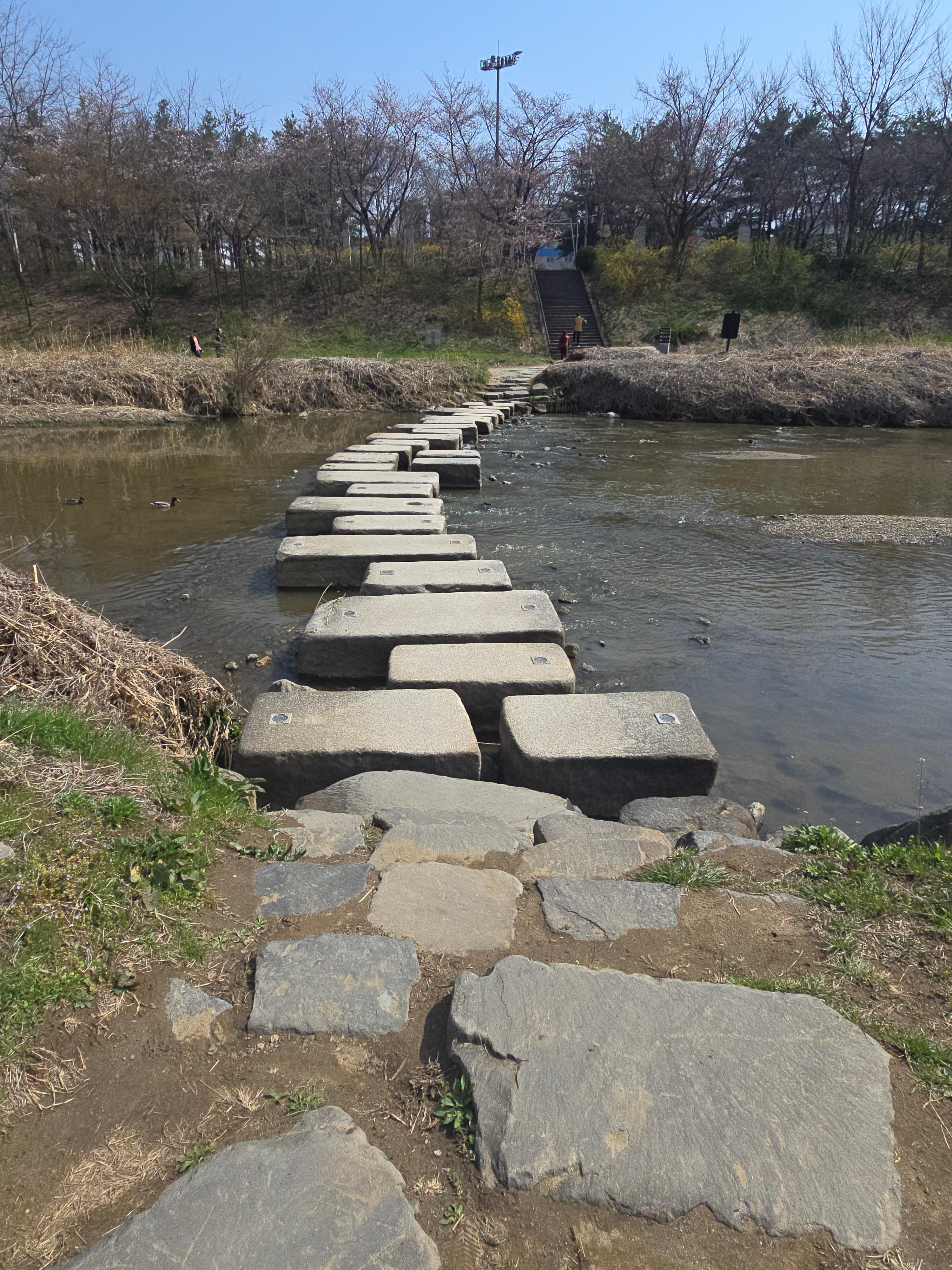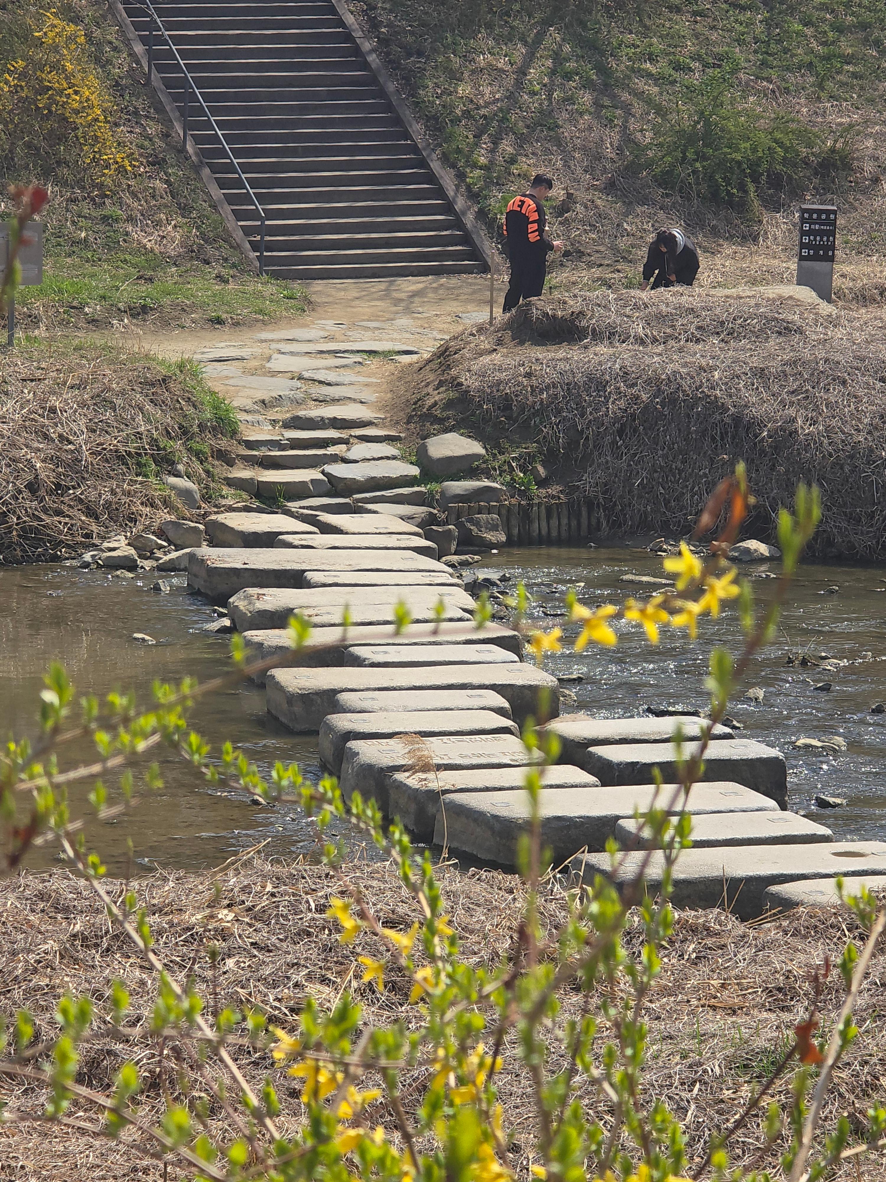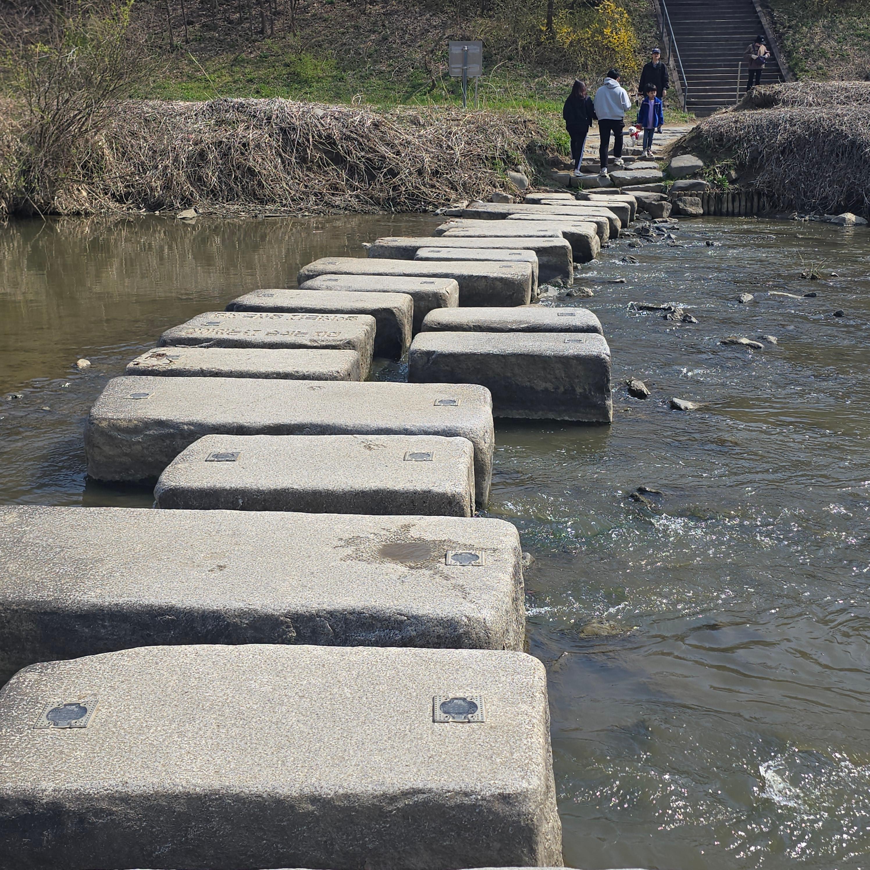 2025.04.06/ #도시기록 #돌다리 #제인구달 #안양 #학의천/ 학운공원 B구역앞에서 비산동 삼거리쪽 건너는 돌다리. 침팬지의 대모로 불리우는 제인 구달 박사가 한국을 방문했던 지난 2004년 11월 9일 안양 학의천을 찾아 이 돌다리에서 하천 생태를 살펴보고 물고기도 방사했었다.