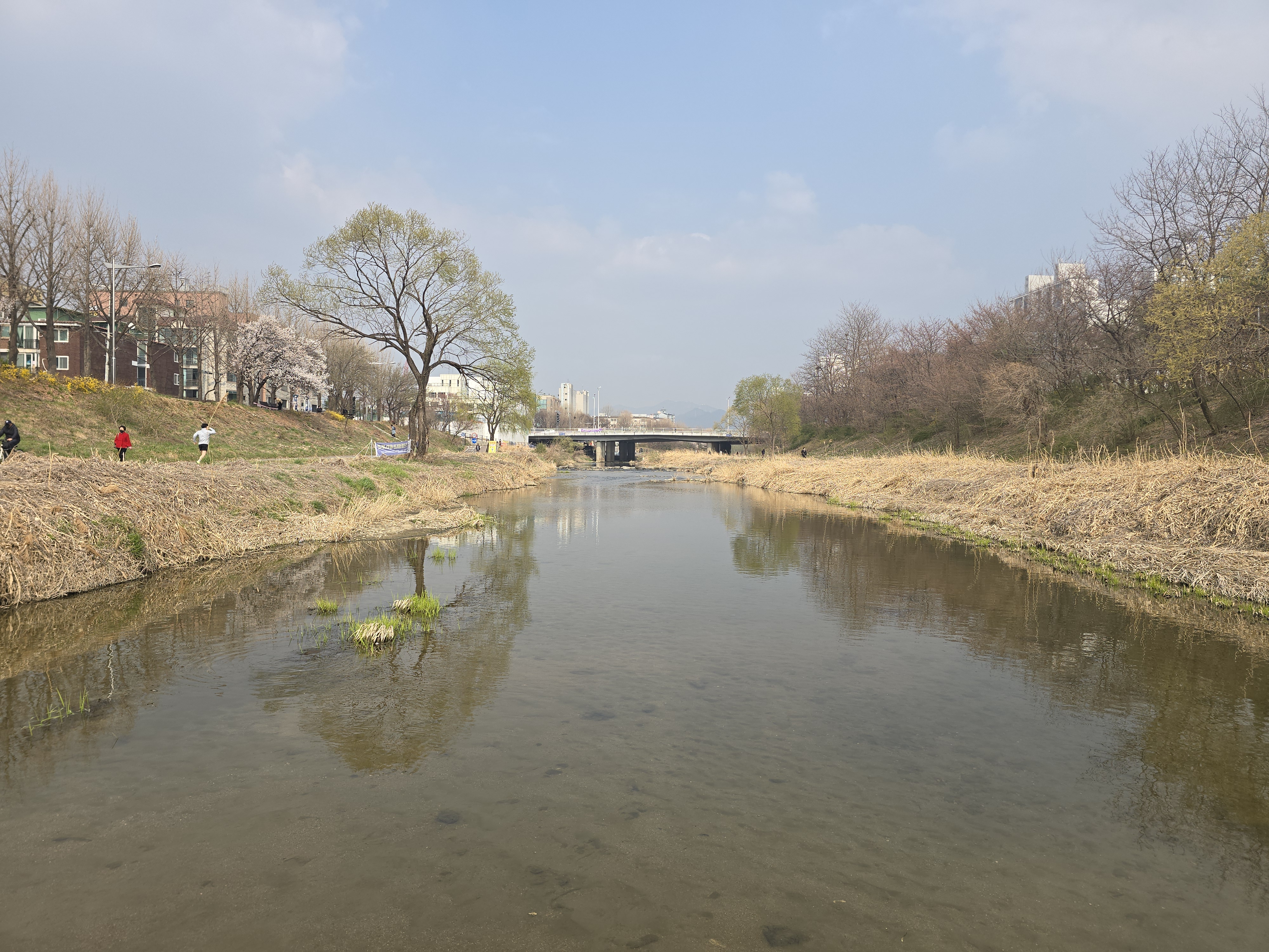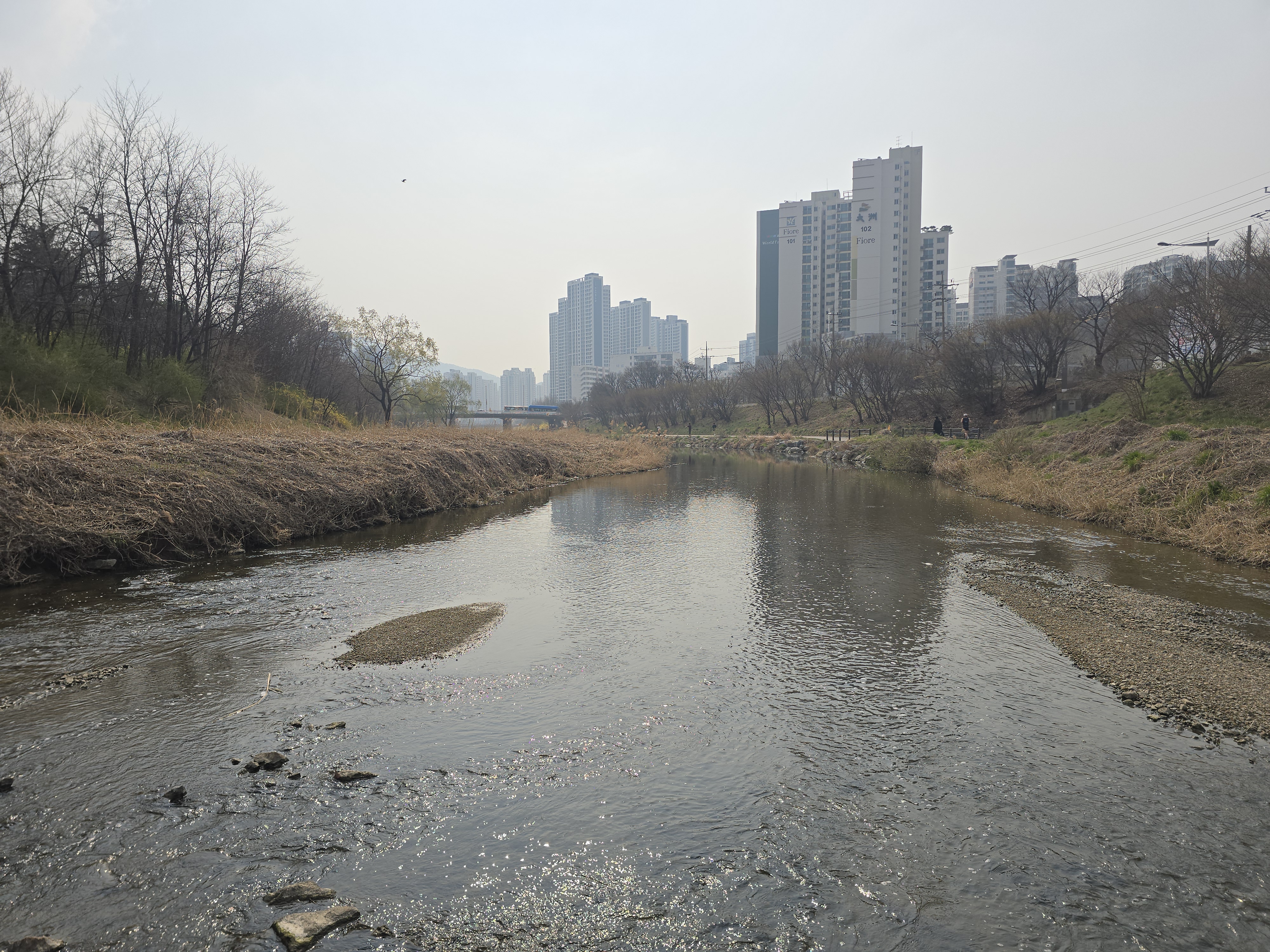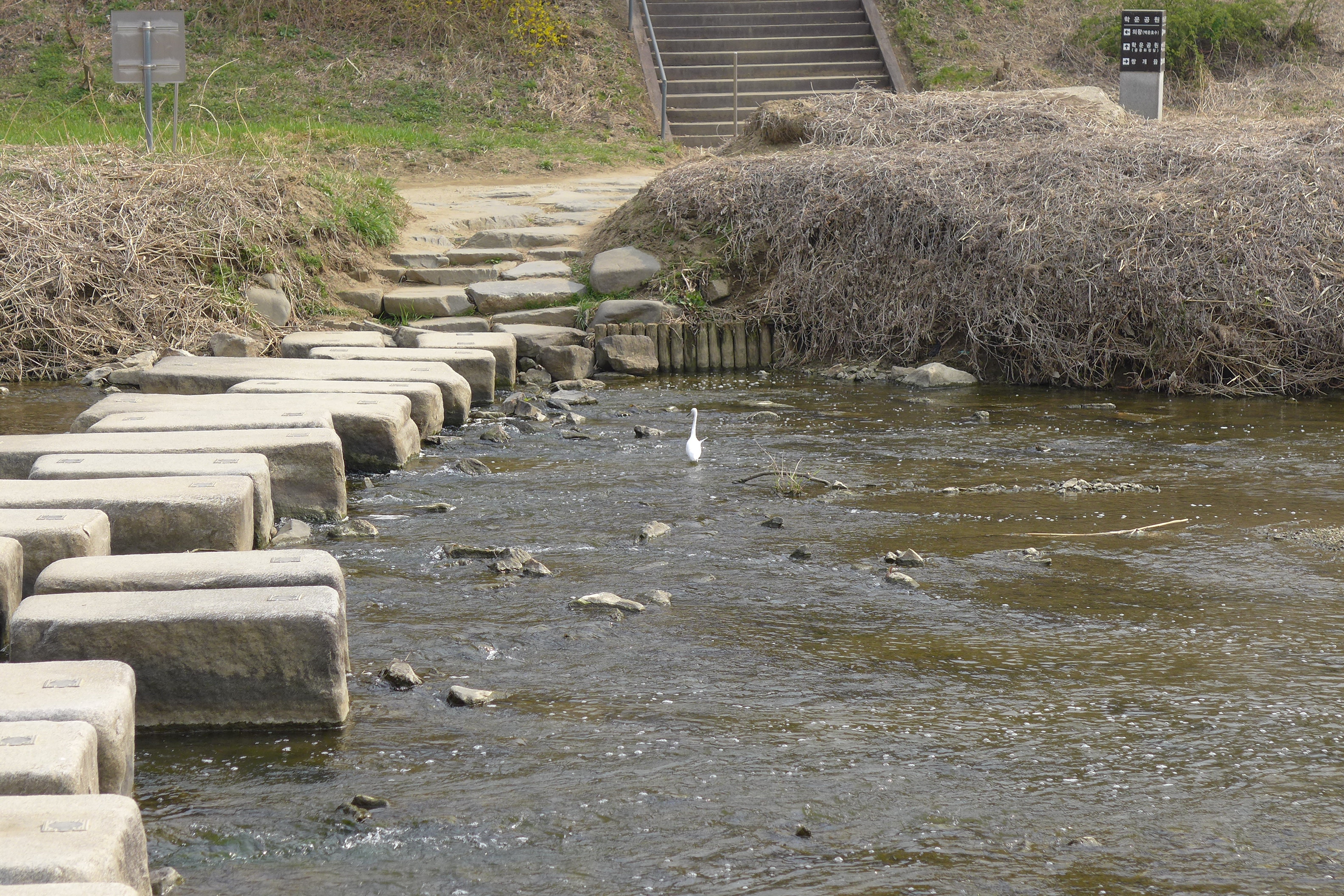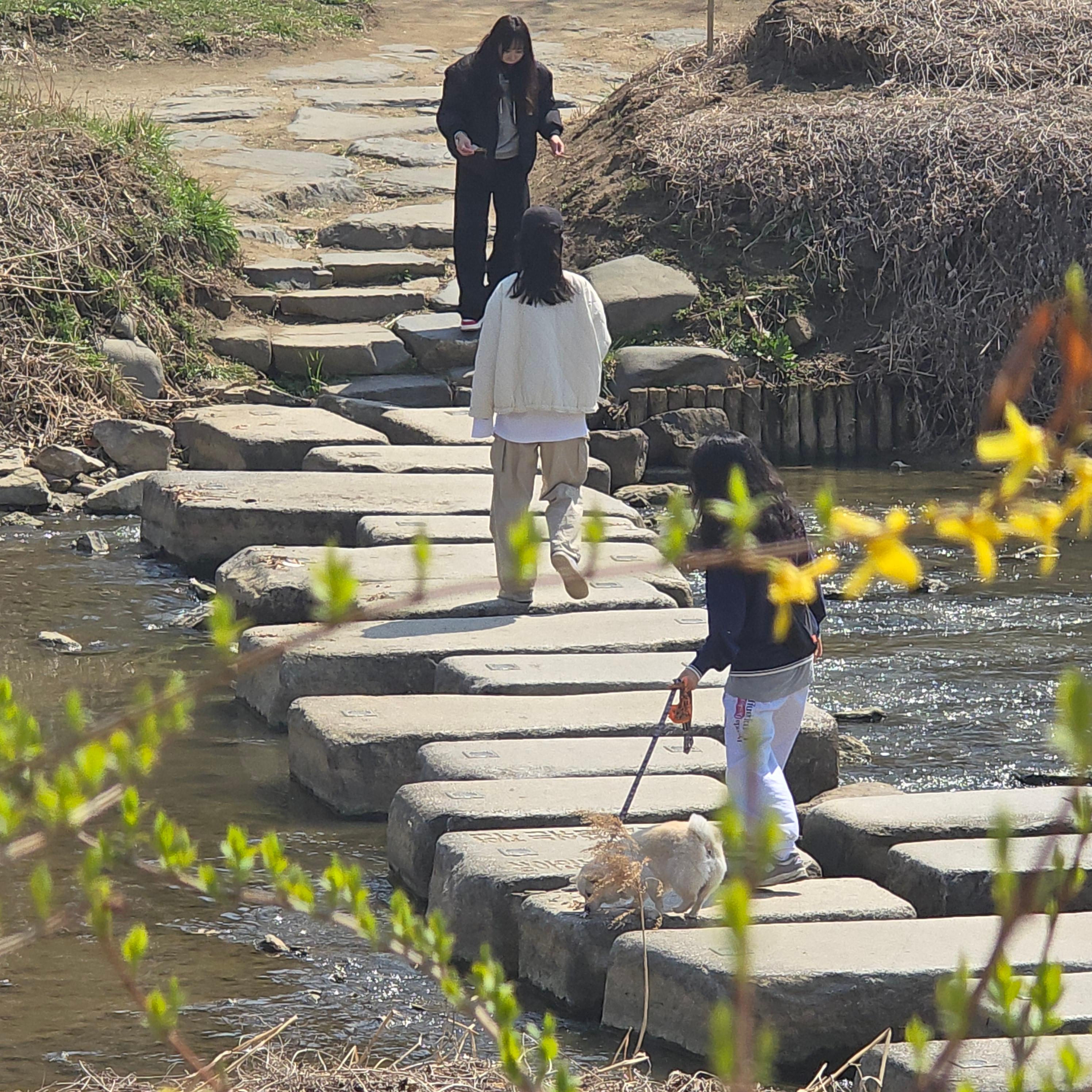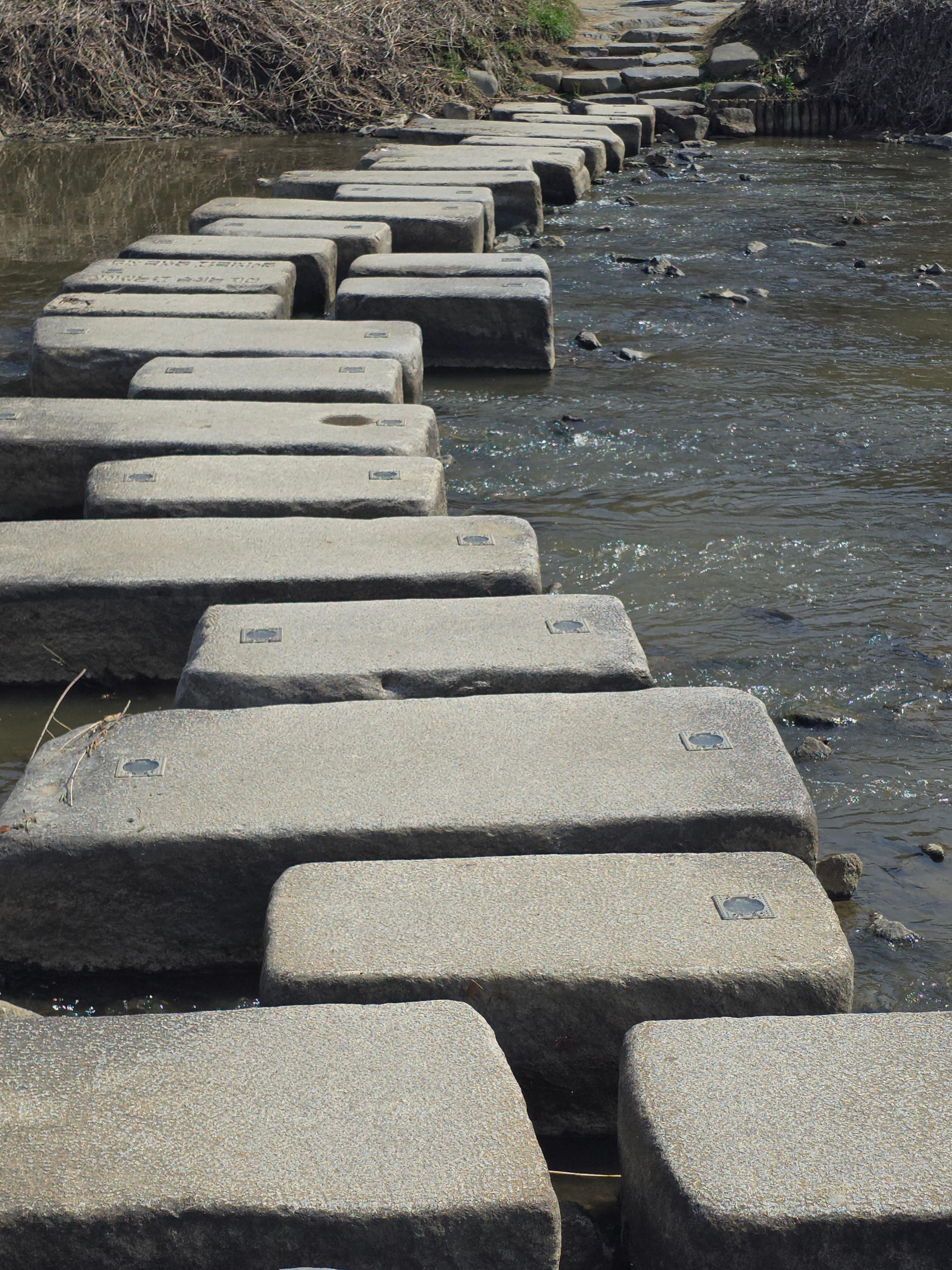 2025.04.06/ #도시기록 #돌다리 #제인구달 #안양 #학의천/ 학운공원 B구역앞에서 비산동 삼거리쪽 건너는 돌다리. 침팬지의 대모로 불리우는 제인 구달 박사가 한국을 방문했던 지난 2004년 11월 9일 안양 학의천을 찾아 이 돌다리에서 하천 생태를 살펴보고 물고기도 방사했었다.