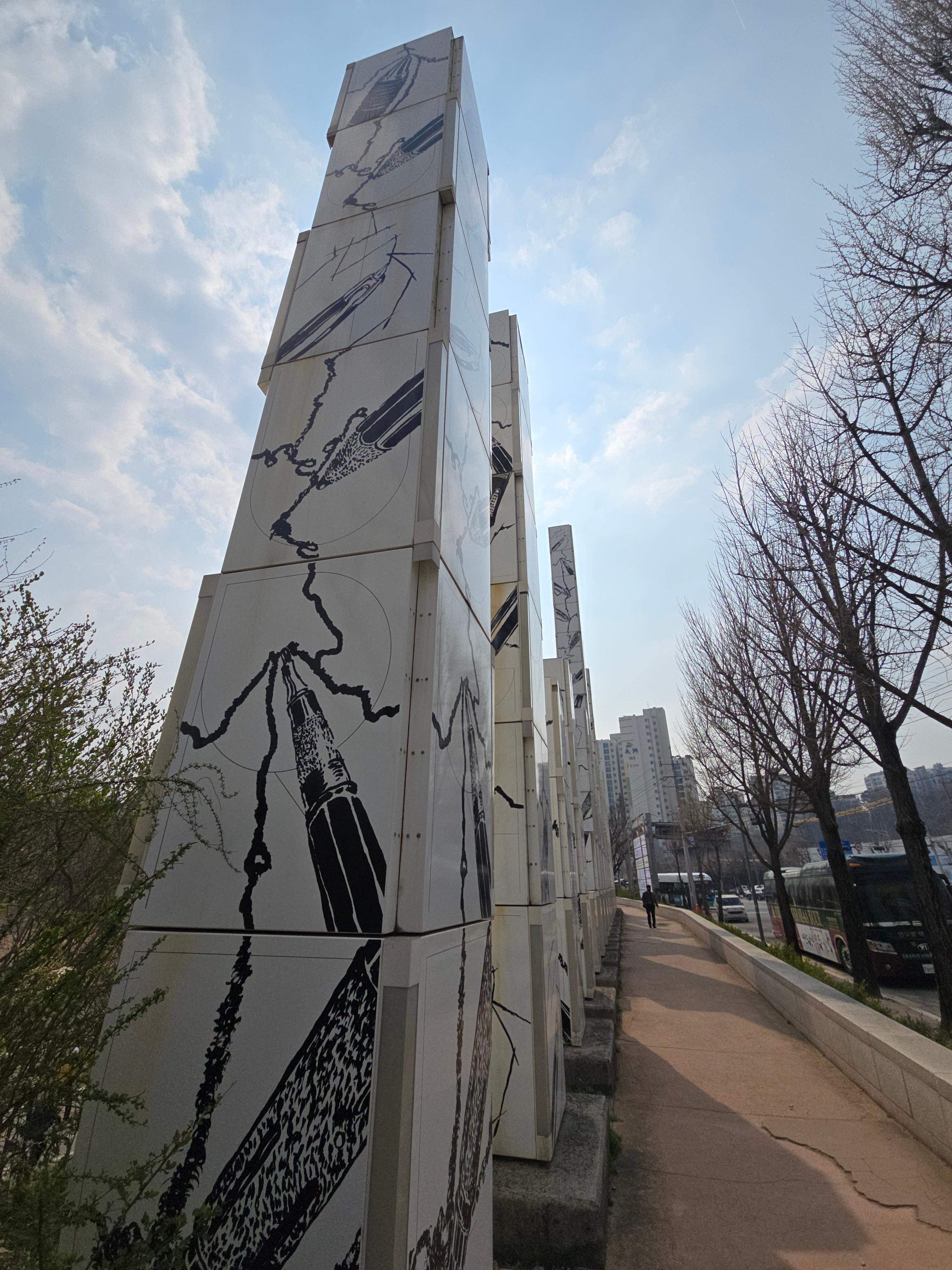 2025.04.03/ #도시기록#안양#공공예술작품#APAP/ 안양 학의천변 비산삼거리 제방에 자리한 apap2007 공공예술작품. 프랑스 디자이너 그룹 M/M파리의 작품으로 안양 비산3동 학의천변 관악로와 개울길 갈림길에 안양시의 홍보문구를 법랑 패널로 만든 높이 1.2~15m크기 광고탑 17개의 작품이다. 확인해 보니 APAP2007에서 가장 비싼 2억5천만원짜리라고 하니 적지않은 시민 혈세가 투입된 고가의 작품이다. 법랑 패널 흰색이 바래고 녹슬고 하는데 관리를 잘했으면 싶다.