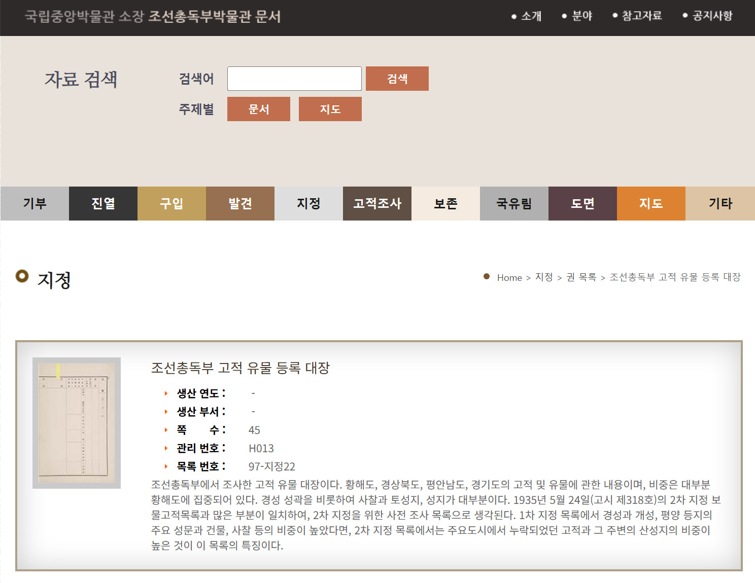 * 이 책은 1916년 이래 조선총독부 고적 및 유물보존 규칙에 등록된 고적 및 유물 193건을 등록대장에 초록된 지방별로 배열해서 참고를 함께 하고 있음.