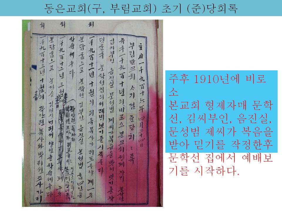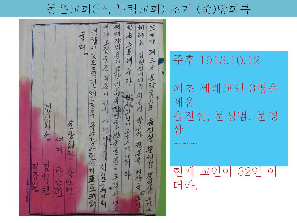 115년전 옛 부림말 교회의 뿌리를 잇는 현 동은교회는 안병인 사무장 등 원로 교인들과 기록의 중요성을 알고 계시는 분들의 관심과 노력으로 발견한 초창기 부림말교회의 당회록, 영수증 등 옛 문건을 잘 보관해왔으며 지금도 교회의 역사와 뿌리찾기 계속하고 있다. PDF자료 작성 및 제공: 안양 동은교회