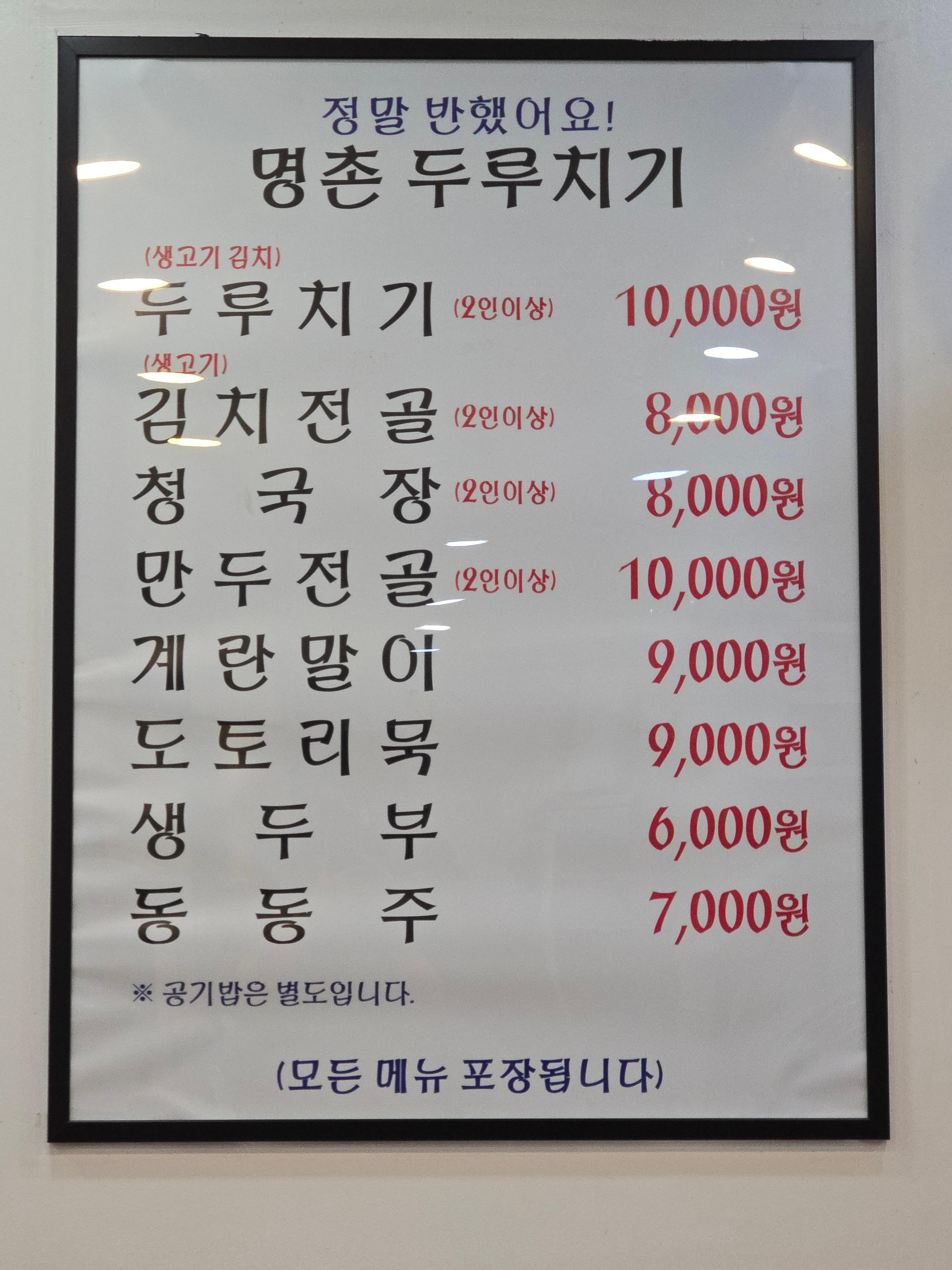 가성비 좋은 명촌의 주메뉴는 두루치기.청국장.생두부 등이다. 과거엔 칼국수가 유명했으나 지금은 메뉴에서 빠졌다, 단체모임 하기 좋은곳으로 주말과 휴일에는 관악산 등산을 마친 단체등산객들로 만원이다.