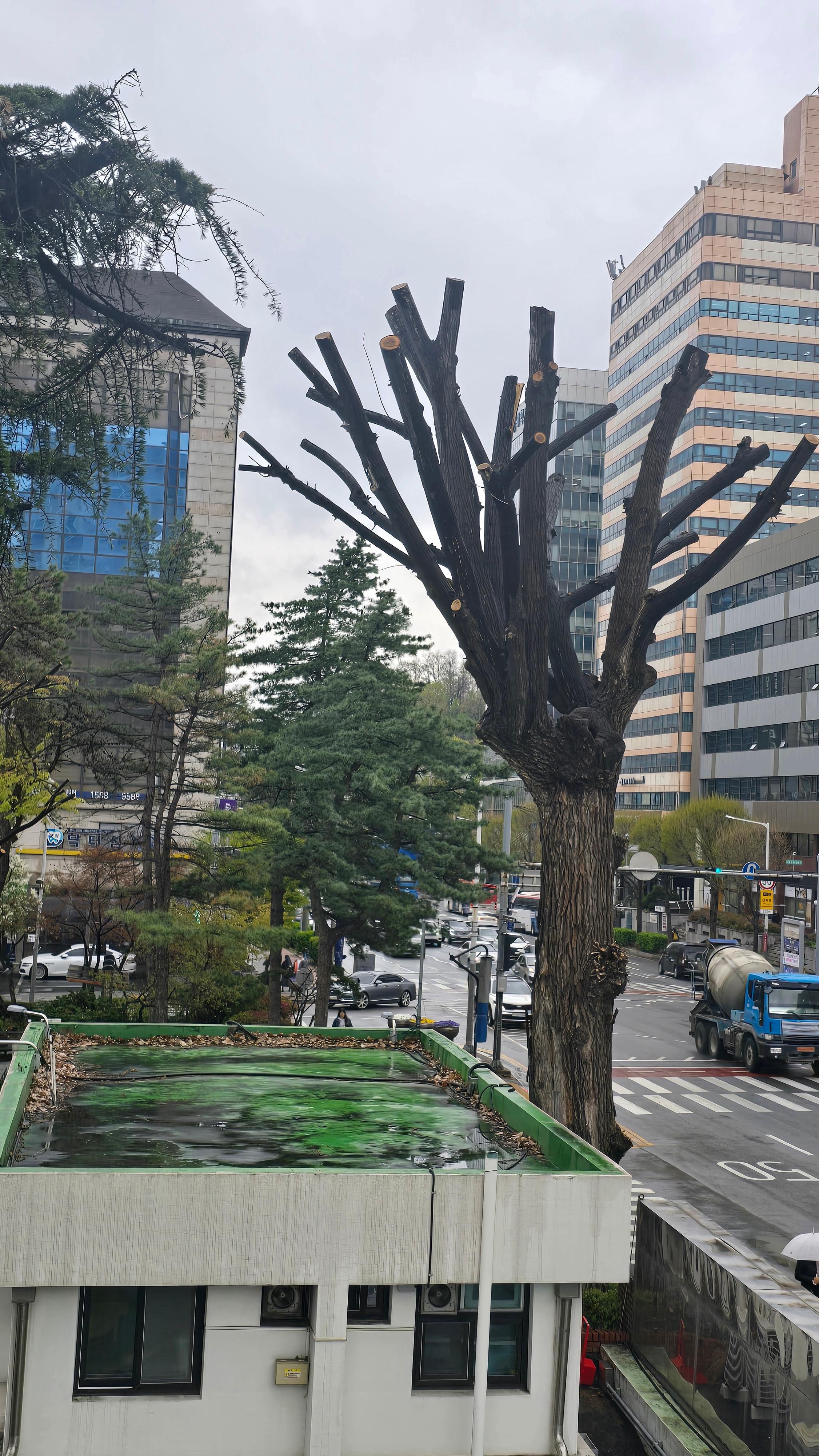 2025.04.15/ #도시기록 #안양 #만안구청 #since1976 / 안양6동 도심에 나무숲이 있는 공간. 지난 겨울 폭설(습설)로 많은 나무들이 눈 무게를 이지지 못하고 가지들이 부러지고 찟겨지는 피해를 입은후 피해 가지 절단과 나무 성장을 이유로 강전정 가지치기를 당하면서 흉칙한 몰골을 하고 있이지만 나무잎이 무성해지는 여름에 녹음과 시원한 그늘을 만들어주는 소중한 공간이다. 이곳 만안구청은 1976년 안양시청사로 개관한 만안구청 정원. 1977년 안양 대홍수 당시 박정희 대통령이 두차레 방문해 현 구청장실에서 피해 현황을 브리핑 받았던 역사가 있는 공간이다.