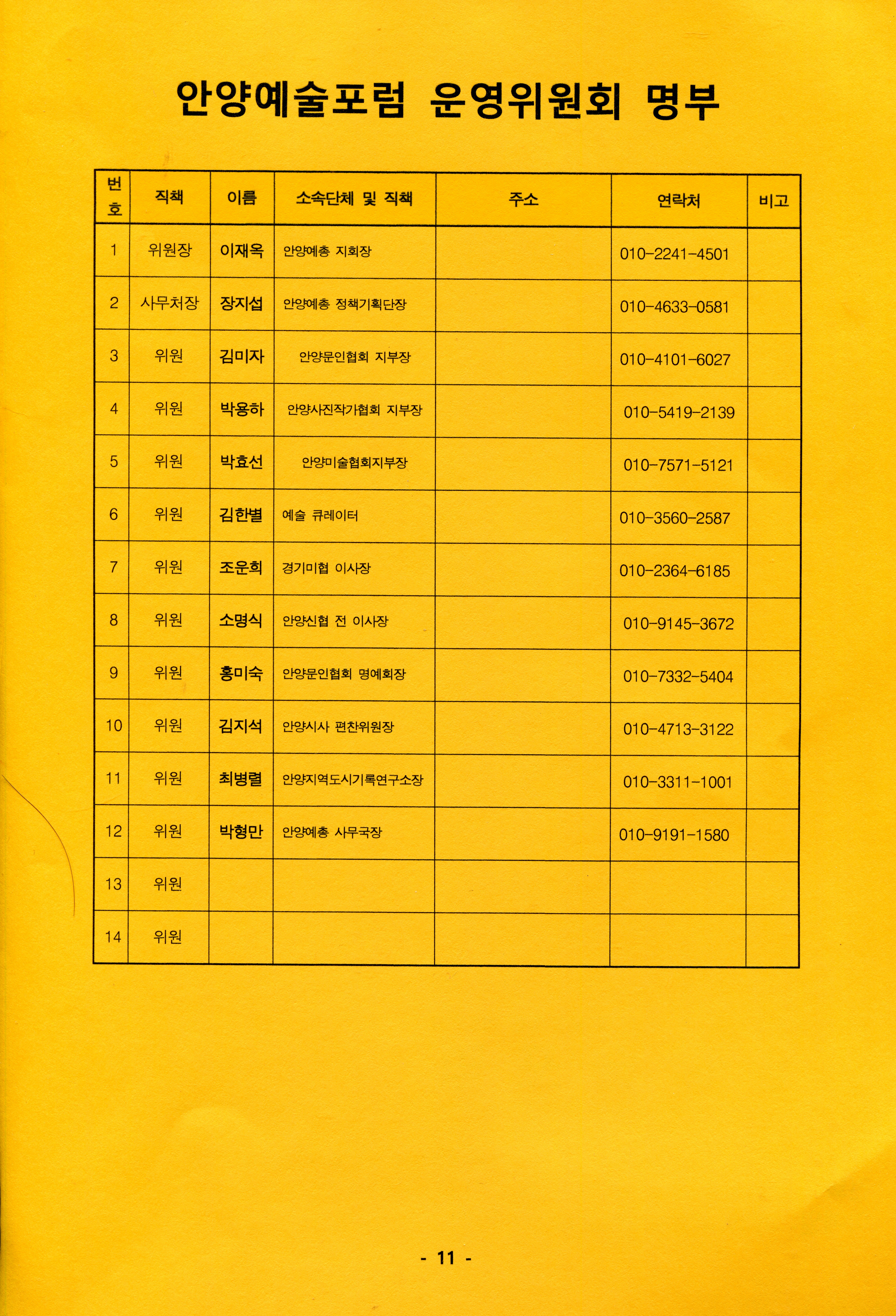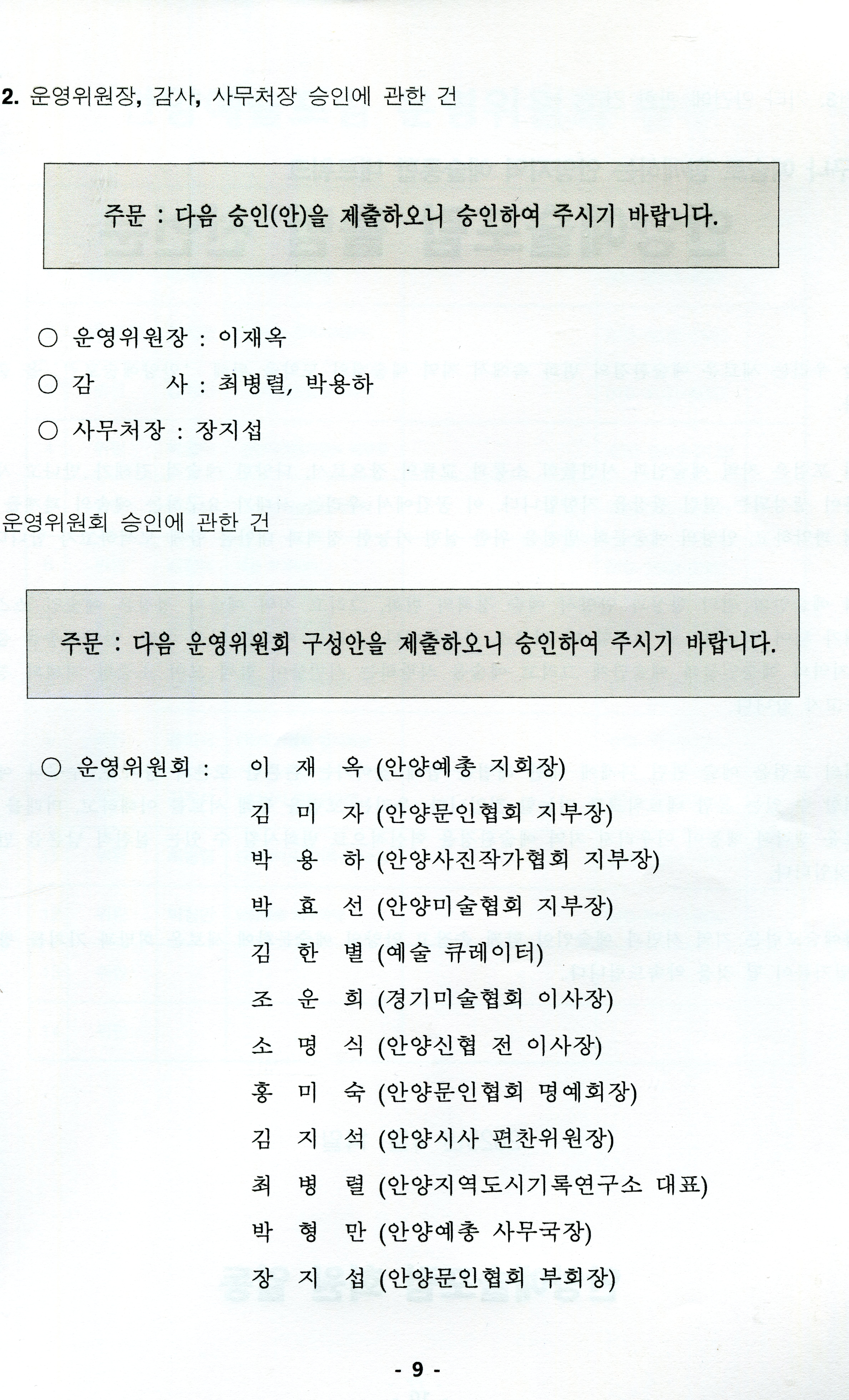 안양예술포럼은 이날 발족식에 앞서 임시총회를 개최하여 당연직 운영위원장으로 이재옥 안양예총 지회장, 감사로 박용하 안양사진작가협회 지부장과 최병렬 안양지역도시기록연구소 대표를, 실무를 총괄할 사무처장에는 장지섭 안양예총 정책기획단 단장을 선출햇다. 또한 운영위원으로는 김미자(안양문인협회 지부장), 김지석(안양시사편찬 선임연구원), 김한별(예술 큐레이터), 박형만(안양예총 사무국장), 박효선(안양미술협회 지부장), 소명식(전 안양신협 이사장), 조운희(경기미술협회 이사장), 홍미숙(안양문인협회 명예회장)을 각각 선임하였다.