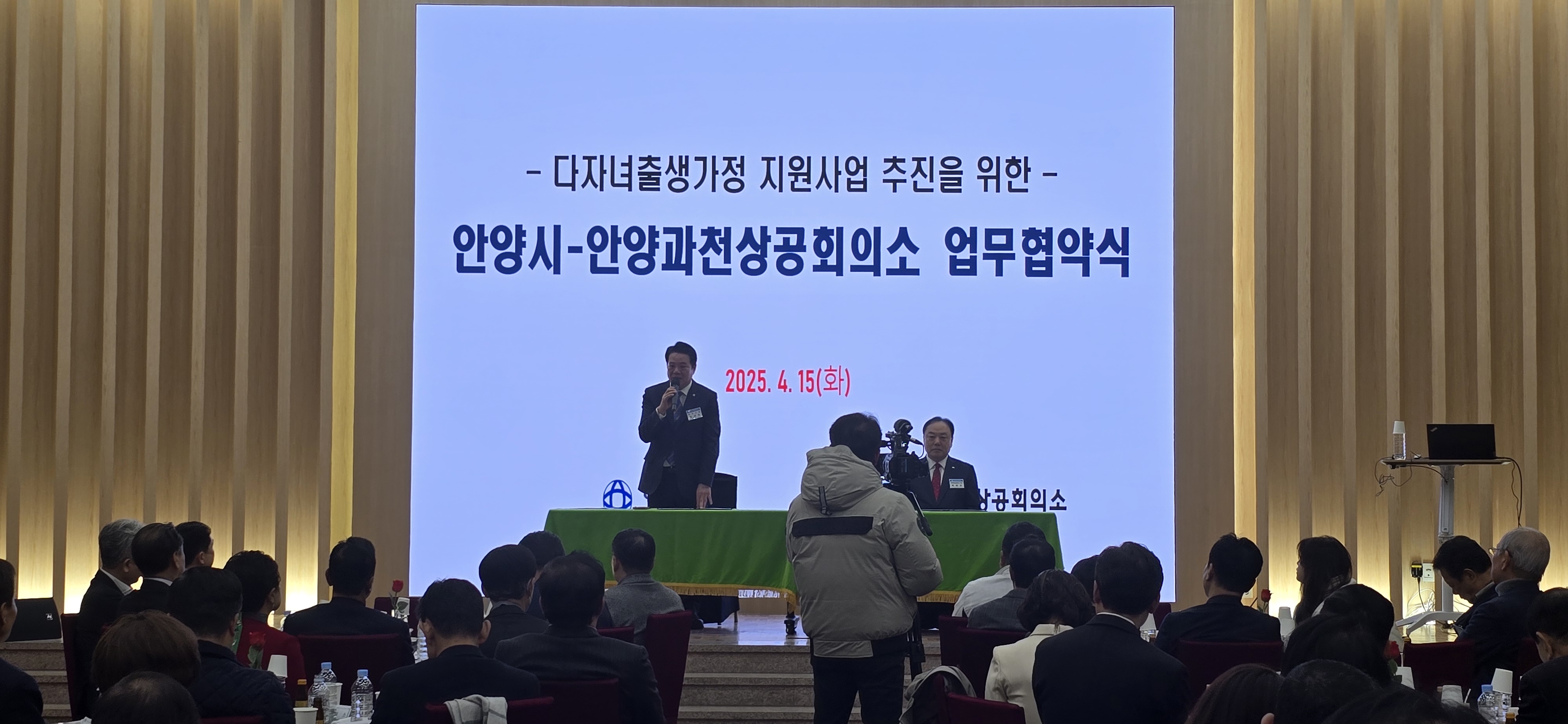 안양시와 안양과천상공회의소는 15일 안양과천상공회의소 강당에서 최대호 안양시장, 배해동 안양과천상공회의소 회장을 비롯한 관내 기업체 대표 등이 참석한 가운데 관내 세쌍둥이 및 다섯째아 이상 출생 가정을 지원하기 위한 '다자녀 출생가정 지원사업 추진 상호협력 업무협약'을 15일 체결했다.